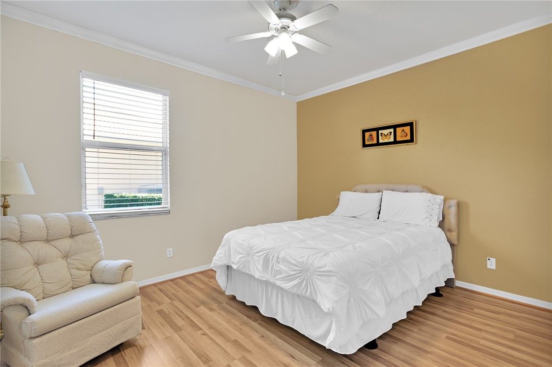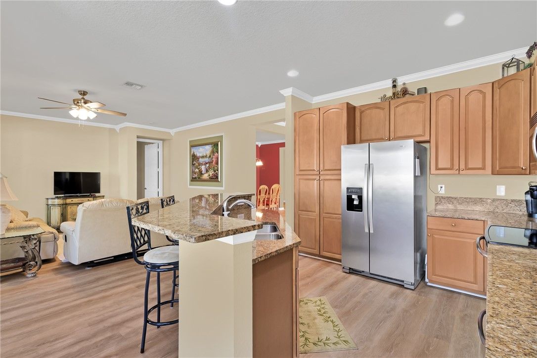 Beautifully built, CBS home with 4 bedrooms/3 baths/2+extended garage. Located in the highly sought after 55+Active Woodfield community. This spacious residence has luxury vinyl flooring/laminate throughout. One of the bedrooms is a private ensuite bedroom with it's own bath-ideal for guests. Impact windows & doors. The extended lanai is perfect for relaxing or entertaining while enjoying Florida living year-round. Clubhouse has a full social calendar, tennis, fitness center, billiards, heated pool & spa. Cable & Internet is included in the HOA plus much more. Close to Vero's great beaches.