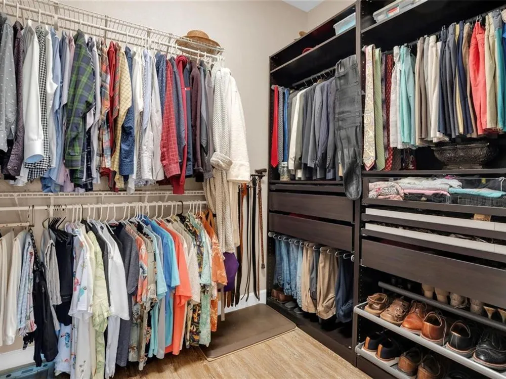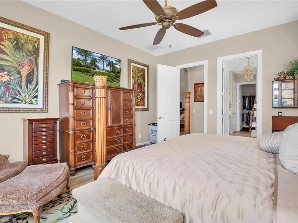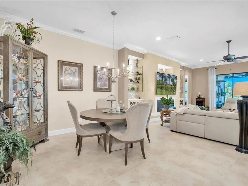 - Ceiling Fan(s), Crown Molding, Eat-in Kitchen, High Ceilings, Kitchen/Family Room Combo, Living/Dining Room, Open Floorplan, Main Level Primary, Solid Surface Counters, Solid-Wood Cabinets, Split Bedrooms, Stone Counters, Thermostat, Walk-In Closet(s)