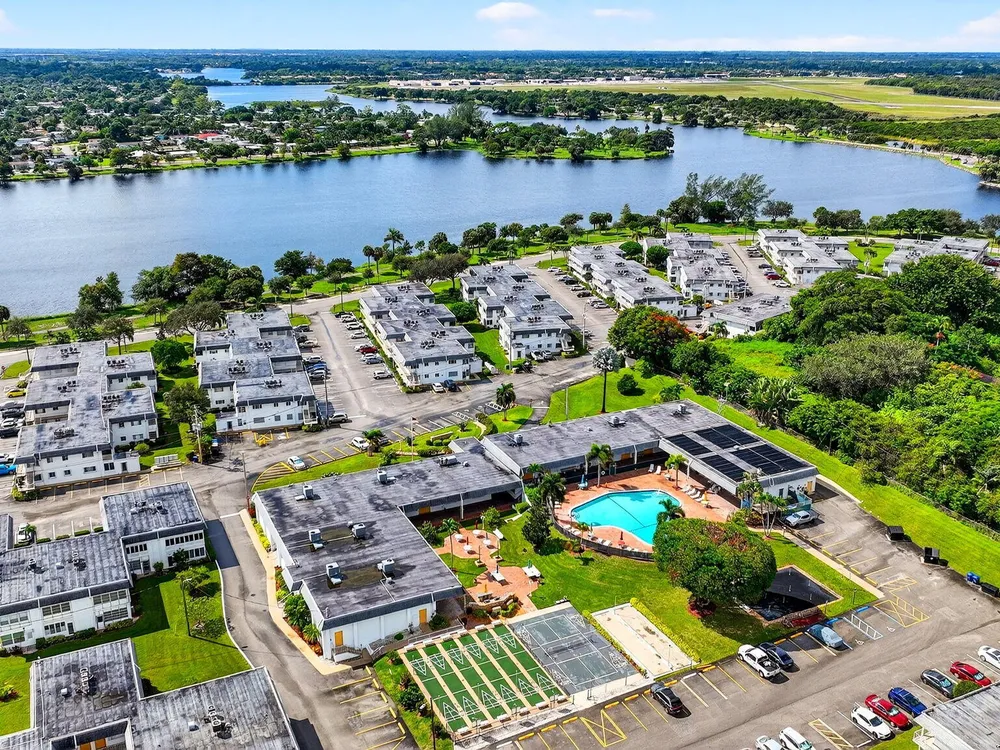 This is a jewel 1 bedroom condo in a well-run, financially stable 55+ complex. Live the Lake Osborne lifestyle. View of lake from living room windows. Close to everything....95 freeway, cute downtown Lake Worth Beach, ocean is 8 min away. Just 15 min to downtown WPB and Delray Beach for more restaurants/shopping. First floor convenience. Parking space just feet away from front door. New luxury vinyl & ceramic tile flooring throughout! AC & Water Heater brand new. Fully furnished. Artwork negotiable. You will love living here! Many amenities included with low HOA....gigantic pool, 2 gyms, community room, library, BBQ/picnic area, Craft room, Auditorium showing first rate movies on Saturdays, pickleball, bocce ball, shuffleboard, etc. Grab this one while it's hot! 700+ credit score. No pets