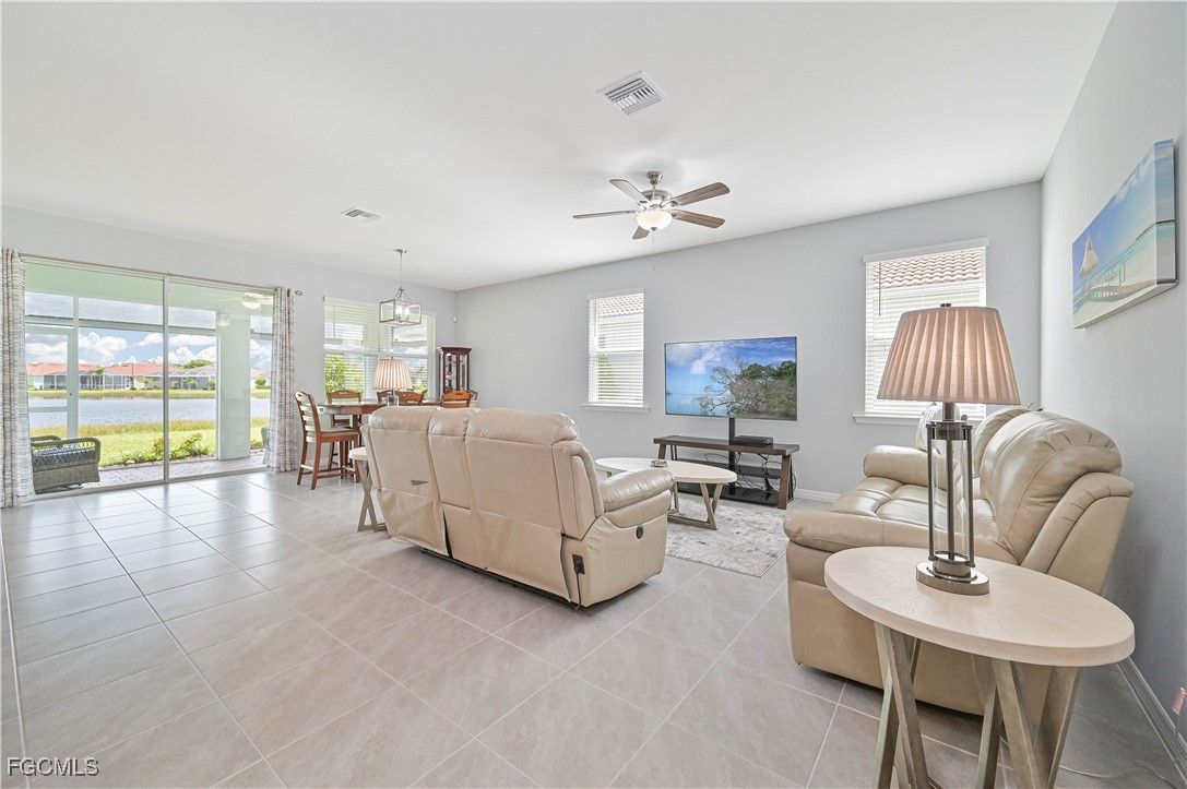 Welcome to your dream home in the beautiful Cascades, a Fabulous 55+ community! This stunning, FURNISHED single family home boasts 2 bedrooms, 2 bathrooms, and a spacious office with beautiful French doors, perfect for those looking for a comfortable and luxurious living space. The home features granite counters, stainless steel appliances, and 8 ft doors for a touch of elegance. The dream kitchen is equipped with a wrapped island, backsplash, 42-inch cabinets, and a walk-in pantry for all your storage needs. Enjoy breathtaking views of the long lake from your backyard, complete with a surge protector and storm smart screen for added protection during storm season. This home comes fully furnished, making it easy for you to move right in and start enjoying all the amenities this community has to offer. With a low HOA fee that covers lawn care, resort-style pool and spa, fitness center, pickleball, bocce and tennis courts, as well as cable and internet, you'll have everything you need for a comfortable and active lifestyle. Don't miss out on this opportunity to live in paradise!