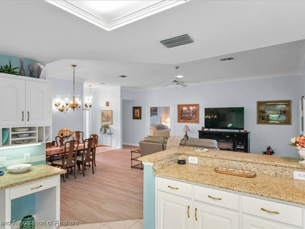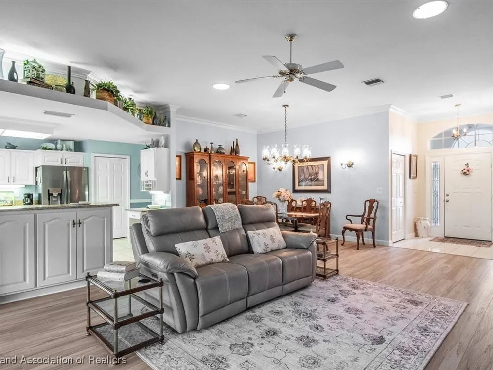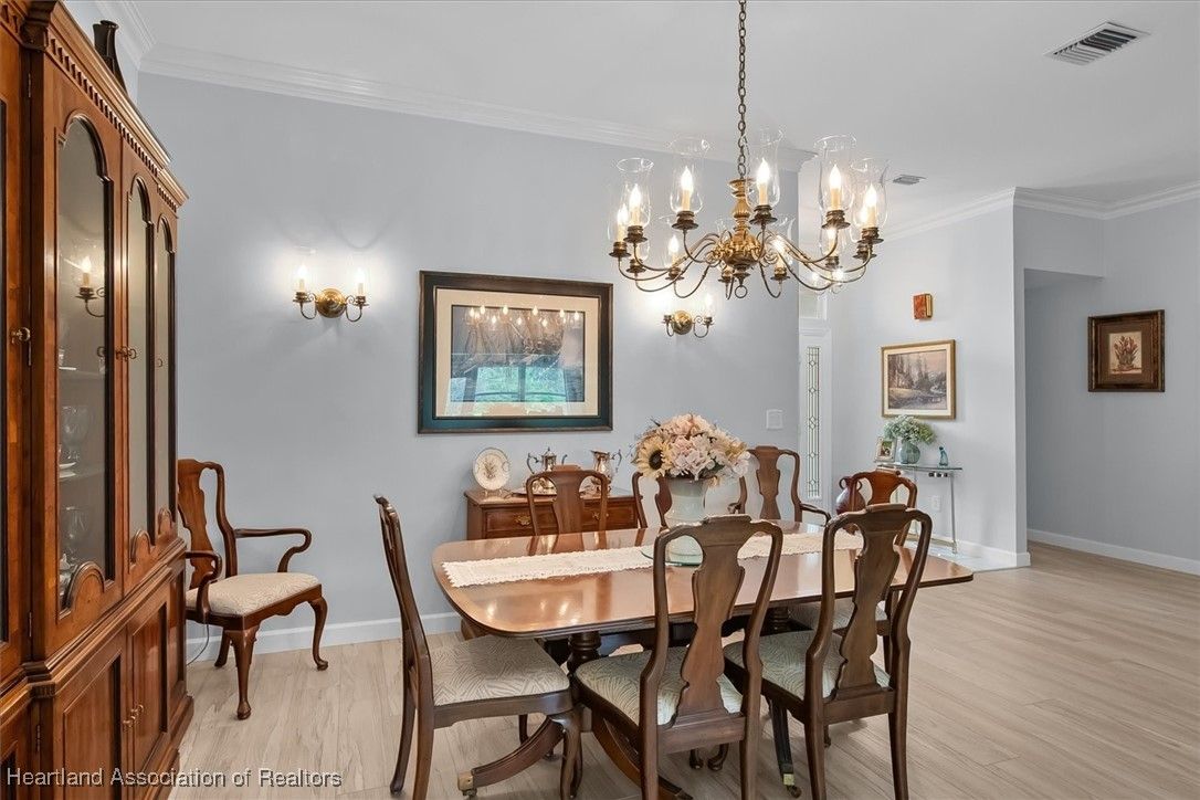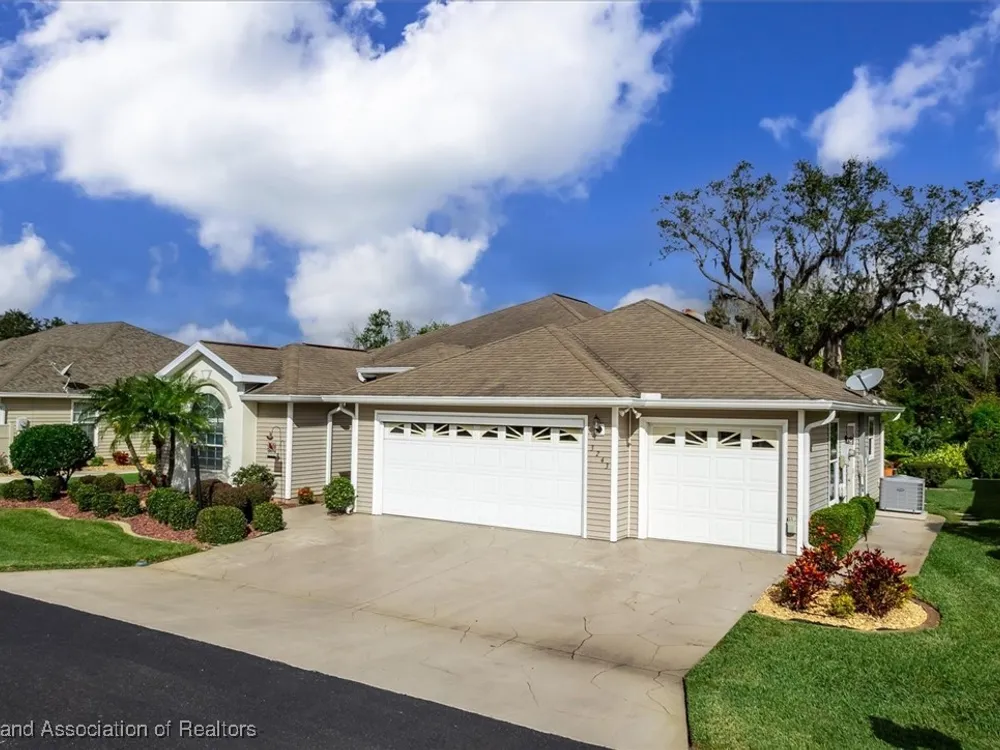 This "LARGER THAN IT LOOKS" 3 bedroom, 2.5 bath, oversized 2-car + golf cart garage home is situated overlooking the Highlands Ridge golf course. Inside, you'll instantly notice not only the spaciousness of this home, but how very well-maintained it is. The open floor plan with high ceilings, crown molding & newer vinyl plank flooring add to its luxurious feel. The large white kitchen with breakfast nook, pantry, built-in desk & newer LG stainless steel appliances is completely open to the living, dining & family room; all providing beautiful views of the backyard garden & golf course beyond. The primary suite features a cove ceiling, walk-in closet & bathroom with large corner shower, double sink vanity & separate makeup counter. There are two nice size guest bedrooms, one with double pocket entry doors, the other with 3 closets. The huge inside laundry room has a sink, an abundance of cabinets for storage, a desk/office area, plus a half bath. This beautiful home has so much to offer. It is located in the friendly & active 55+ community of Highlands Ridge, with a golf course, community pools, tennis, pickleball, clubhouse & restaurant.