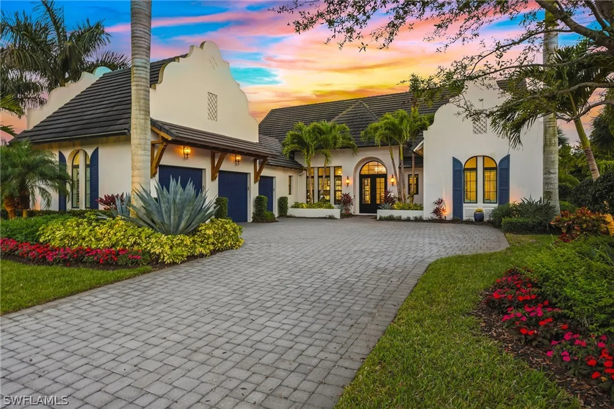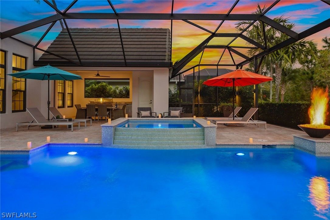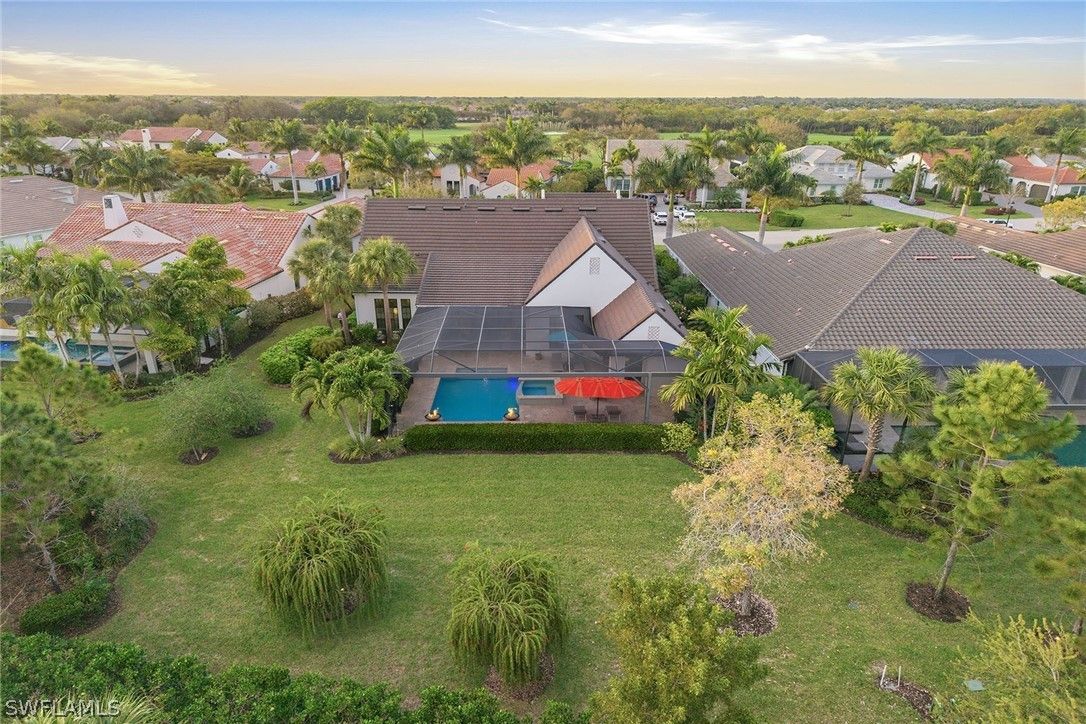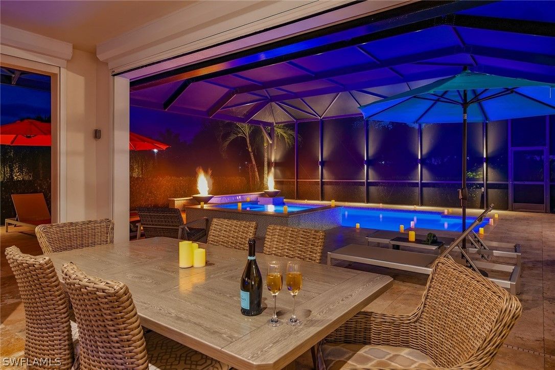 Surrounded by lush tropical landscaping on a nearly half-acre home site, this stunning designer-furnished residence in the desirable Marsh Cove village of Fiddler’s Creek offers exceptional privacy, desired southern exposure and luxury indoor-outdoor living at its finest. Built in 2018 and showcasing the sought-after Pontevedra open floor plan, the home offers four bedrooms plus a den, five baths and nearly 3,600 square feet of thoughtfully designed living space, complemented by a spacious three-car garage and expansive outdoor living areas. From the moment you enter through metal and glass French doors with a transom window, refined finishes and architectural details set the tone, including wood-look porcelain plank tile flooring throughout, volume and vaulted ceilings, recessed LED lighting and plantation shutters. Designed to capture natural light and seamless flow to the outdoors, the main living areas open to a spectacular private lanai retreat framed by mature tropical landscaping and a large backyard. The outdoor living area features natural stone pavers, a heated pool and spa with spillover, decorative fire bowls and fountain, and a picture-frame pool cage maximizing tranquil garden views. Two covered lanai spaces provide inviting areas for relaxing or entertaining and are enhanced by a gas fireplace and lighted pool cage columns, while the summer kitchen includes a stainless gas grill, cooktop and under-counter refrigerator. Additional outdoor features include a poolside bath, electric storm shutters enclosing both lanai areas, and with impact glass throughout. The chef’s kitchen is beautifully appointed with quartz counters, natural stone tile backsplash, center island, white cabinetry with under-cabinet lighting and pullout pantry shelving, and premium appliances including a six-burner natural gas range with griddle. The dining area features custom built-in cabinetry with accent lighting and views of the pool and lanai, while the spacious living area offers a built-in entertainment center, dry bar with under-counter wine refrigerator and sliding glass doors opening to the outdoor living space. The private primary suite includes a sitting area, plantation shutters and direct lanai access, while the luxurious bath offers dual quartz vanities, a freestanding soaking tub, frameless glass walk-in shower with dual shower heads and a large custom walk-in closet. Guest accommodations include two bedrooms connected by a Jack-and-Jill bath and a separate guest suite with en-suite bath and walk-in closet, while the den with built-in desks and cabinetry provides an ideal home office. Additional highlights include a custom wine bar with two wine refrigerators, tankless water heater and a three-car garage with epoxy flooring and built-in storage. Residents enjoy Fiddler’s Creek’s resort-style amenities including pools, dining, tennis, fitness, pickleball and spa services with optional memberships available for golf, marina and beach club access.