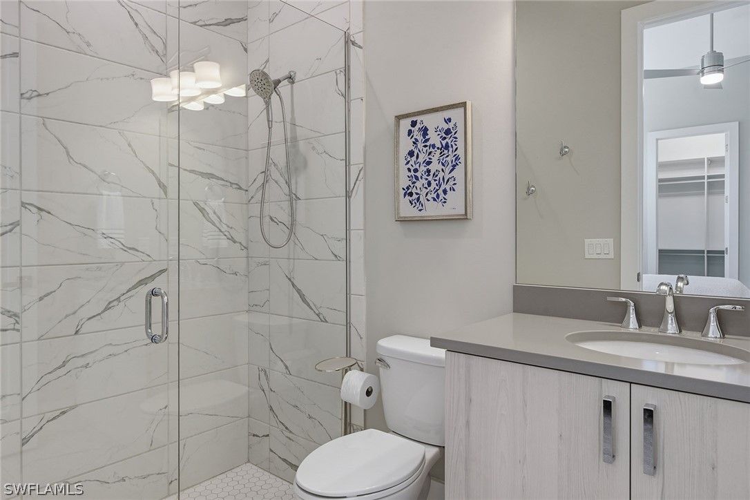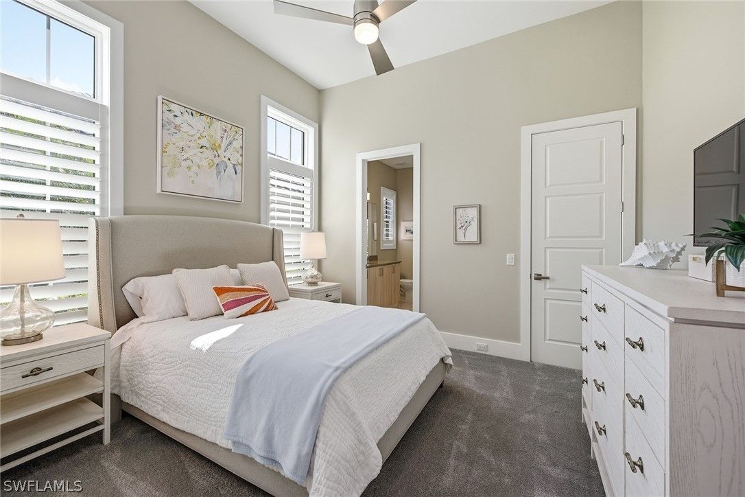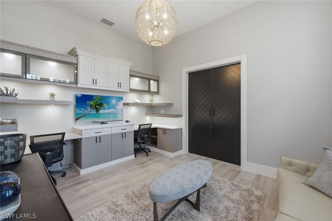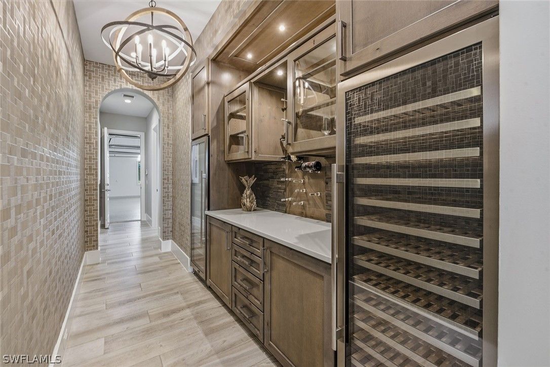 Surrounded by lush tropical landscaping on a nearly half-acre home site, this stunning designer-furnished residence in the desirable Marsh Cove village of Fiddler’s Creek offers exceptional privacy, desired southern exposure and luxury indoor-outdoor living at its finest. Built in 2018 and showcasing the sought-after Pontevedra open floor plan, the home offers four bedrooms plus a den, five baths and nearly 3,600 square feet of thoughtfully designed living space, complemented by a spacious three-car garage and expansive outdoor living areas. From the moment you enter through metal and glass French doors with a transom window, refined finishes and architectural details set the tone, including wood-look porcelain plank tile flooring throughout, volume and vaulted ceilings, recessed LED lighting and plantation shutters. Designed to capture natural light and seamless flow to the outdoors, the main living areas open to a spectacular private lanai retreat framed by mature tropical landscaping and a large backyard. The outdoor living area features natural stone pavers, a heated pool and spa with spillover, decorative fire bowls and fountain, and a picture-frame pool cage maximizing tranquil garden views. Two covered lanai spaces provide inviting areas for relaxing or entertaining and are enhanced by a gas fireplace and lighted pool cage columns, while the summer kitchen includes a stainless gas grill, cooktop and under-counter refrigerator. Additional outdoor features include a poolside bath, electric storm shutters enclosing both lanai areas, and with impact glass throughout. The chef’s kitchen is beautifully appointed with quartz counters, natural stone tile backsplash, center island, white cabinetry with under-cabinet lighting and pullout pantry shelving, and premium appliances including a six-burner natural gas range with griddle. The dining area features custom built-in cabinetry with accent lighting and views of the pool and lanai, while the spacious living area offers a built-in entertainment center, dry bar with under-counter wine refrigerator and sliding glass doors opening to the outdoor living space. The private primary suite includes a sitting area, plantation shutters and direct lanai access, while the luxurious bath offers dual quartz vanities, a freestanding soaking tub, frameless glass walk-in shower with dual shower heads and a large custom walk-in closet. Guest accommodations include two bedrooms connected by a Jack-and-Jill bath and a separate guest suite with en-suite bath and walk-in closet, while the den with built-in desks and cabinetry provides an ideal home office. Additional highlights include a custom wine bar with two wine refrigerators, tankless water heater and a three-car garage with epoxy flooring and built-in storage. Residents enjoy Fiddler’s Creek’s resort-style amenities including pools, dining, tennis, fitness, pickleball and spa services with optional memberships available for golf, marina and beach club access.