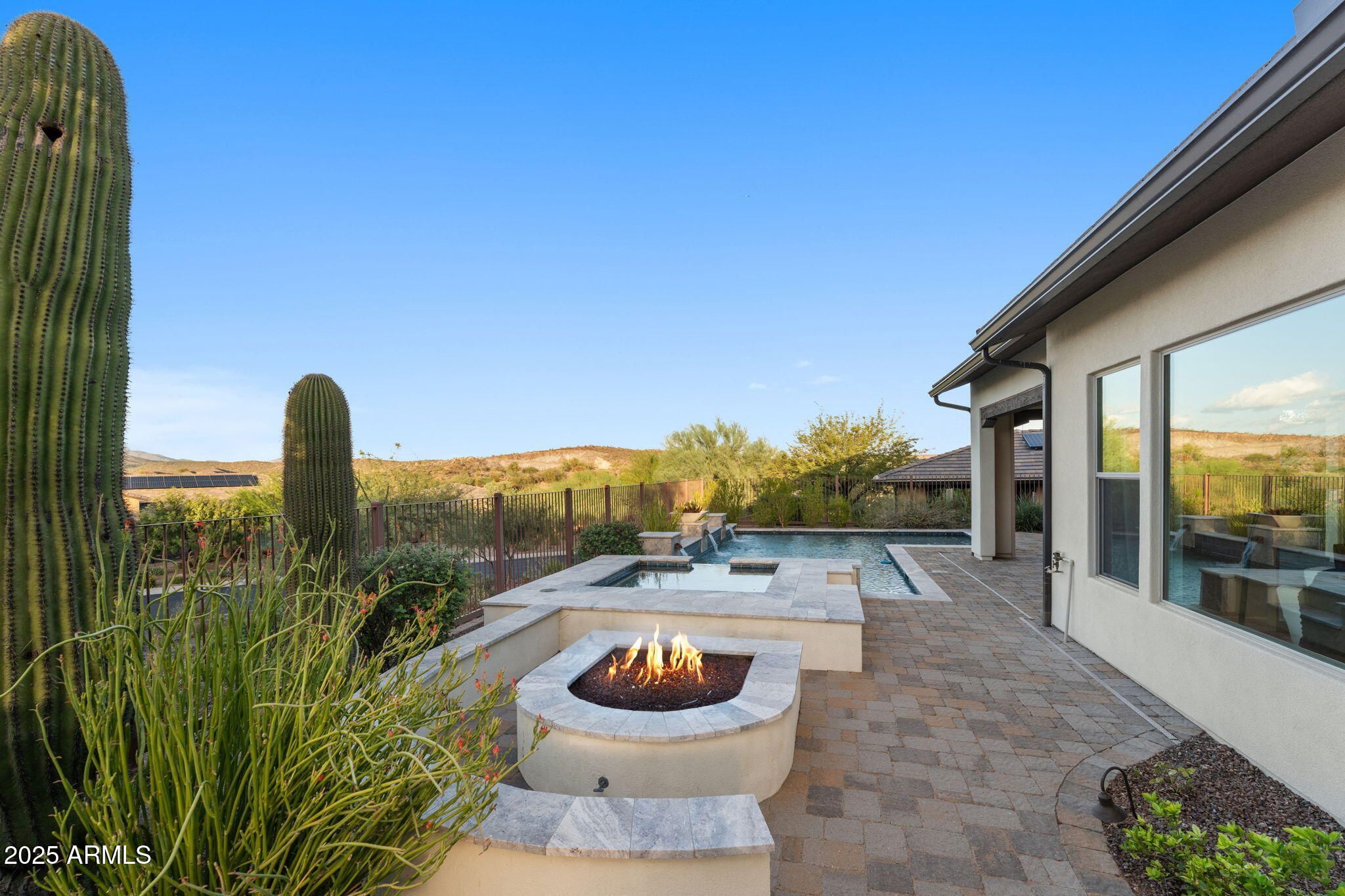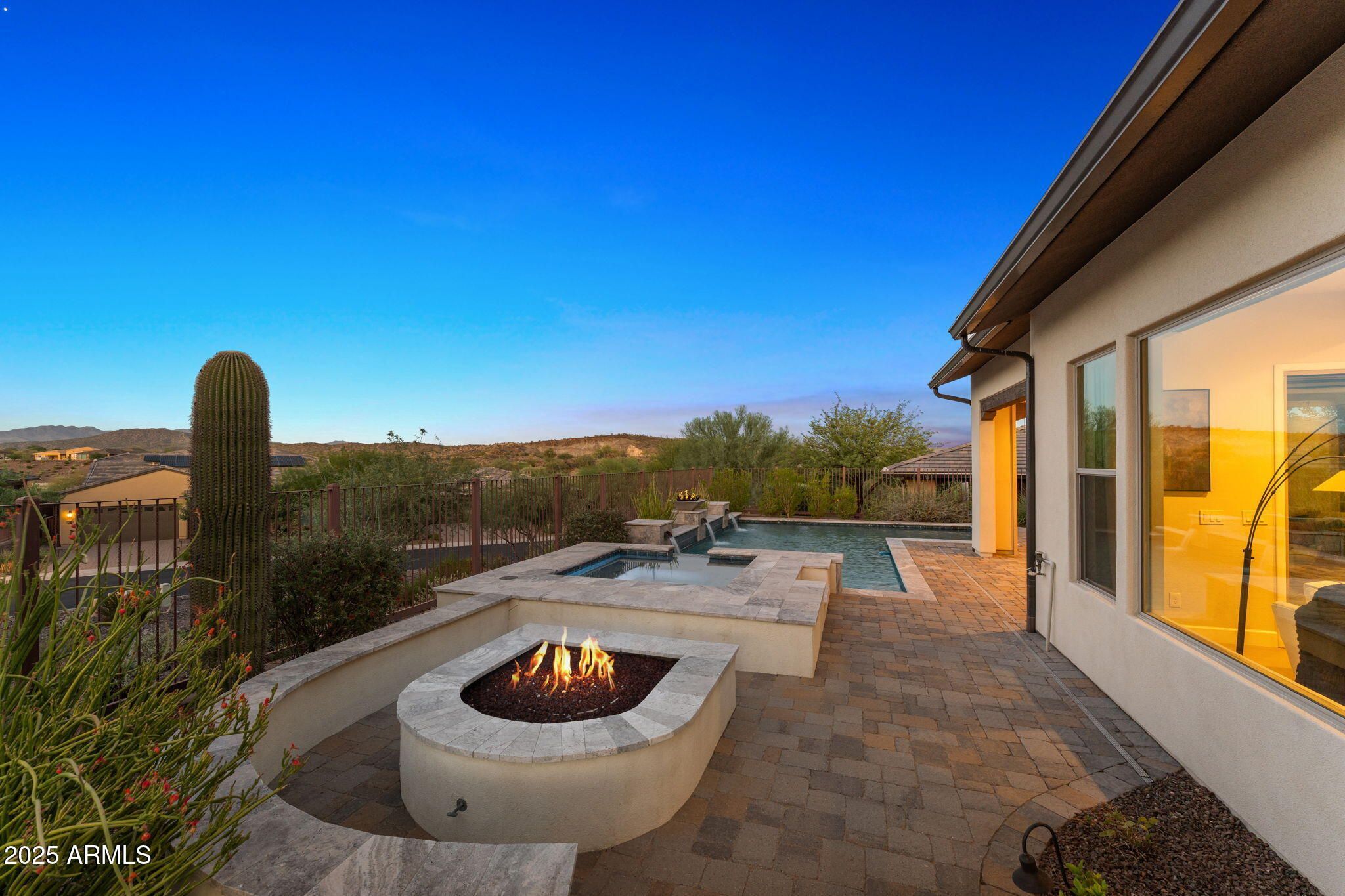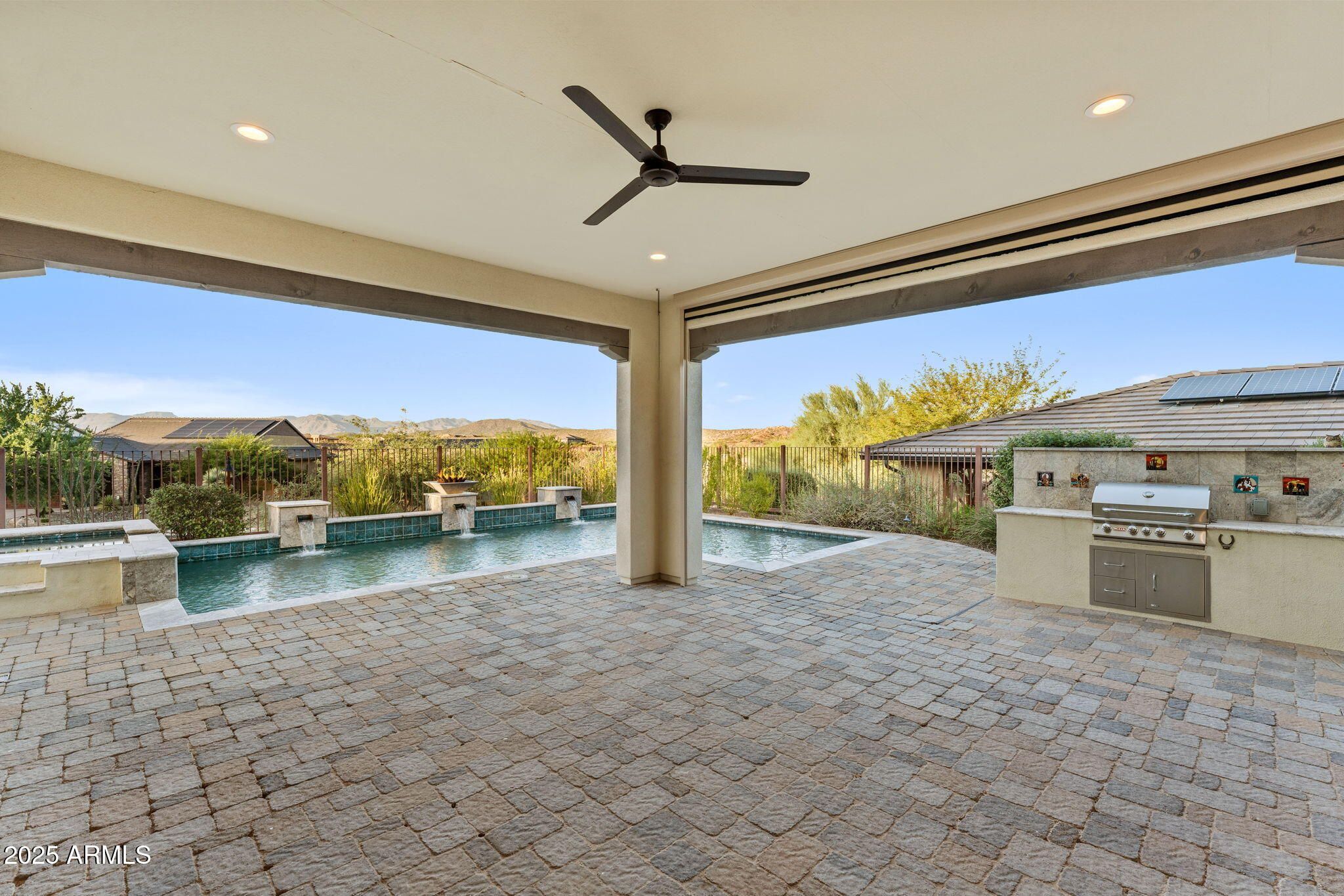 Experience luxury desert living in the prestigious Wickenburg Ranch community. This elegant single-level home features an open floor plan with a gourmet kitchen, granite counters, stainless appliances, and a spacious island that flows into the great room and covered patio. The primary suite offers a spa-like bath with dual vanities, walk-in shower, and large closet, while guest suites provide comfort and privacy. Enjoy a NE-facing backyard with a custom pool, spa, and outdoor kitchen—perfect for shaded afternoons and entertaining. Energy-efficient with owned solar. Community amenities include championship golf, clubhouse, dining, fitness, pickleball, tennis, and miles of scenic trails.