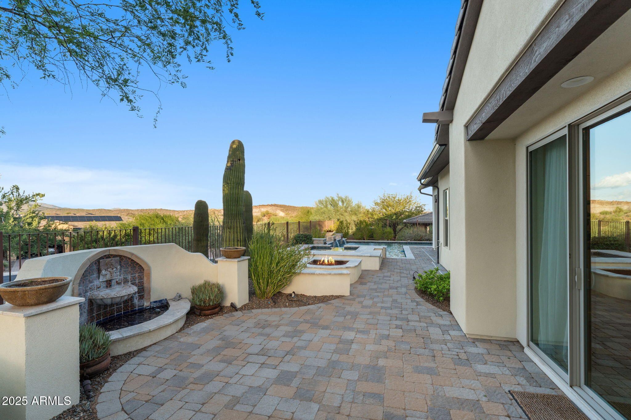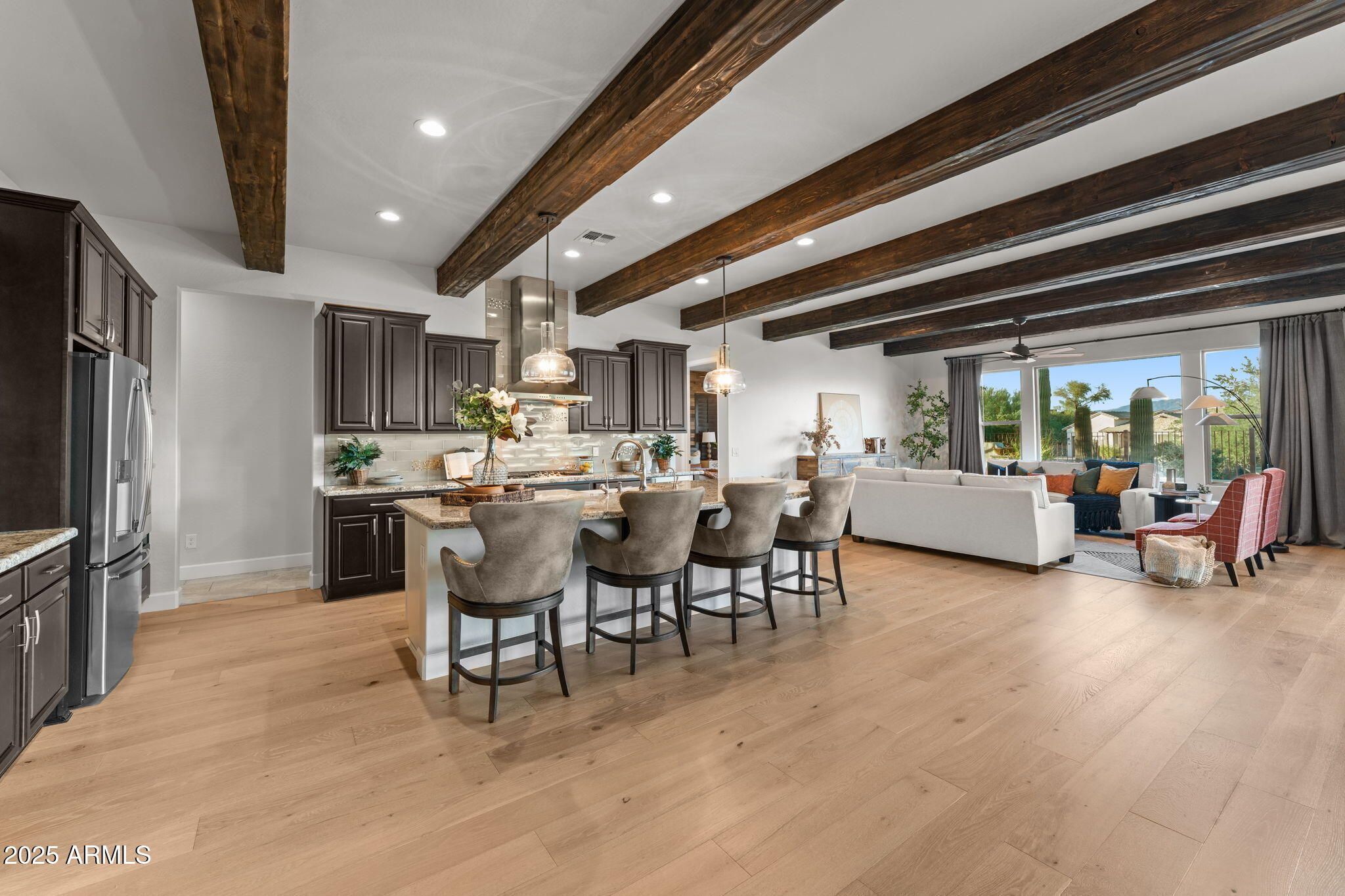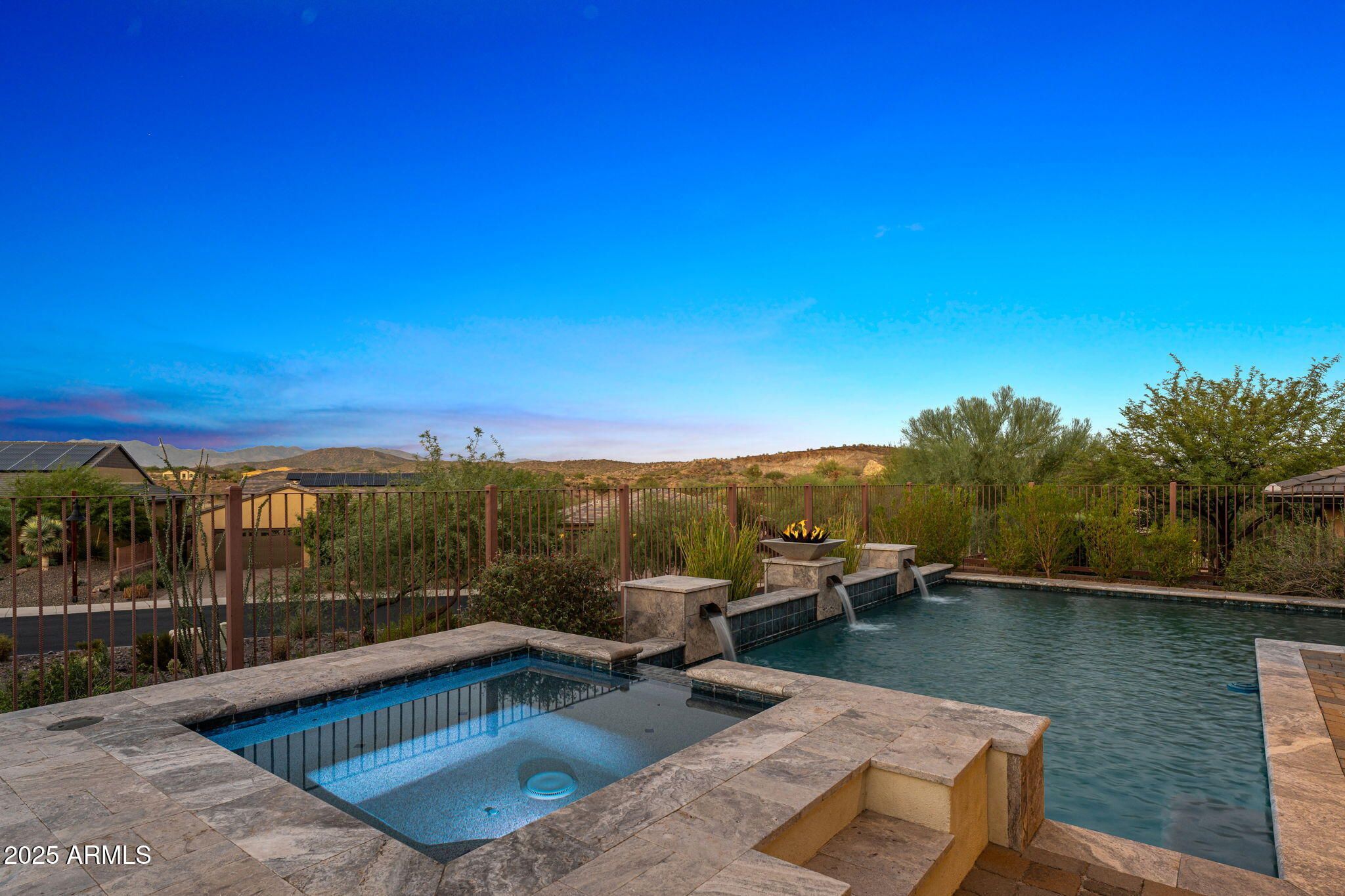Experience luxury desert living in the prestigious Wickenburg Ranch community. This elegant single-level home features an open floor plan with a gourmet kitchen, granite counters, stainless appliances, and a spacious island that flows into the great room and covered patio. The primary suite offers a spa-like bath with dual vanities, walk-in shower, and large closet, while guest suites provide comfort and privacy. Enjoy a NE-facing backyard with a custom pool, spa, and outdoor kitchen—perfect for shaded afternoons and entertaining. Energy-efficient with owned solar. Community amenities include championship golf, clubhouse, dining, fitness, pickleball, tennis, and miles of scenic trails.