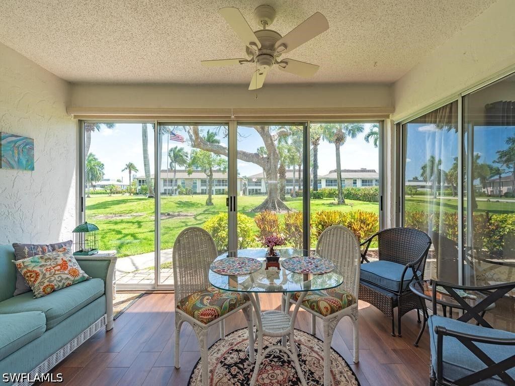 Turnkey and adorable. This unit has been well loved and well cared for. Enjoy the enclosed lanai with electric shades and a beautiful view of the courtyard and pool. You'll love having your coffee or evening cocktail in that space. Tankless water heater, 1 year old A/C. Convenient covered parking space. This unit is neat as a pin. First floor and tastefully decorated; move right in. Come see for yourself! very friendly 55+ community