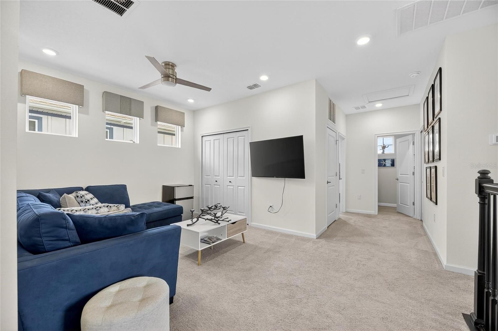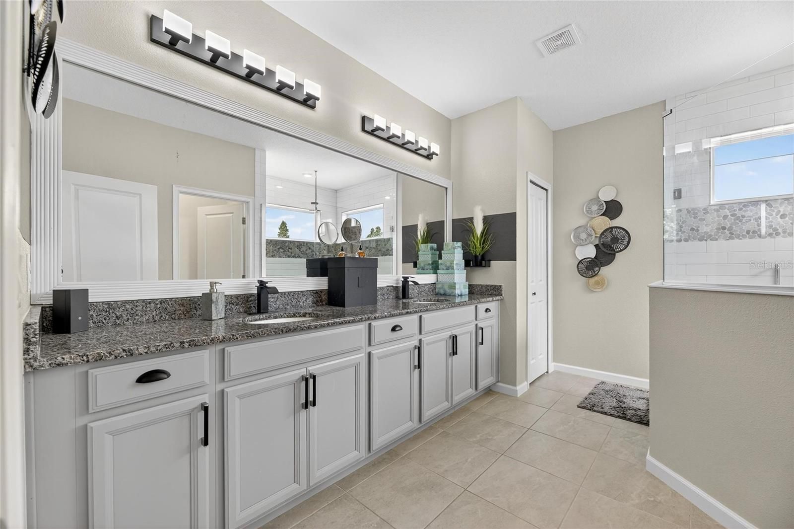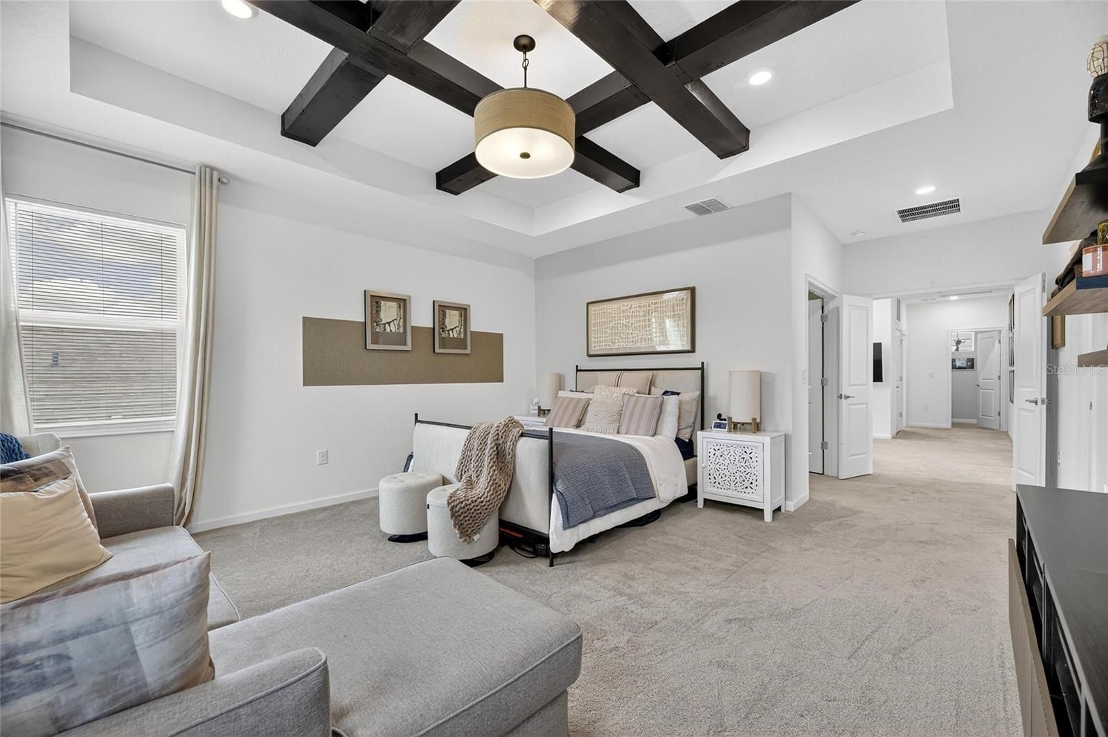 - Ceiling Fan(s), Coffered Ceiling(s), High Ceilings, Kitchen/Family Room Combo, L-Shaped Dining Room, Upper Level Primary, Solid Surface Counters, Split Bedrooms, Thermostat, Tray Ceiling(s), Walk-In Closet(s), Window Treatments