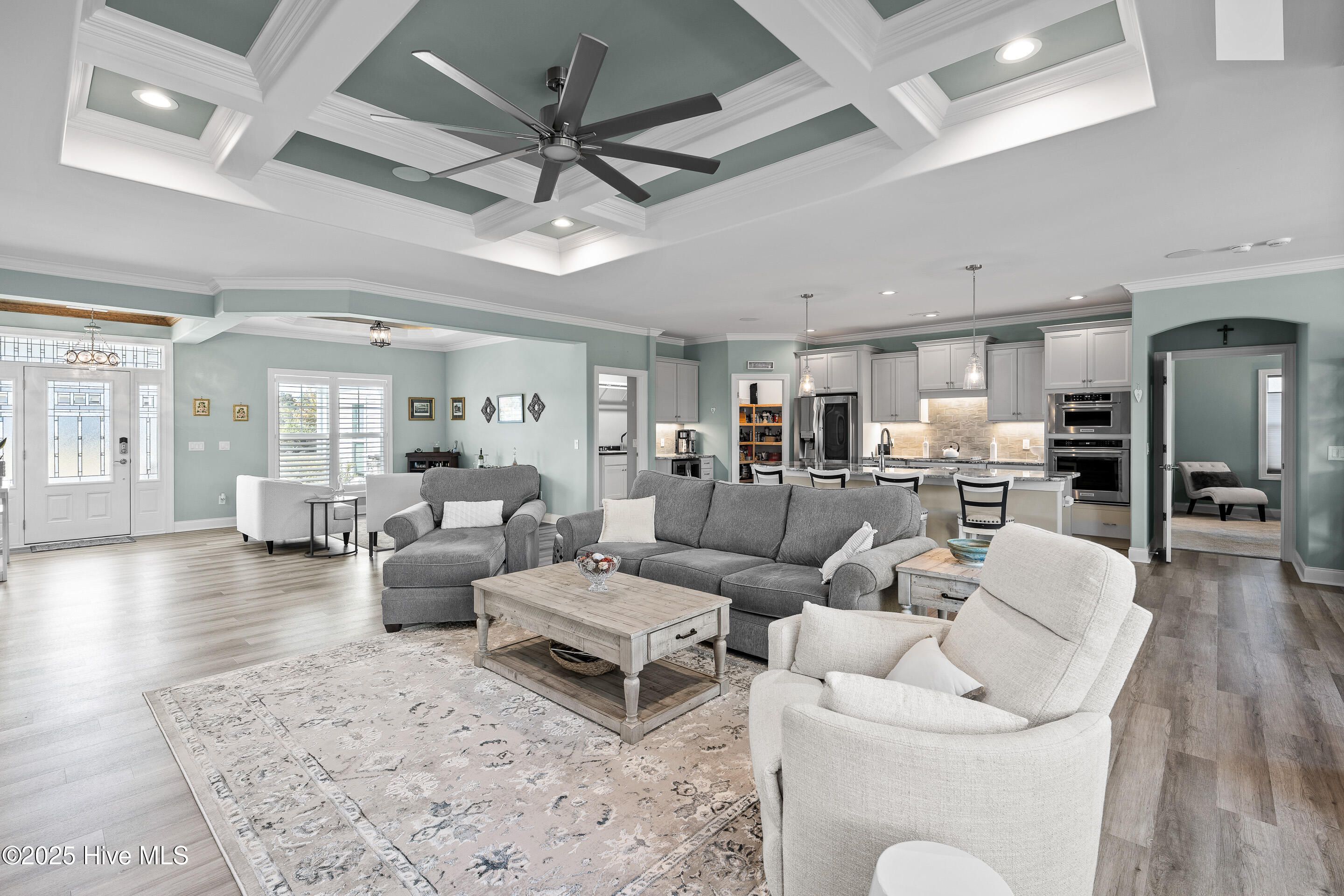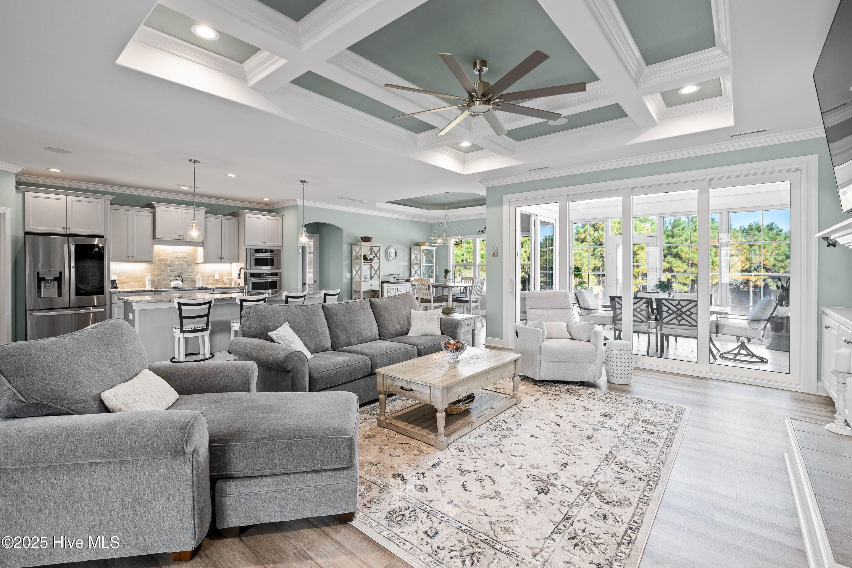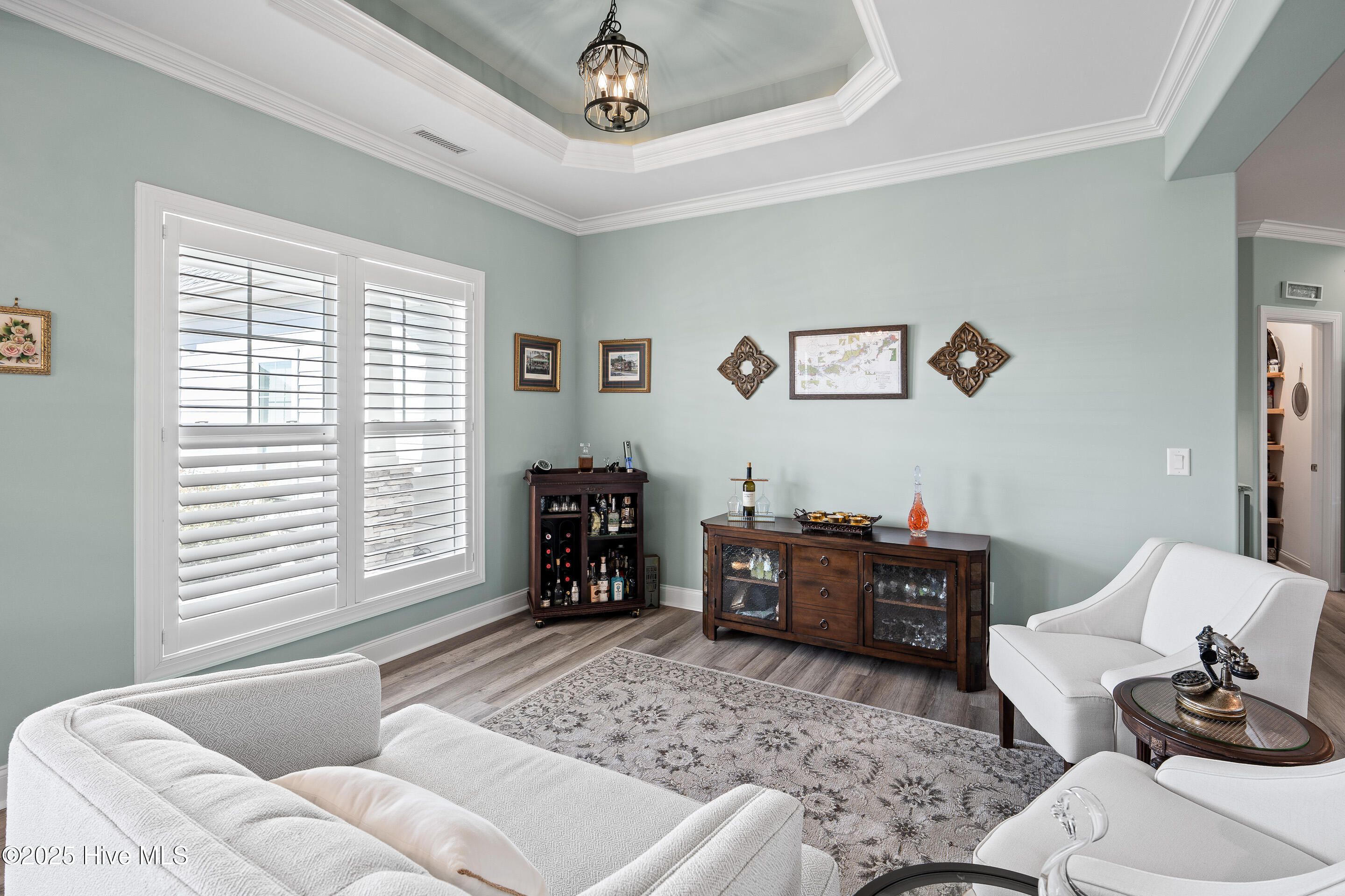 Welcome to this exquisite custom-built 4-bedroom, 3-bath home located in the prestigious Reserve section St. James community of Southport. Thoughtfully designed with upscale finishes throughout, this residence features trey and coffered ceilings, elegant crown molding, granite countertops, and luxurious fully tiled walk-in showers. The open-concept living area boasts soaring ceilings, abundant natural light, and custom built-ins surrounding a cozy gas fireplace—perfect for everyday comfort or entertaining. The gourmet kitchen showcases a large island with seating, stylish tile backsplash, and a spacious walk-in pantry with custom wood shelving. LVP flooring flows through the main living spaces, while all bathrooms feature durable tile flooring. Retreat to the inviting three-seasons room for relaxation or extended entertaining. The main-level primary suite provides a private escape with a generous walk-in closet that connects directly to the laundry room for convenience. Two additional main-floor bedrooms and a full bath offer ideal guest or family accommodations, while the upper-level bedroom/bonus suite includes its own bath and ample closet space. Storage is never an issue with a 30x8 floored walk-in attic and oversized garage. Enjoy peaceful views and wildlife from the back patio overlooking a serene wooded area. Just 10 miles from historic downtown Southport and only 15 minutes to the private St. James Beach Club on Oak Island, this home is perfectly situated for coastal living. Residents of St. James Plantation enjoy world-class amenities including four championship golf courses, tennis and pickleball, multiple pools, walking trails, fitness facilities, marina, restaurants, and so much more!