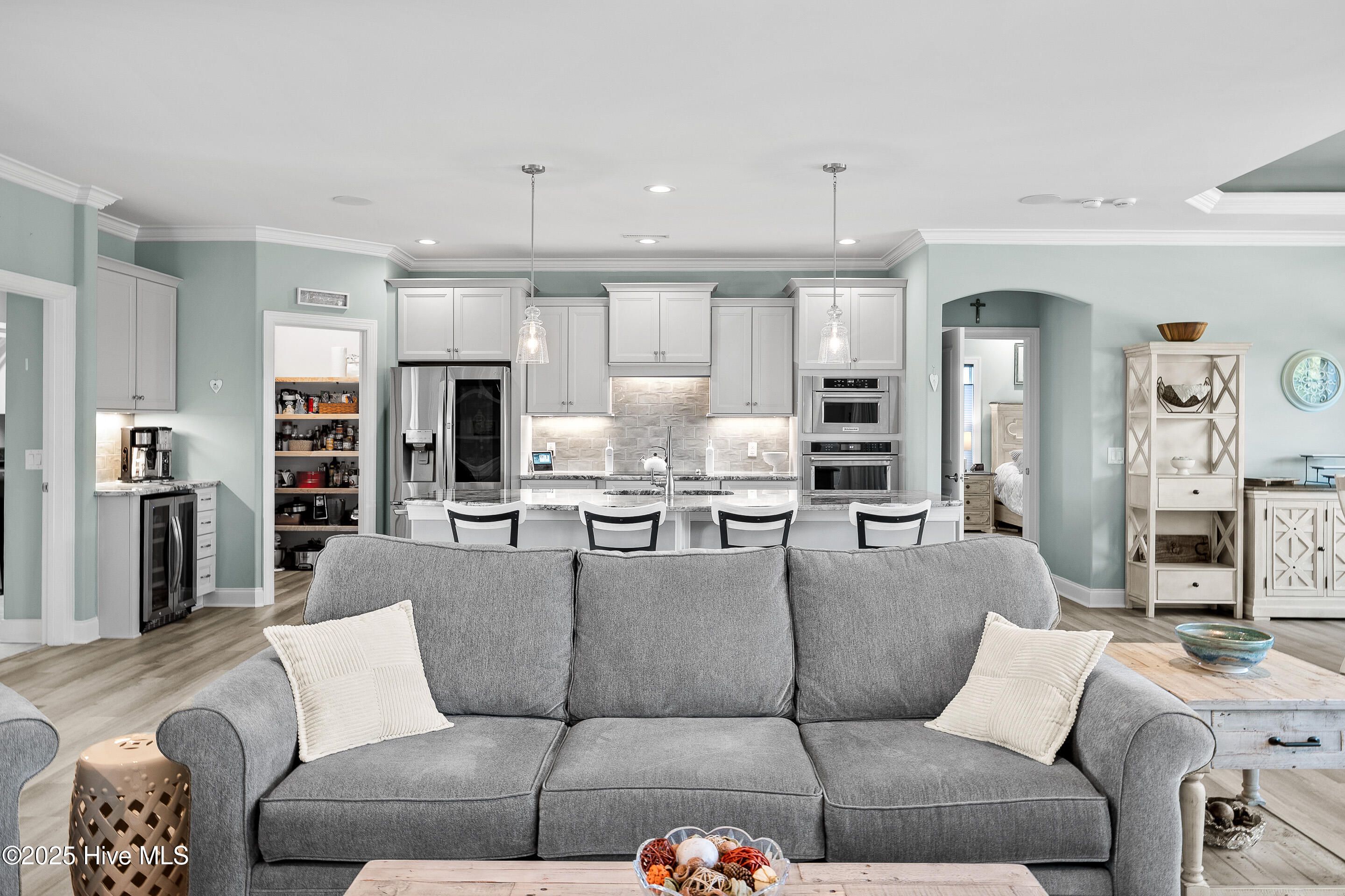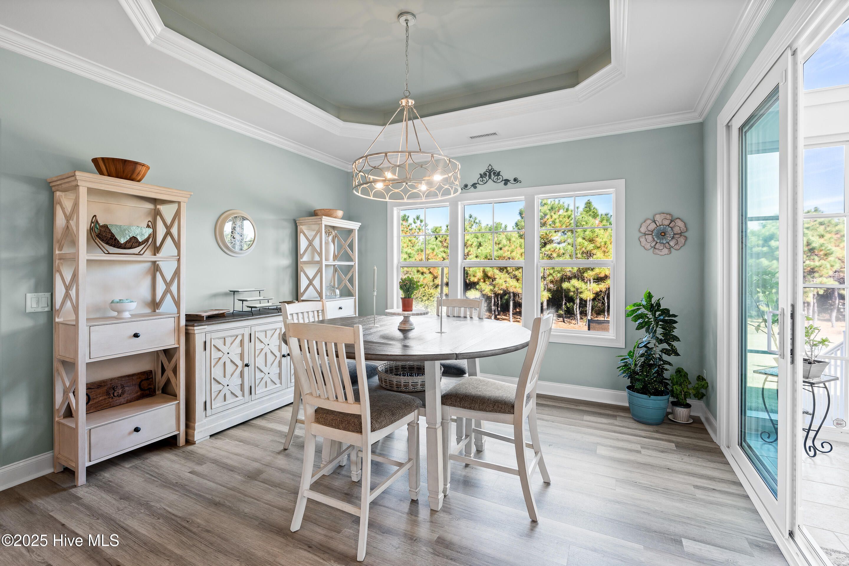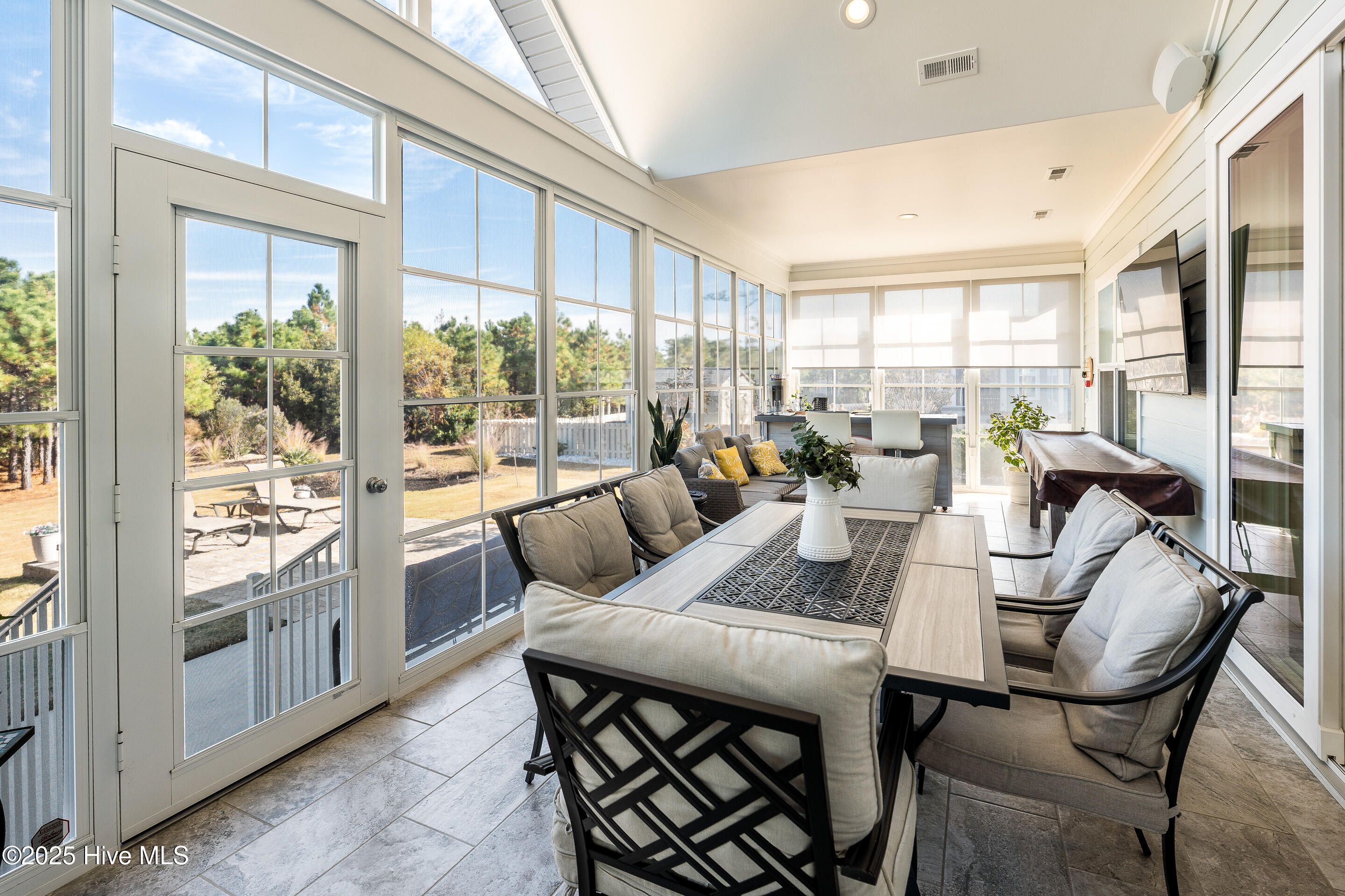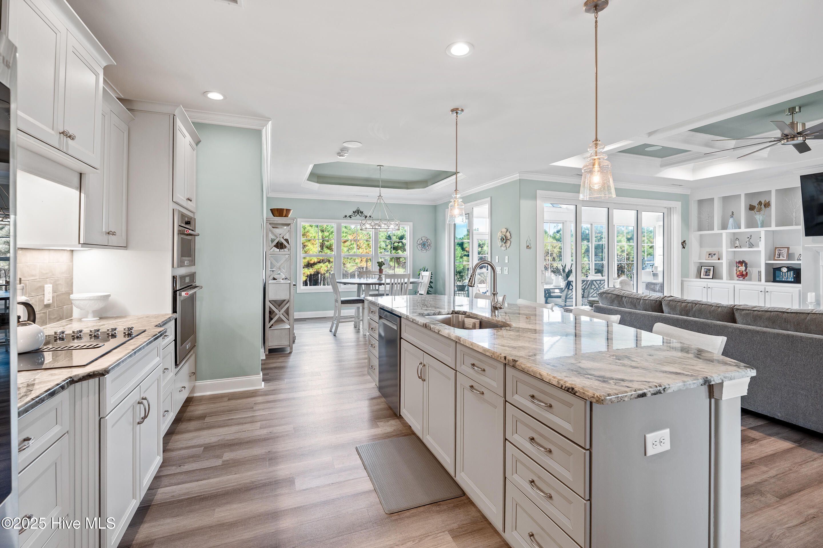 Welcome to this exquisite custom-built 4-bedroom, 3-bath home located in the prestigious Reserve section St. James community of Southport. Thoughtfully designed with upscale finishes throughout, this residence features trey and coffered ceilings, elegant crown molding, granite countertops, and luxurious fully tiled walk-in showers. The open-concept living area boasts soaring ceilings, abundant natural light, and custom built-ins surrounding a cozy gas fireplace—perfect for everyday comfort or entertaining. The gourmet kitchen showcases a large island with seating, stylish tile backsplash, and a spacious walk-in pantry with custom wood shelving. LVP flooring flows through the main living spaces, while all bathrooms feature durable tile flooring. Retreat to the inviting three-seasons room for relaxation or extended entertaining. The main-level primary suite provides a private escape with a generous walk-in closet that connects directly to the laundry room for convenience. Two additional main-floor bedrooms and a full bath offer ideal guest or family accommodations, while the upper-level bedroom/bonus suite includes its own bath and ample closet space. Storage is never an issue with a 30x8 floored walk-in attic and oversized garage. Enjoy peaceful views and wildlife from the back patio overlooking a serene wooded area. Just 10 miles from historic downtown Southport and only 15 minutes to the private St. James Beach Club on Oak Island, this home is perfectly situated for coastal living. Residents of St. James Plantation enjoy world-class amenities including four championship golf courses, tennis and pickleball, multiple pools, walking trails, fitness facilities, marina, restaurants, and so much more!