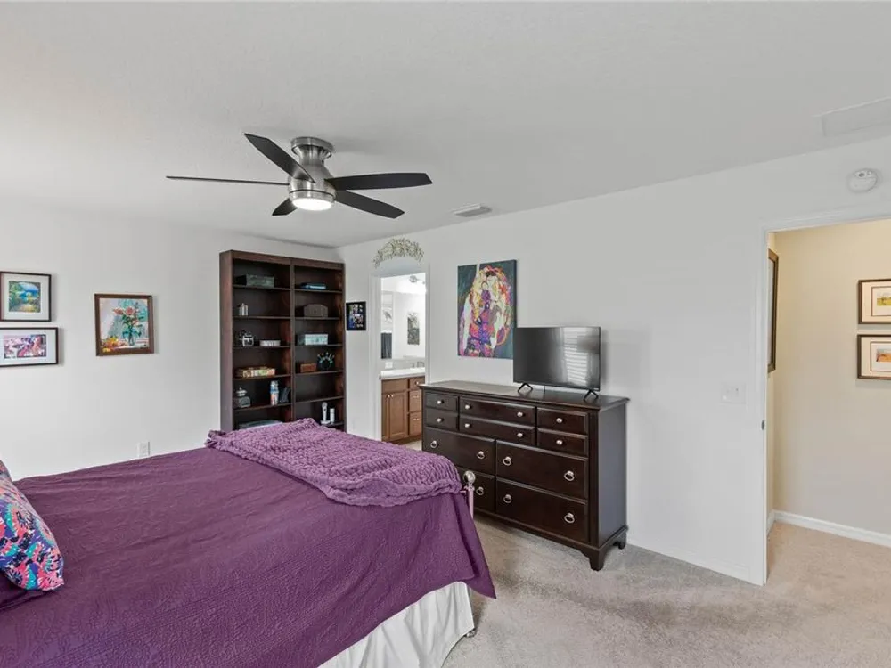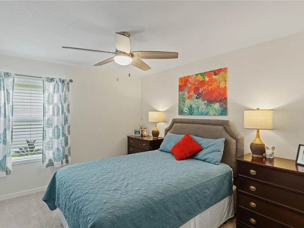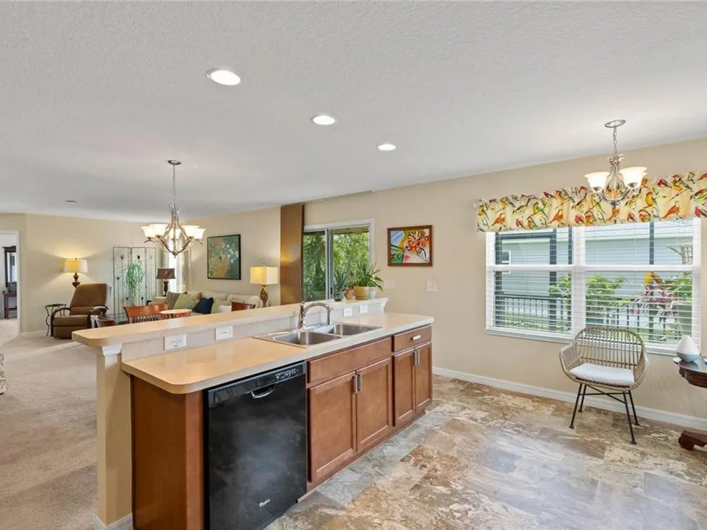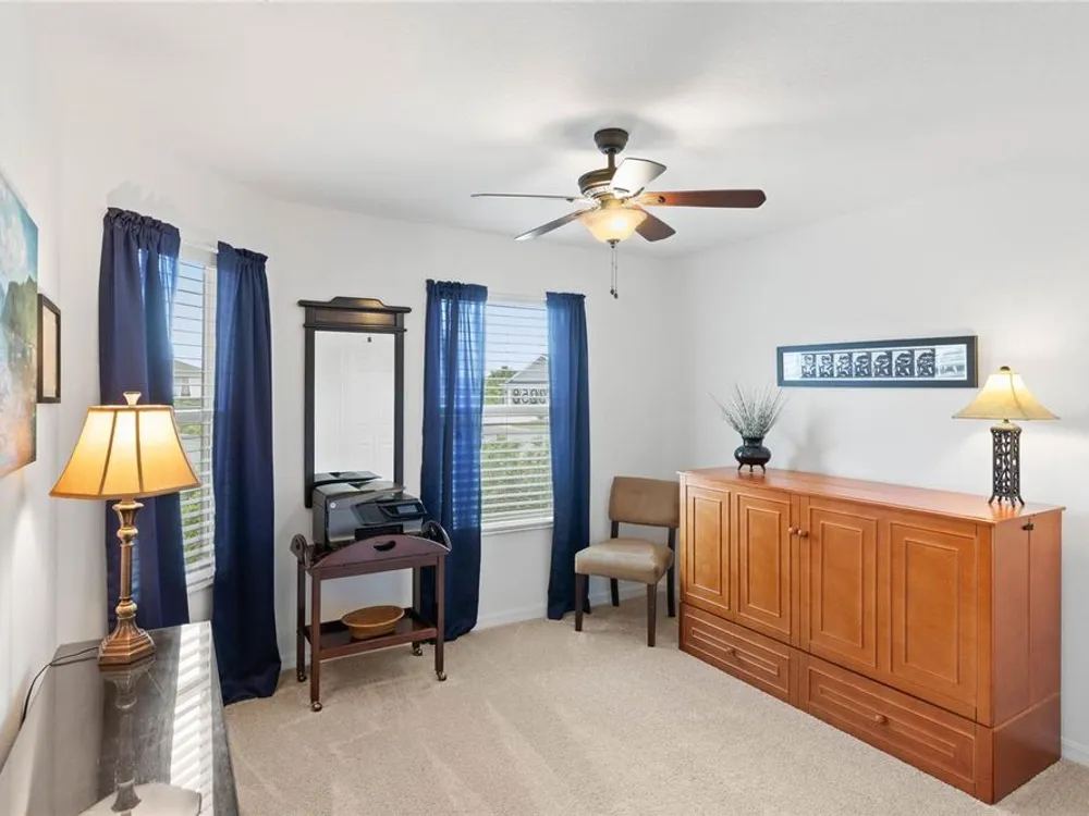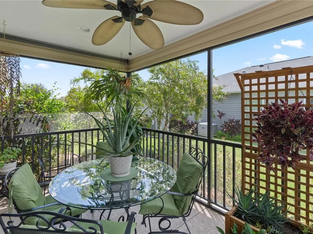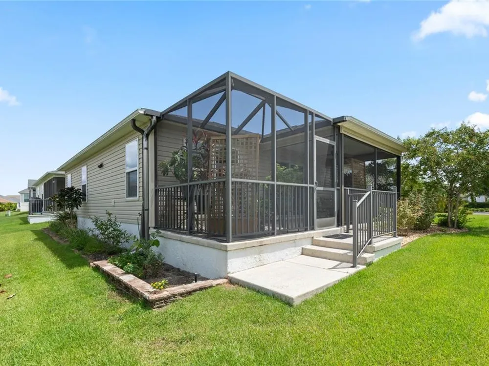 Welcome to this beautifully maintained 3 bedroom, 2 bath home located in the desirable Villages of Fruitland Park. The owner’s suite includes a walk-in closet complete with a closet system, en suite bath with double vanity separate from the toilet and shower area. This split bedroom plan provides flexibility with an attractive barn door which creates a private suite for your guests using the second bedroom and bath. The third bedroom/office is to the left of the foyer area. This open concept floor plan offers a spacious living/dining area and a modern kitchen with a pantry, more than ample cabinet space and intimate eat in area. Enjoy outdoor living with the extended birdcage perfect for relaxing and entertaining. This AT EASE model home had a roof installed in 2020, a sealed and painted garage floor, professional landscaping with irrigation and your choice of Xfinity or Spectrum as your internet provider. Conveniently located near shopping, centrally located between Brownwood and Sumter Landing - this move-in ready home offers comfort, style and a prime location. Taxes: Fire $233. Maintenance: $651. Bond Pmt: $1,651. Bond Balance: $18,900. Real Estate Taxes: $2,587. Golf cart available separately.
