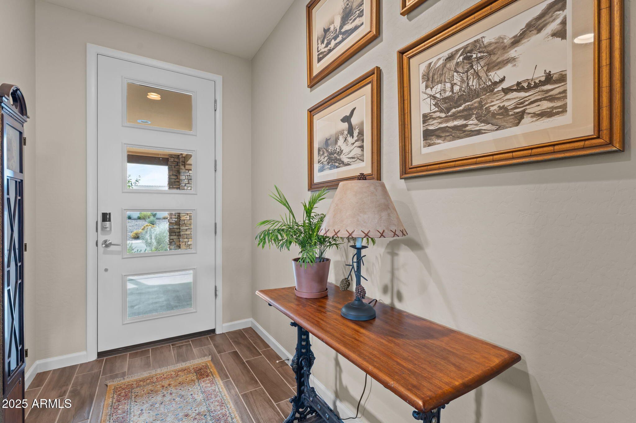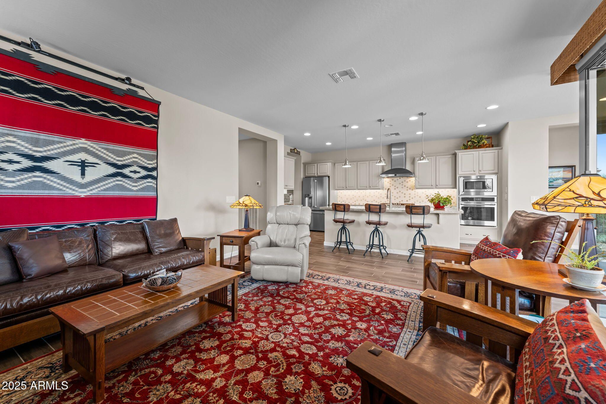 This stunning 2-bedroom, 2-bath home showcases an open floor plan that perfectly blends comfort and style. The spacious kitchen features a large island with seating, upgraded appliances, and plenty of cabinetry for storage. Wood-look tile flows seamlessly throughout, adding warmth and continuity to the living spaces. In the living and dining area, a dramatic corner of sliding glass doors fully retracts to create an effortless transition to the covered patio—ideal for entertaining or enjoying quiet desert evenings. The fully fenced backyard offers low-maintenance desert landscaping, retractable sun shades, fruit trees and a cozy fire pit for year-round enjoyment. Thoughtfully designed inside and out, this home combines modern upgrades with relaxed desert living.