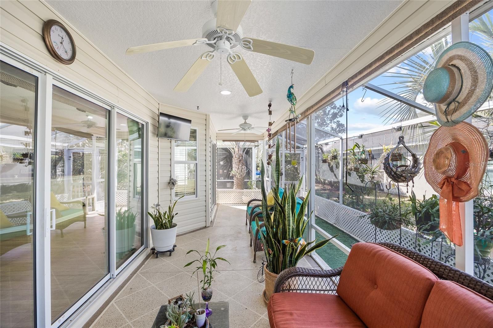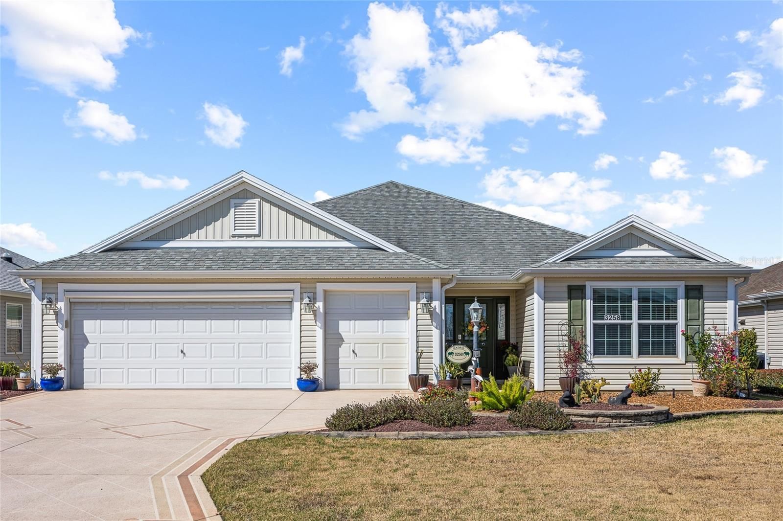Welcome to this well-appointed Lilac model home located in The Villages, a premier 55+ retirement community. Offering 1,956 square feet of thoughtfully designed living space, this three-bedroom, two-bath residence features an open layout that is both spacious and functional and has been freshly painted throughout the interior. The large kitchen is ideal for entertaining, with a generous breakfast bar, ample cabinetry, and tile flooring that continues through the wet areas, including the kitchen and baths. Laminate flooring runs throughout the main living areas and bedrooms for a clean, cohesive look. The primary suite provides a comfortable retreat with a walk-in shower, dual vanities with spacious countertops, a large walk-in closet, and a pocket door for the water closet. The oversized laundry room includes cabinet storage for added convenience. A standout feature of this home is the expansive screened-in back porch, along with a unique, separately partitioned screened area perfect for plant enthusiasts. This additional space is fully enclosed with its own screening and offers flexibility for gardening, hobbies, or relaxing year-round. The home includes a two-car garage plus a dedicated third garage bay for a golf cart. The water heater was replaced in 2025. Conveniently located just steps from a community pool, this home offers an exceptional opportunity to enjoy the lifestyle and amenities The Villages is known for. Schedule your private showing today.