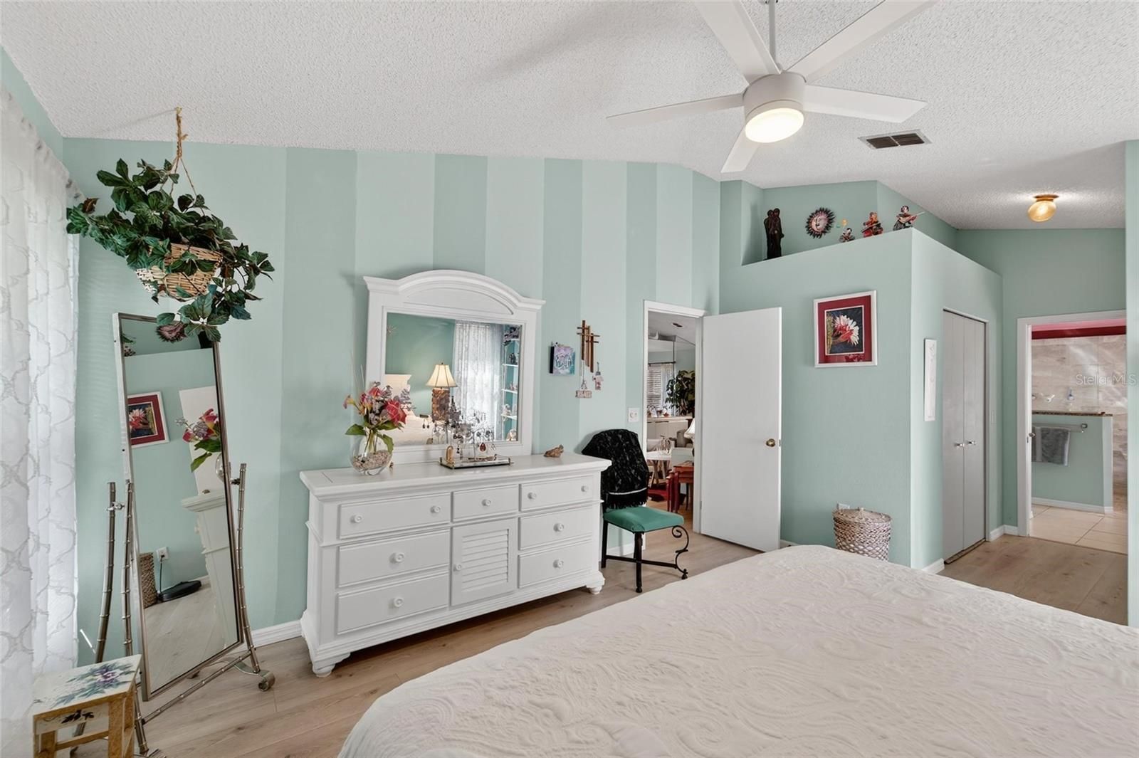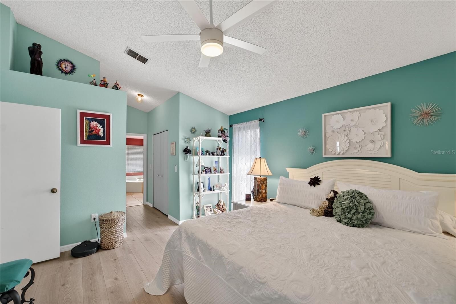 - Cathedral Ceiling(s), Ceiling Fan(s), Eat-in Kitchen, High Ceilings, Living/Dining Room, Open Floorplan, Split Bedrooms, Stone Counters, Thermostat, Walk-In Closet(s)