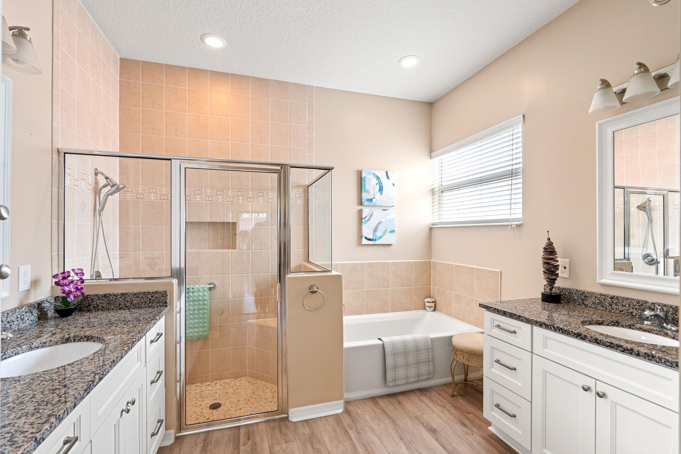 - Built-in Features, Kitchen Island, Pantry, Walk-In Closet(s), Breakfast Area, Living/Dining Room, Entry Level Living Area, Dual Sinks, Separate Shower, Soaking Tub