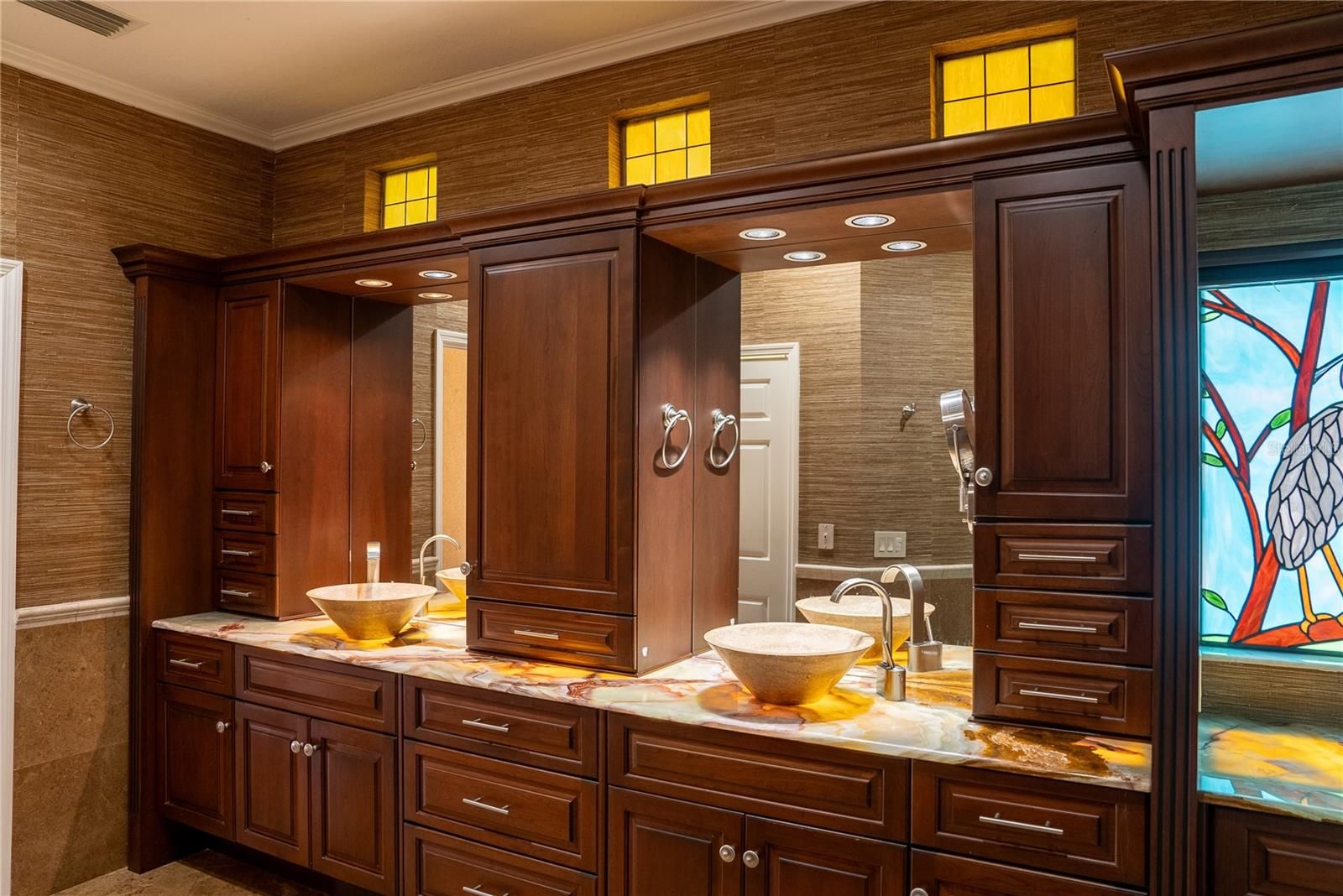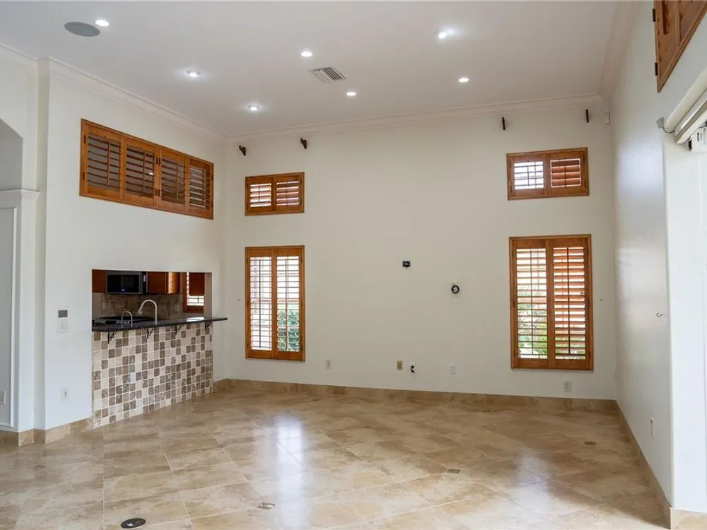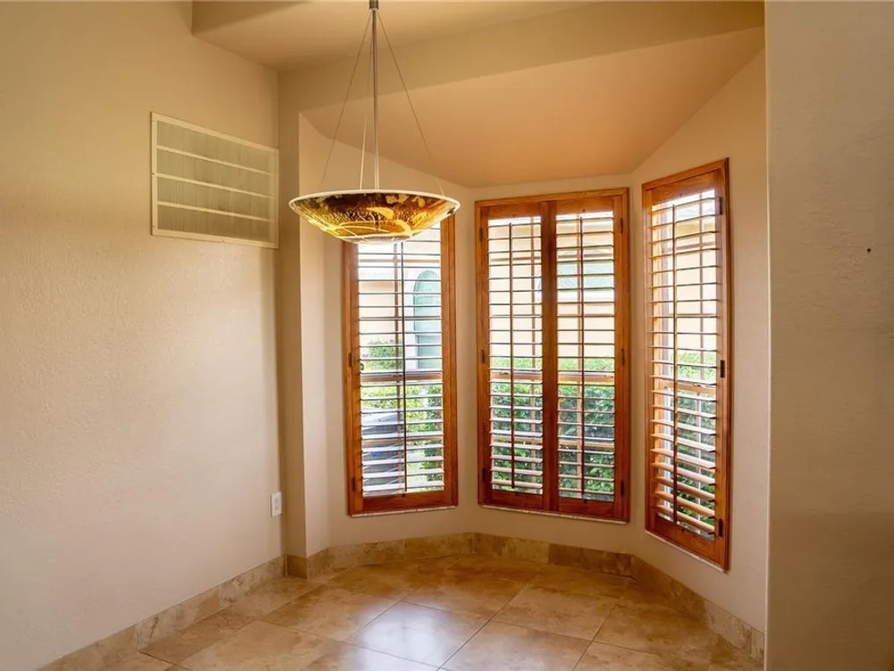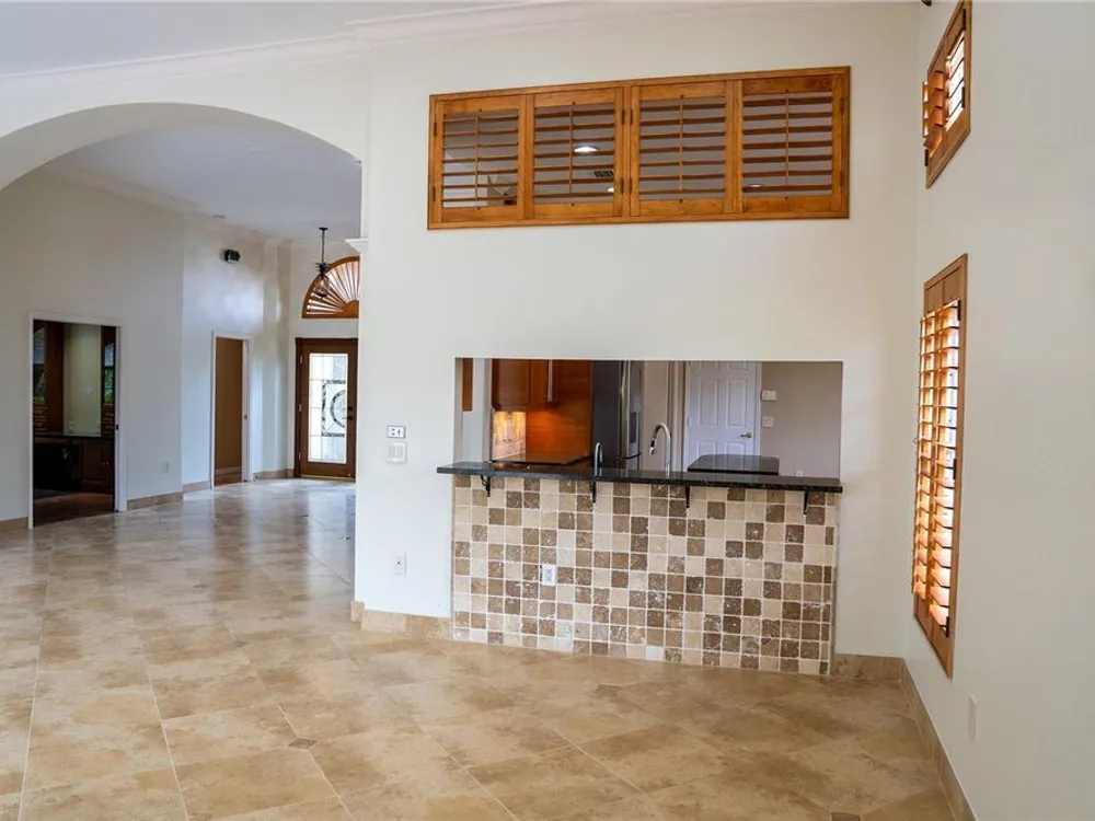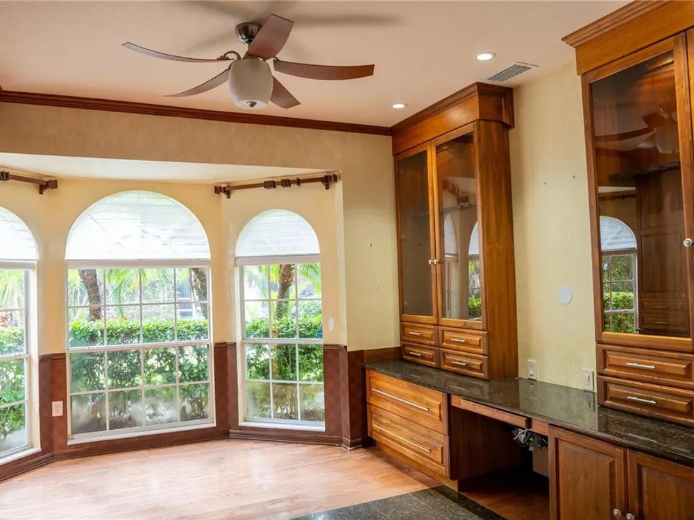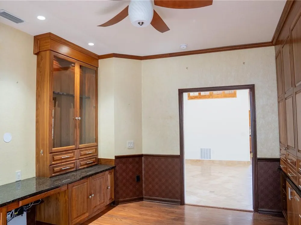 - Built-in Features, Ceiling Fan(s), Crown Molding, Eat-in Kitchen, High Ceilings, Solid Surface Counters, Solid-Wood Cabinets, Split Bedrooms, Stone Counters, Walk-In Closet(s), Window Treatments