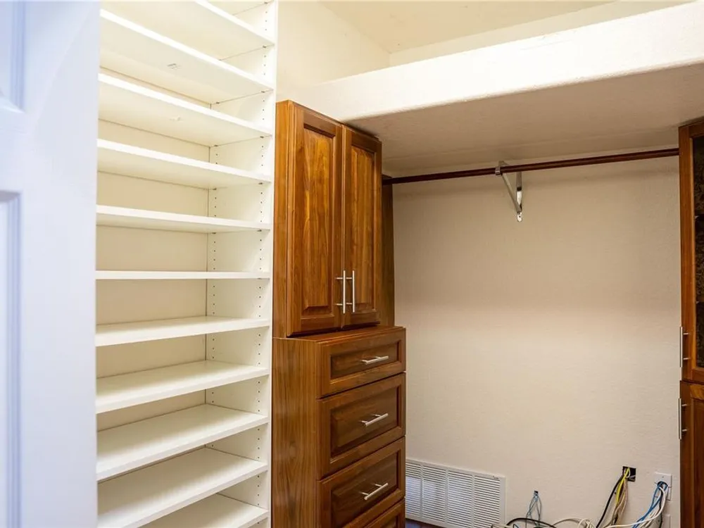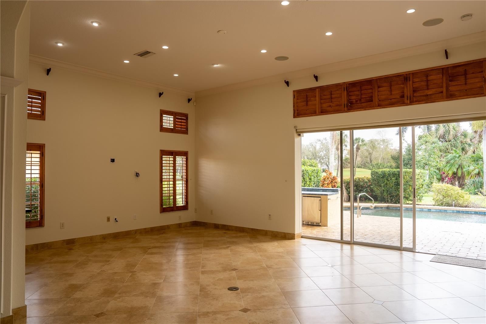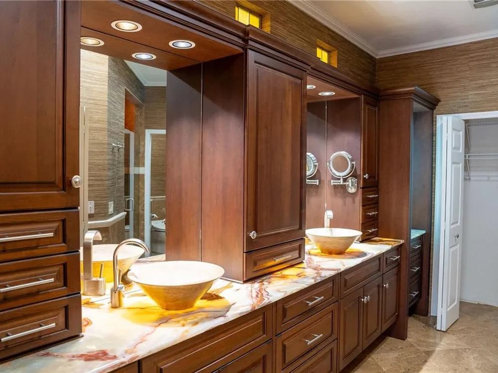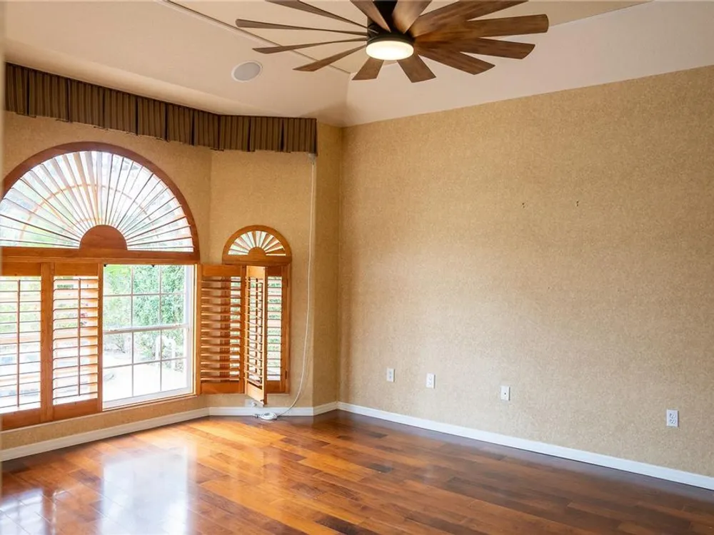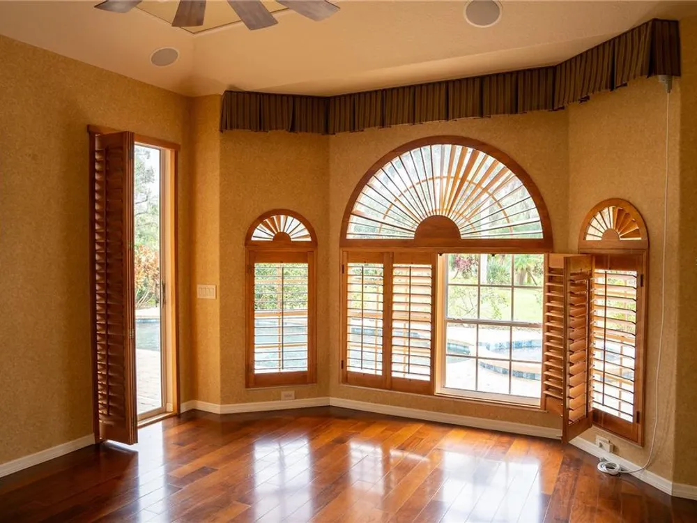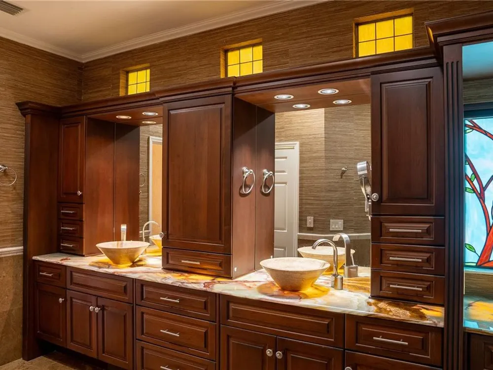 - Built-in Features, Ceiling Fan(s), Crown Molding, Eat-in Kitchen, High Ceilings, Solid Surface Counters, Solid-Wood Cabinets, Split Bedrooms, Stone Counters, Walk-In Closet(s), Window Treatments