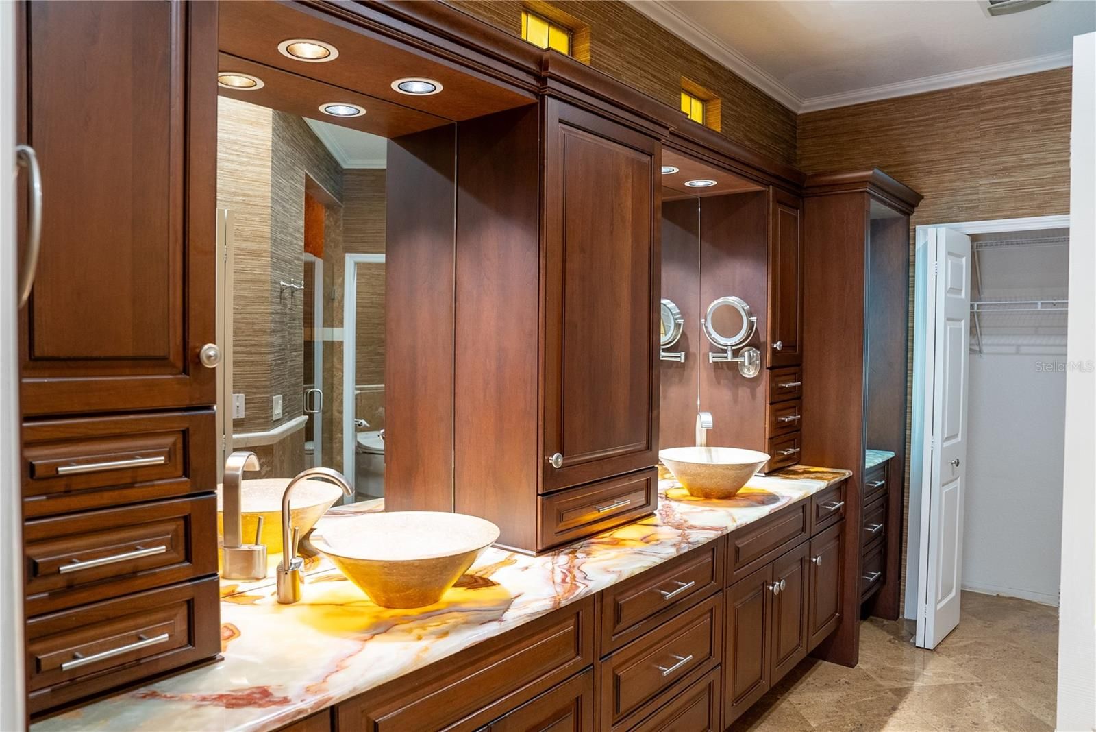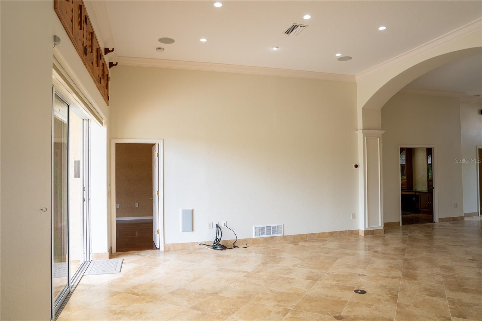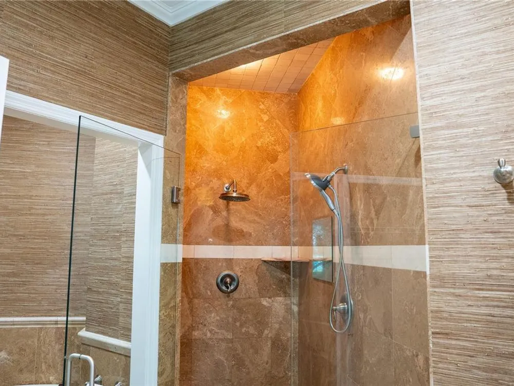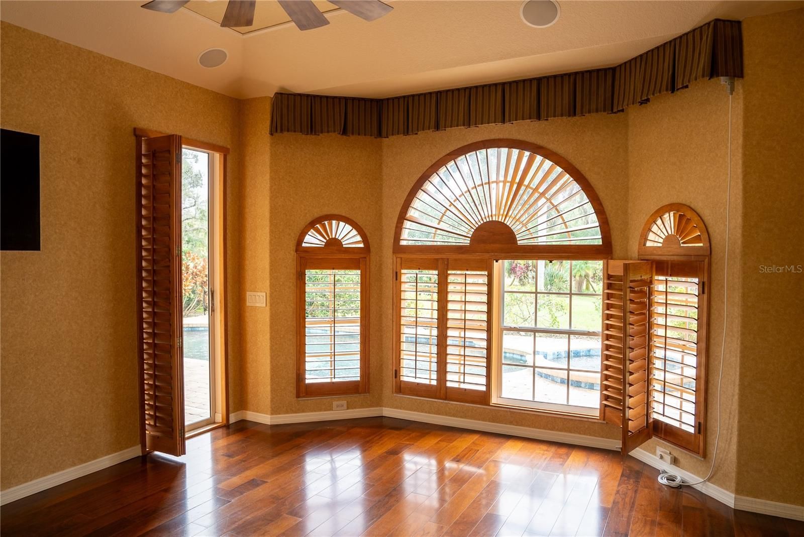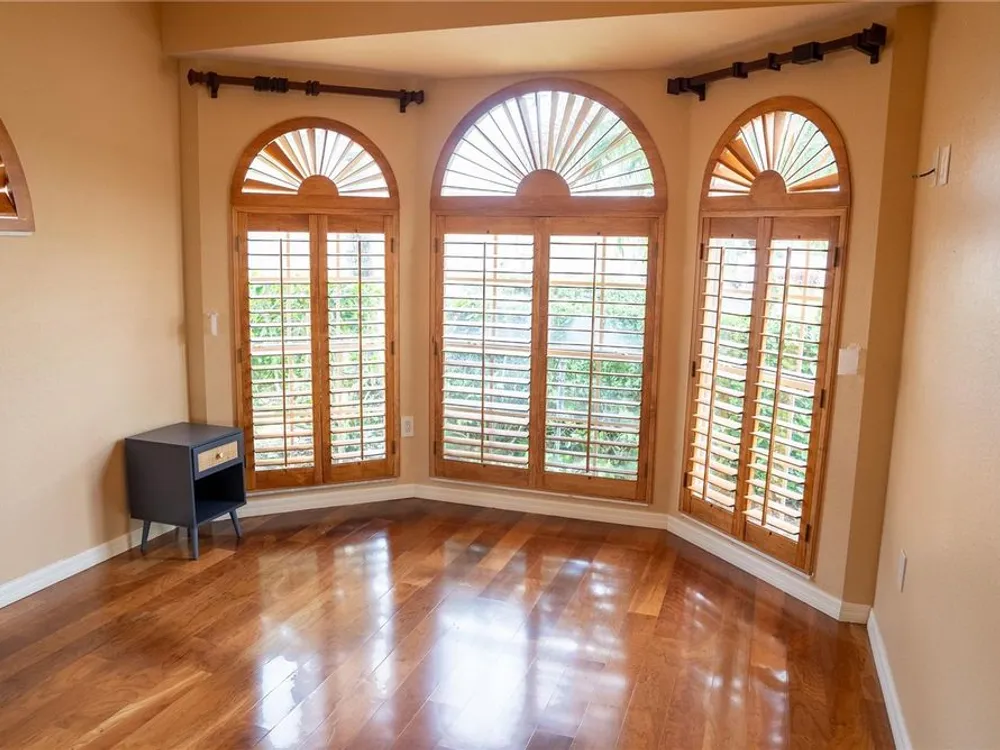 - Built-in Features, Ceiling Fan(s), Crown Molding, Eat-in Kitchen, High Ceilings, Solid Surface Counters, Solid-Wood Cabinets, Split Bedrooms, Stone Counters, Walk-In Closet(s), Window Treatments