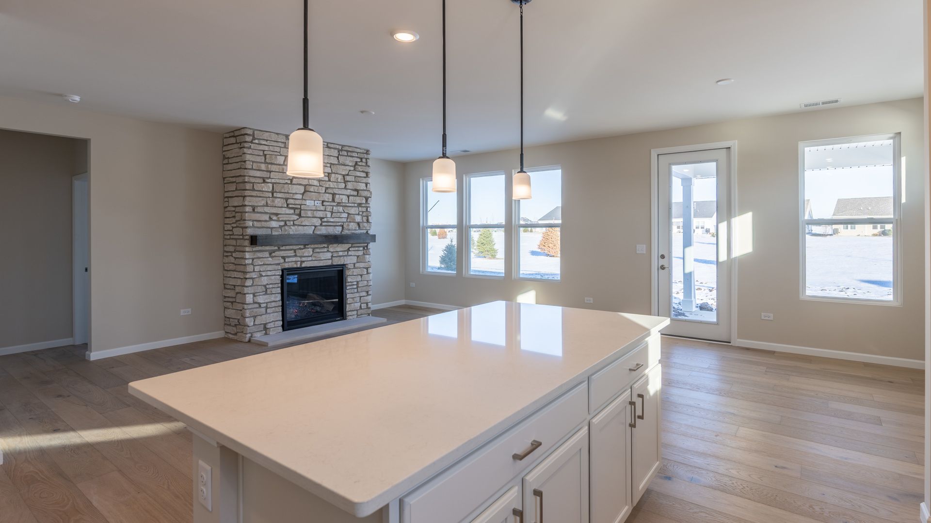 Welcome to 3262 Oak Creek Lane, a never-lived-in, brand-new ranch home located in the highly sought-after DEL WEBB LINCOLN PRAIRIE, widely regarded as one of the finest 55+ communities in the area. Due to unforeseen circumstances, the seller was unable to move in, creating a rare opportunity to purchase new construction without the wait. This popular Prosperity floor plan offers an open, airy layout with thousands of dollars in thoughtfully selected upgrades. The main living area is filled with natural light and anchored by a striking floor-to-ceiling stone fireplace, complemented by wide-plank real wood flooring -perfect for both everyday comfort and entertaining. No builder white walls here, upgraded paint throughout entire home! The kitchen is beautifully finished with creamy white cabinetry, quartz countertops, upgraded tile backsplash, a gas appliance package, pendant lighting, and a large center island and a huge walk-in pantry that flows into the cafe dining area. Just beyond, the covered patio extends your living space outdoors. A flex room with French doors provides the perfect space for a home office, den, or 3rd bedroom. The owner's suite is a peaceful retreat, featuring a private en-suite bath with upgraded cabinetry, tiled shower floor, and modern finishes. Additional highlights include smart-home technology, upgraded electrical and lighting selections, floor outlets, and a premium flooring package throughout. Living at Lincoln Prairie means enjoying an exceptional lifestyle centered around a spectacular 16,000+ square-foot clubhouse, complete with indoor and outdoor pools, pickleball and tennis courts, a fully equipped fitness center, social and gathering spaces, and miles of scenic walking paths, including a four-mile loop throughout the community. Designed for connection, convenience, and carefree living, Lincoln Prairie offers a true resort-style experience. Why wait to build? This home is complete, upgraded, and ready for immediate enjoyment.