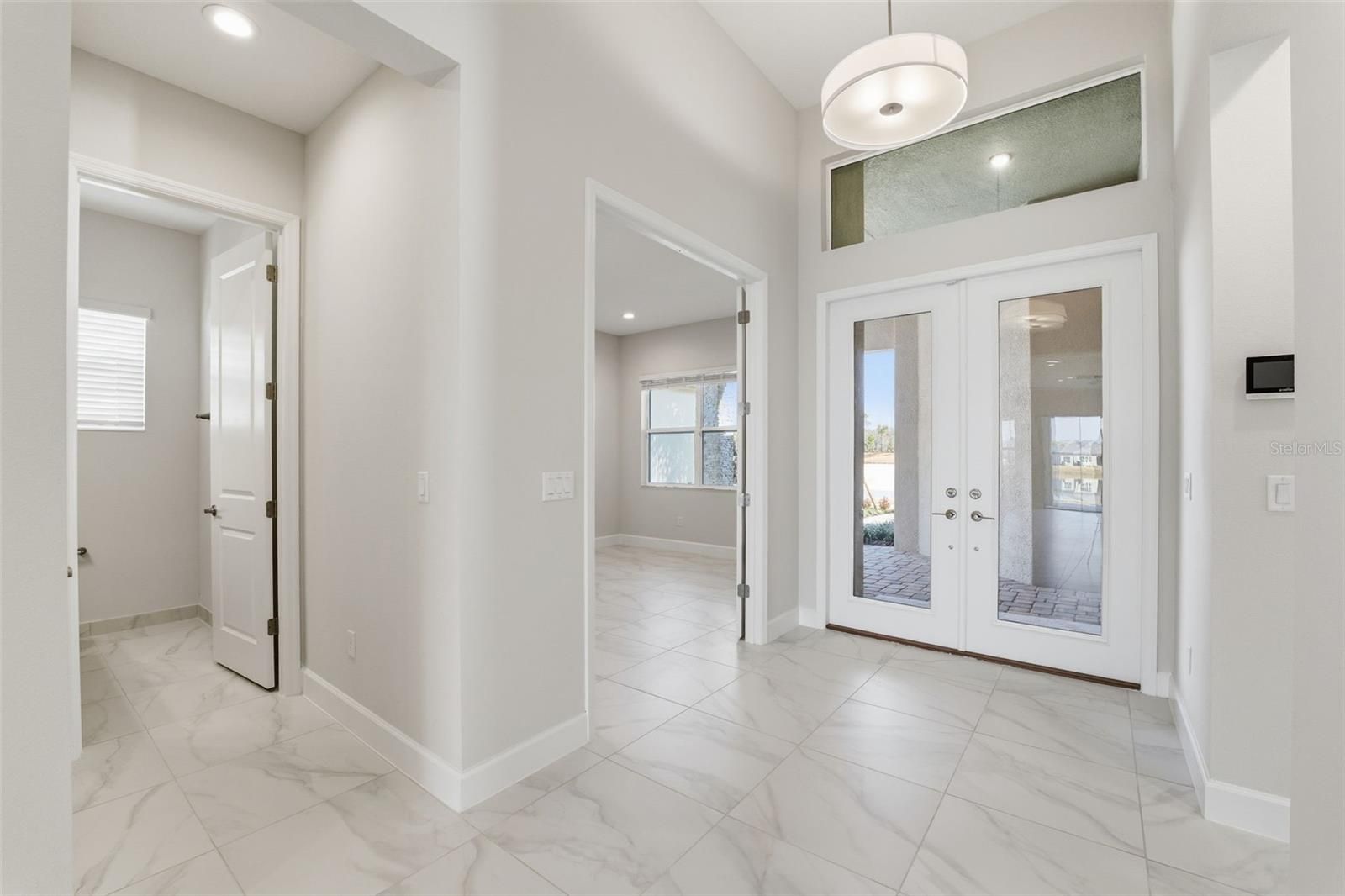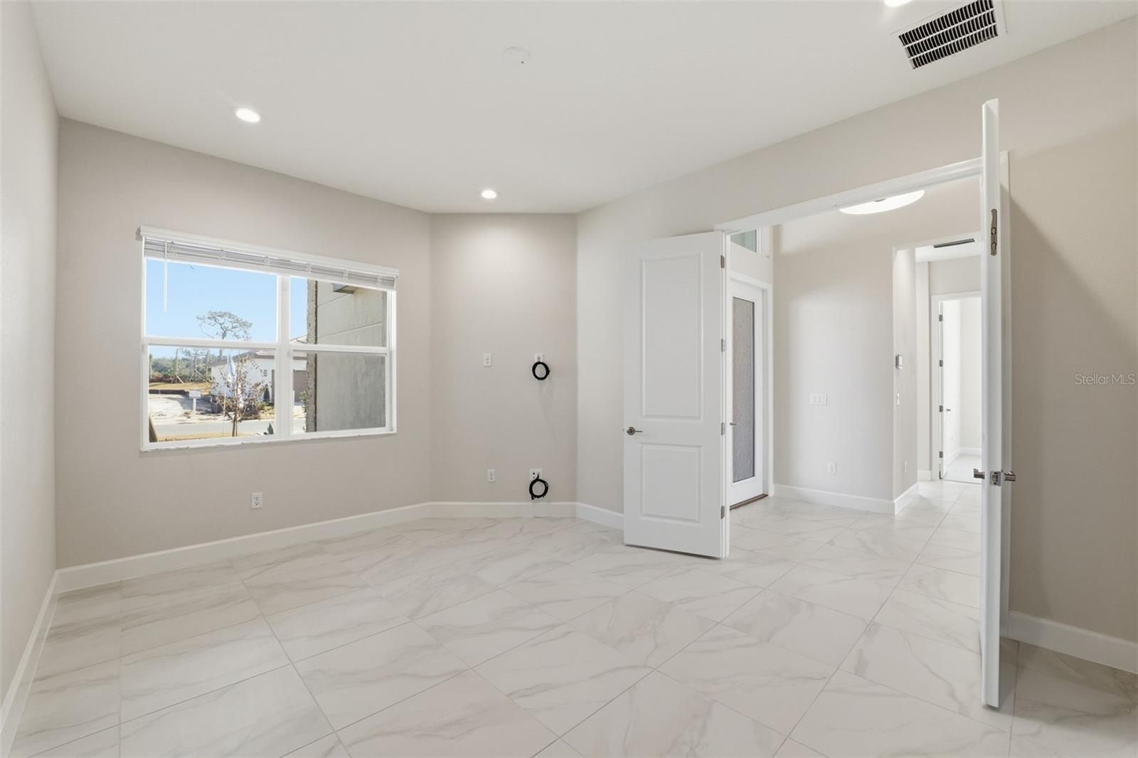 - Ceiling Fan(s), High Ceilings, Open Floorplan, Main Level Primary, Solid Surface Counters, Thermostat, Walk-In Closet(s), Window Treatments