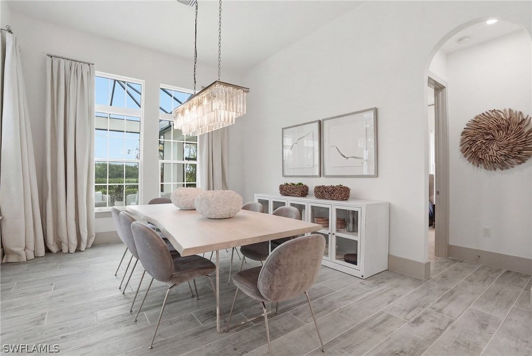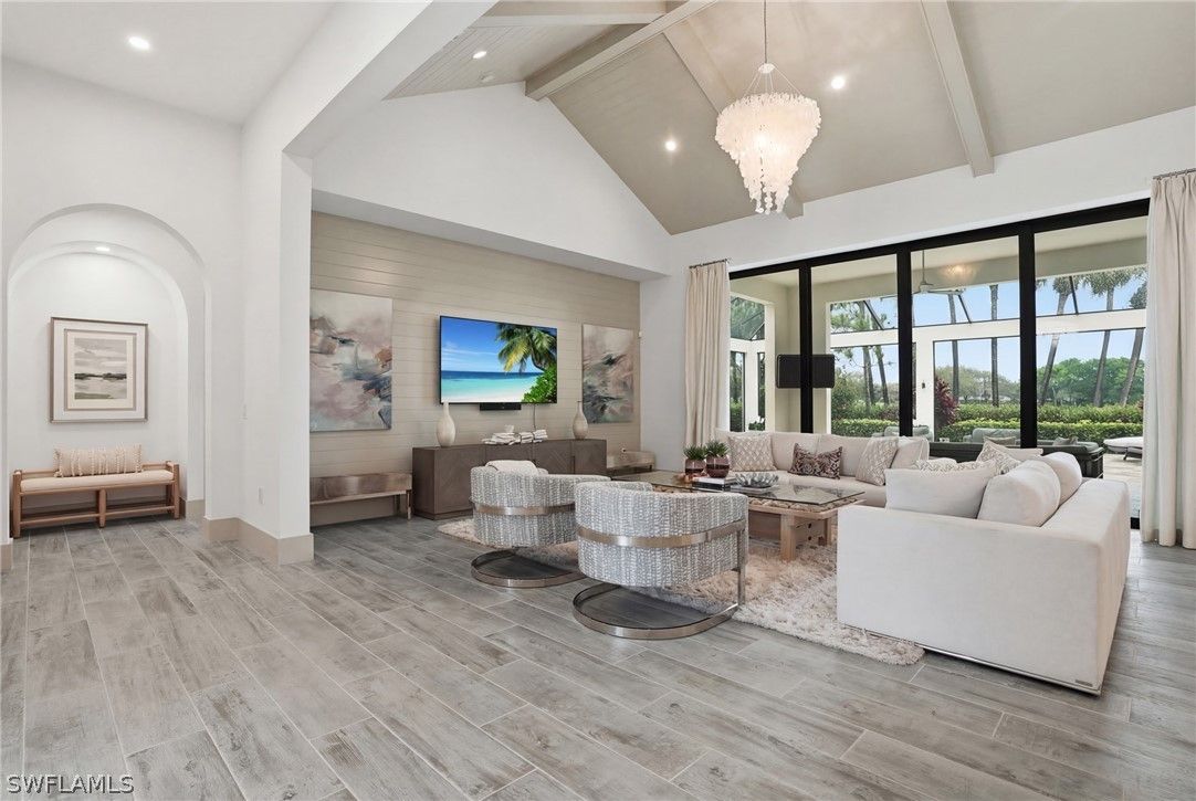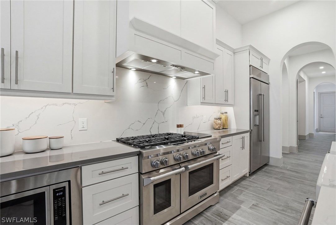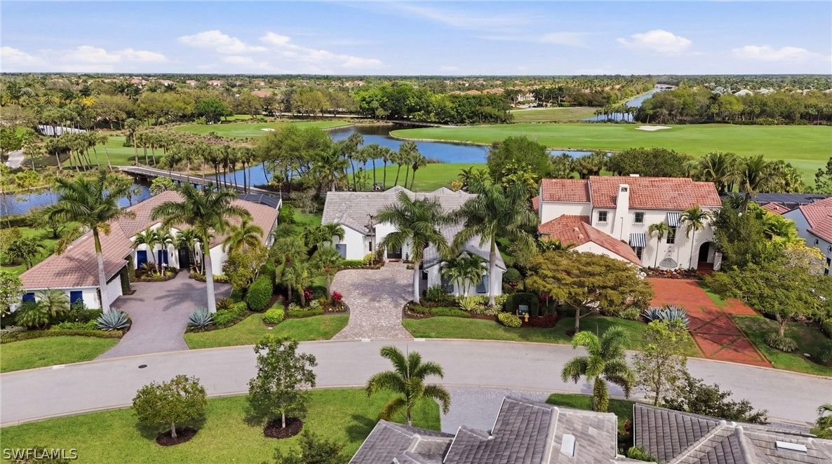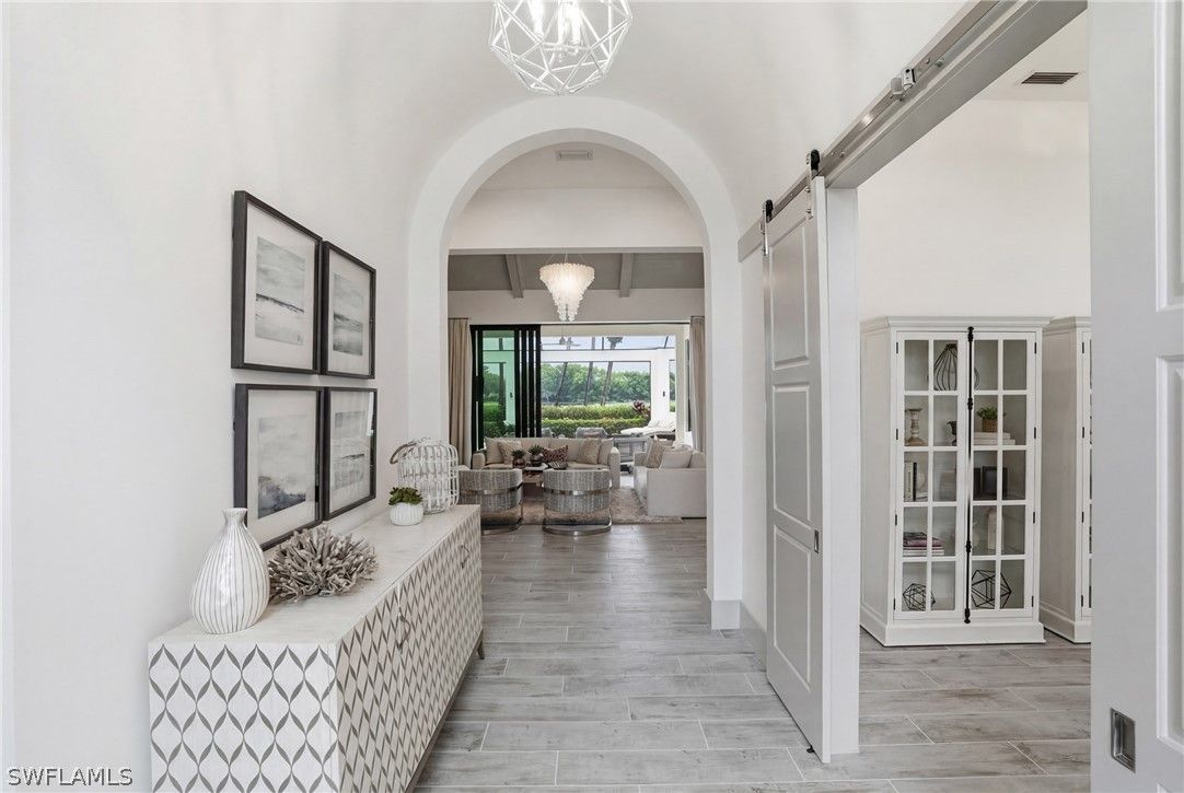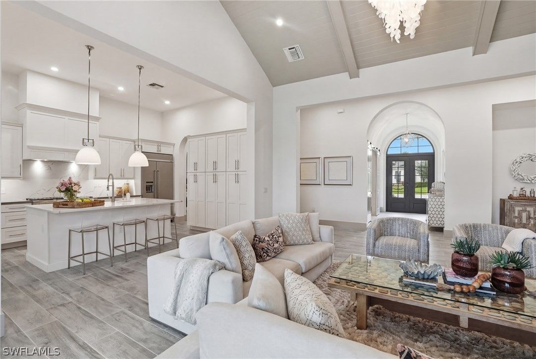 Stunning luxury coastal living in the highly sought-after Marsh Cove section of Fiddler’s Creek. Ideally located on Tavolara Lane and perfectly positioned to capture beautiful WATER and GOLF course views, this nearly 1/2-acre property blends sophisticated coastal style with quality craftsmanship and thoughtful design throughout. Offered turnkey, the home features over 3,500 square feet of living space with 4 bedrooms + den, 3 full baths, 1 powder room, and 1 pool bath. From the moment you arrive, grand arched entry doors set the tone for the coastal elegance found throughout. Inside, the light-filled great room showcases soaring vaulted ceilings with shiplap detailing, an accent wall, and a designer chandelier. From the charming built-in reading nook in the front hall to the custom window treatments and lighting throughout, every detail has been thoughtfully considered, creating a warm and inviting atmosphere. Beautiful wood-look tile flooring with rich grain runs throughout most of the home, offering the warmth of wood with effortless maintenance, while arched architectural openings add character and style. The chef’s kitchen is a true luxury upgrade, featuring commercial-grade appliances including a 48-inch range, custom hood, and oversized refrigerator. Calcutta quartz countertops, loads of white shaker cabinetry, and a large island complete this exceptional space. The main living areas overlook tranquil water and golf course views, bringing natural light and scenery into the heart of the home. The primary suite is a bright and airy retreat with a luxurious bath featuring a freestanding soaking tub, large glass shower, dual vanities with quartz countertops, a walk-in closet, and generous linen storage. Three additional guest suites are equally well-appointed, while the private den/office with barn doors includes a sleeper sofa, making it ideal for additional guests. Outdoor living is truly impressive. The expansive lanai overlooks peaceful water and golf course views and features a pool and spa with water feature, outdoor kitchen, and multiple seating and lounging areas—perfect for entertaining or relaxing in the Florida sunshine. A convenient pool bath allows easy access for guests without entering the home. Additional highlights include two new AC units, abundant storage throughout, and a spacious three-car garage. Fiddler’s Creek is an award-winning private community offering luxury residences and resort-style amenities set within a beautiful tropical landscape. The 54,000-square-foot Club & Spa features two on-site restaurants, pools, a fitness center, and tennis, pickleball, and bocce courts. Optional memberships for golf, beach, and boating are also available. Conveniently located just minutes from the beaches of Marco Island, 5th Avenue, and a variety of shopping and dining options.