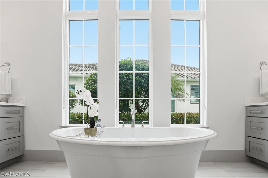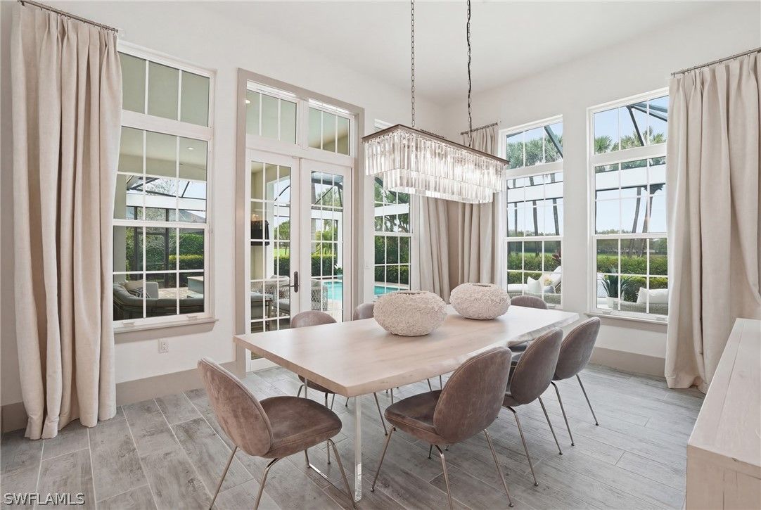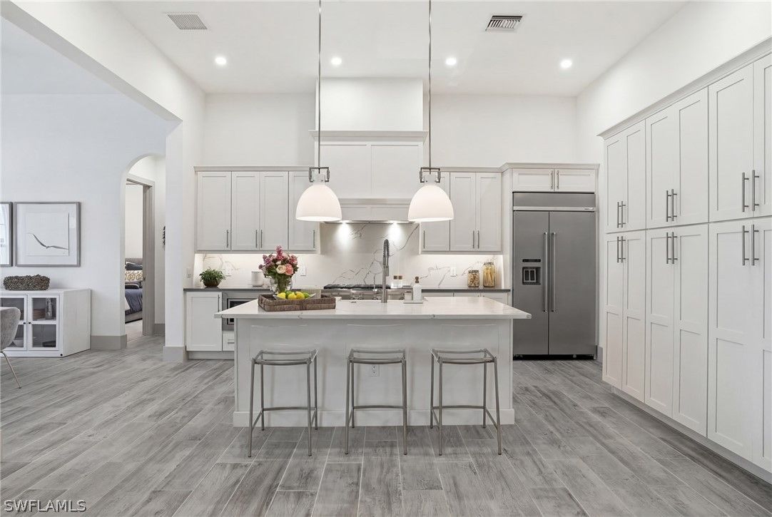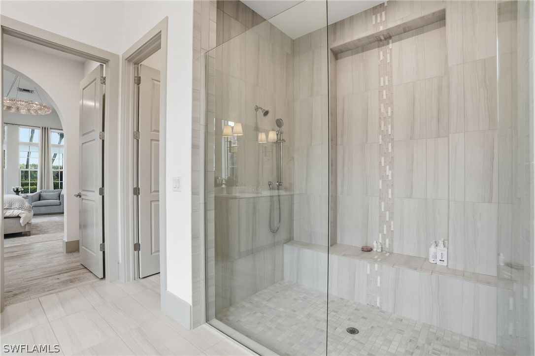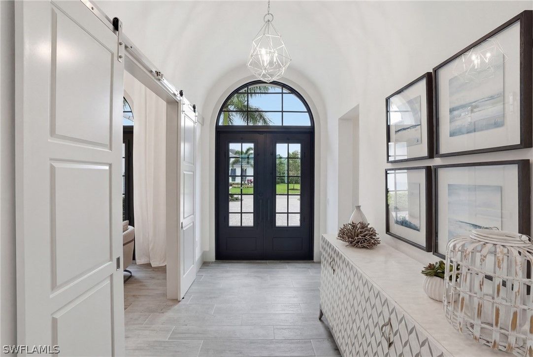 Stunning luxury coastal living in the highly sought-after Marsh Cove section of Fiddler’s Creek. Ideally located on Tavolara Lane and perfectly positioned to capture beautiful WATER and GOLF course views, this nearly 1/2-acre property blends sophisticated coastal style with quality craftsmanship and thoughtful design throughout. Offered turnkey, the home features over 3,500 square feet of living space with 4 bedrooms + den, 3 full baths, 1 powder room, and 1 pool bath. From the moment you arrive, grand arched entry doors set the tone for the coastal elegance found throughout. Inside, the light-filled great room showcases soaring vaulted ceilings with shiplap detailing, an accent wall, and a designer chandelier. From the charming built-in reading nook in the front hall to the custom window treatments and lighting throughout, every detail has been thoughtfully considered, creating a warm and inviting atmosphere. Beautiful wood-look tile flooring with rich grain runs throughout most of the home, offering the warmth of wood with effortless maintenance, while arched architectural openings add character and style. The chef’s kitchen is a true luxury upgrade, featuring commercial-grade appliances including a 48-inch range, custom hood, and oversized refrigerator. Calcutta quartz countertops, loads of white shaker cabinetry, and a large island complete this exceptional space. The main living areas overlook tranquil water and golf course views, bringing natural light and scenery into the heart of the home. The primary suite is a bright and airy retreat with a luxurious bath featuring a freestanding soaking tub, large glass shower, dual vanities with quartz countertops, a walk-in closet, and generous linen storage. Three additional guest suites are equally well-appointed, while the private den/office with barn doors includes a sleeper sofa, making it ideal for additional guests. Outdoor living is truly impressive. The expansive lanai overlooks peaceful water and golf course views and features a pool and spa with water feature, outdoor kitchen, and multiple seating and lounging areas—perfect for entertaining or relaxing in the Florida sunshine. A convenient pool bath allows easy access for guests without entering the home. Additional highlights include two new AC units, abundant storage throughout, and a spacious three-car garage. Fiddler’s Creek is an award-winning private community offering luxury residences and resort-style amenities set within a beautiful tropical landscape. The 54,000-square-foot Club & Spa features two on-site restaurants, pools, a fitness center, and tennis, pickleball, and bocce courts. Optional memberships for golf, beach, and boating are also available. Conveniently located just minutes from the beaches of Marco Island, 5th Avenue, and a variety of shopping and dining options.