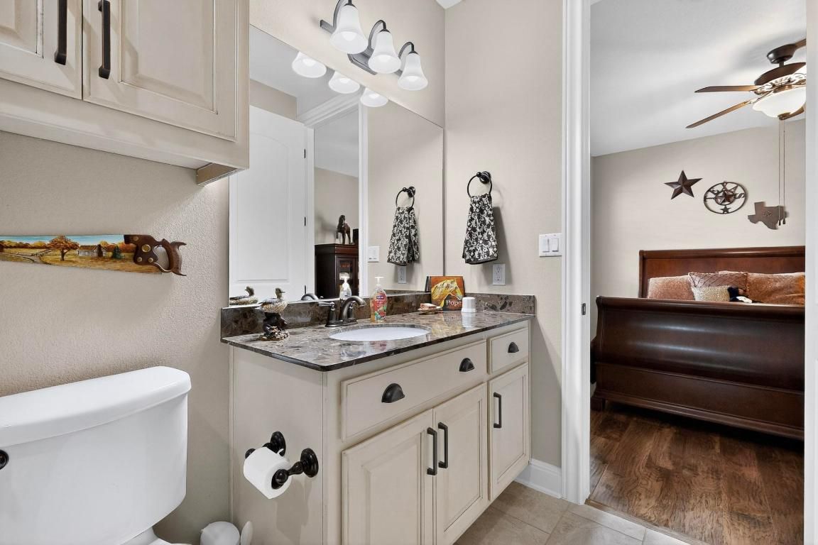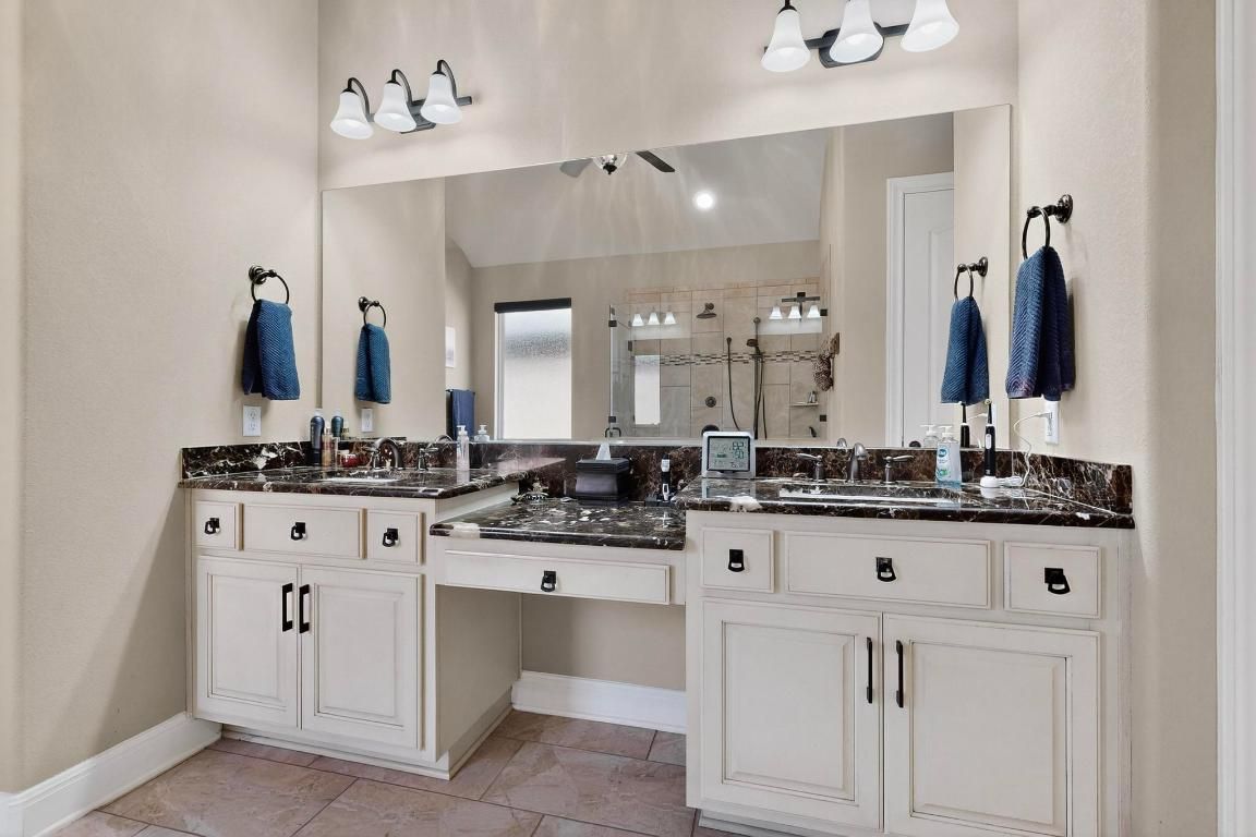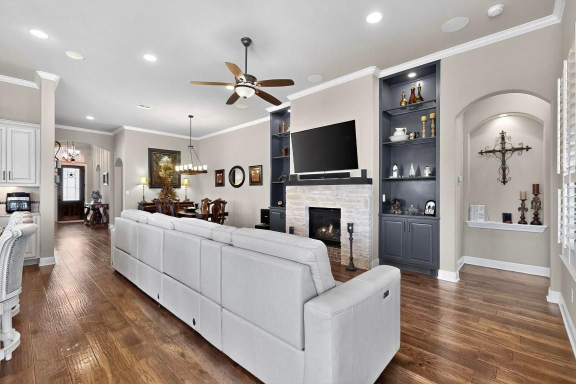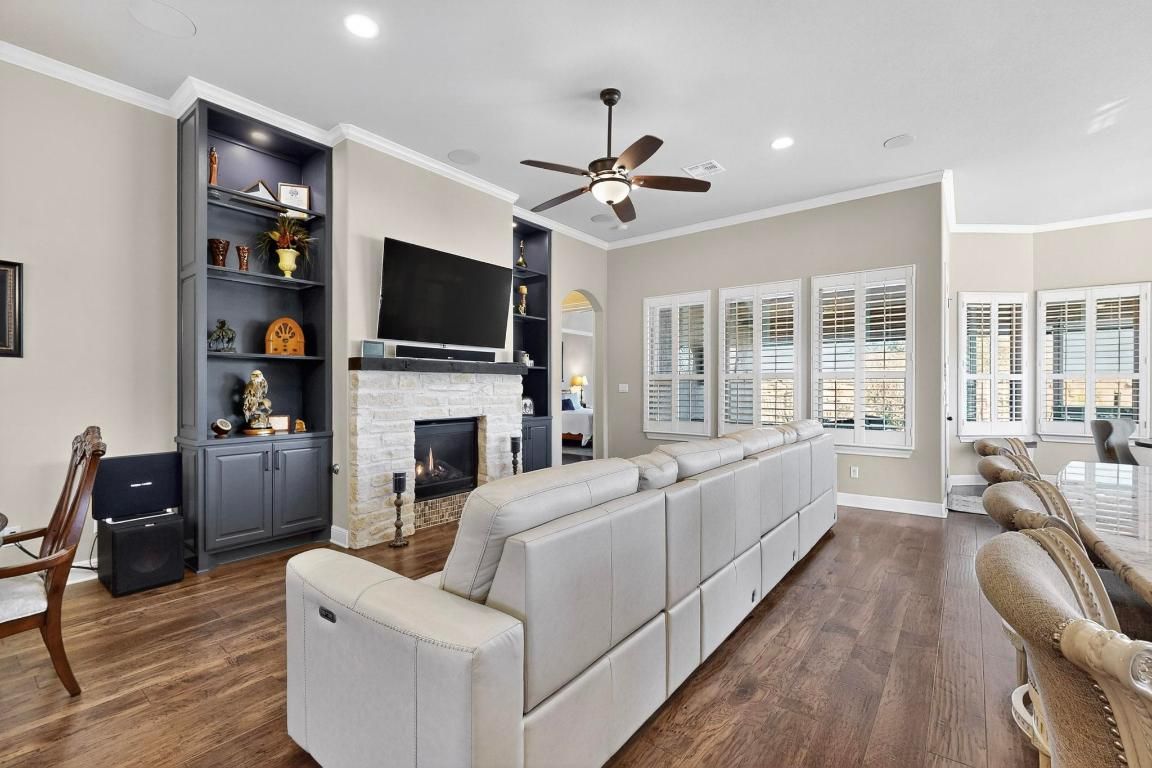 Step inside to a world of fantastic upgrades and architectural details. New Roof and gutters installed September 2025. Soaring high ceilings and grand 8-foot doorways enhance the expansive, flowing layout, complemented by beautiful wood floors, elegant crown molding, and custom shutters throughout. The heart of the home is the gourmet kitchen, an entertainer's dream featuring a gas cooktop, gorgeous granite countertops, stainless steel appliances, a large breakfast bar with pendant lighting, a charming apron sink, and a walk-in pantry. It flows effortlessly into the family room, formal dining area, and breakfast room. The family room is a welcoming retreat, showcasing custom built-ins and a cozy stone gas-log fireplace, perfect for intimate gatherings. The spacious primary bedroom suite offers a serene escape with a picturesque bay window, granite double vanity, a frameless shower, and a custom-designed walk-in closet. An executive office, complete with French doors and beautiful custom built-ins, provides the ideal work-from-home environment. A guest bedroom with an en suite bath ensures comfort and privacy for visitors. Outdoor living reaches new heights with a covered and extended patio, featuring a fully equipped outdoor kitchen with granite counters, remote controlled shades enclosing patio. The private backyard is a meticulously maintained, low-maintenance paradise with durable turf, xeriscaping, beautiful landscaping, and a striking stone wall. Enjoy resort-style amenities within this esteemed 55+ community, including sport courts, a pool, spa, clubhouse, and full workout facilities, offering an unparalleled living experience. Don't miss this rare opportunity to own a home of uncompromising quality and style. Schedule your private tour today!