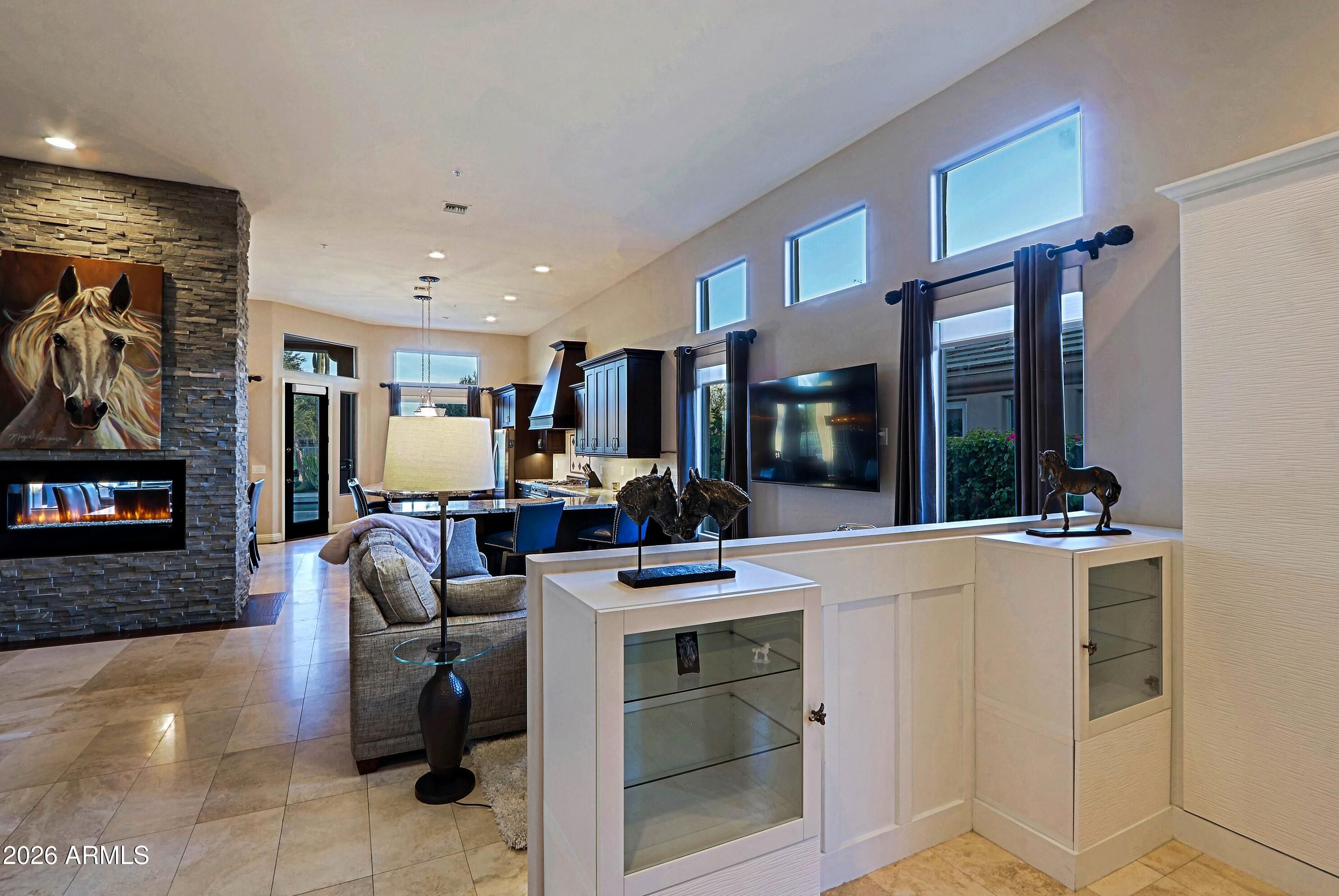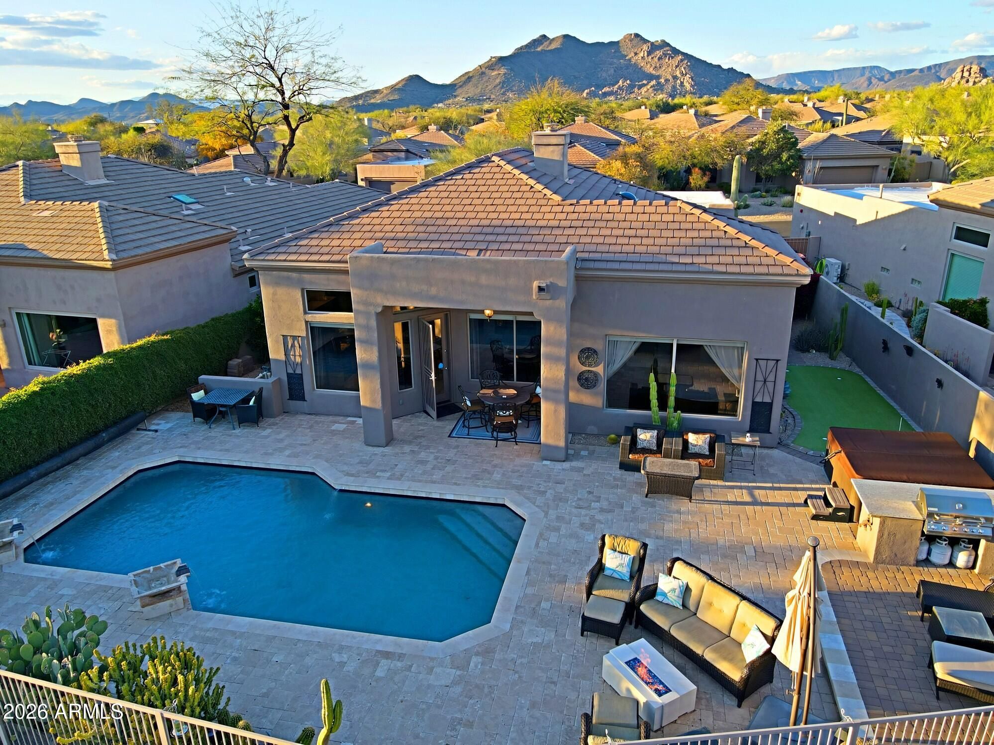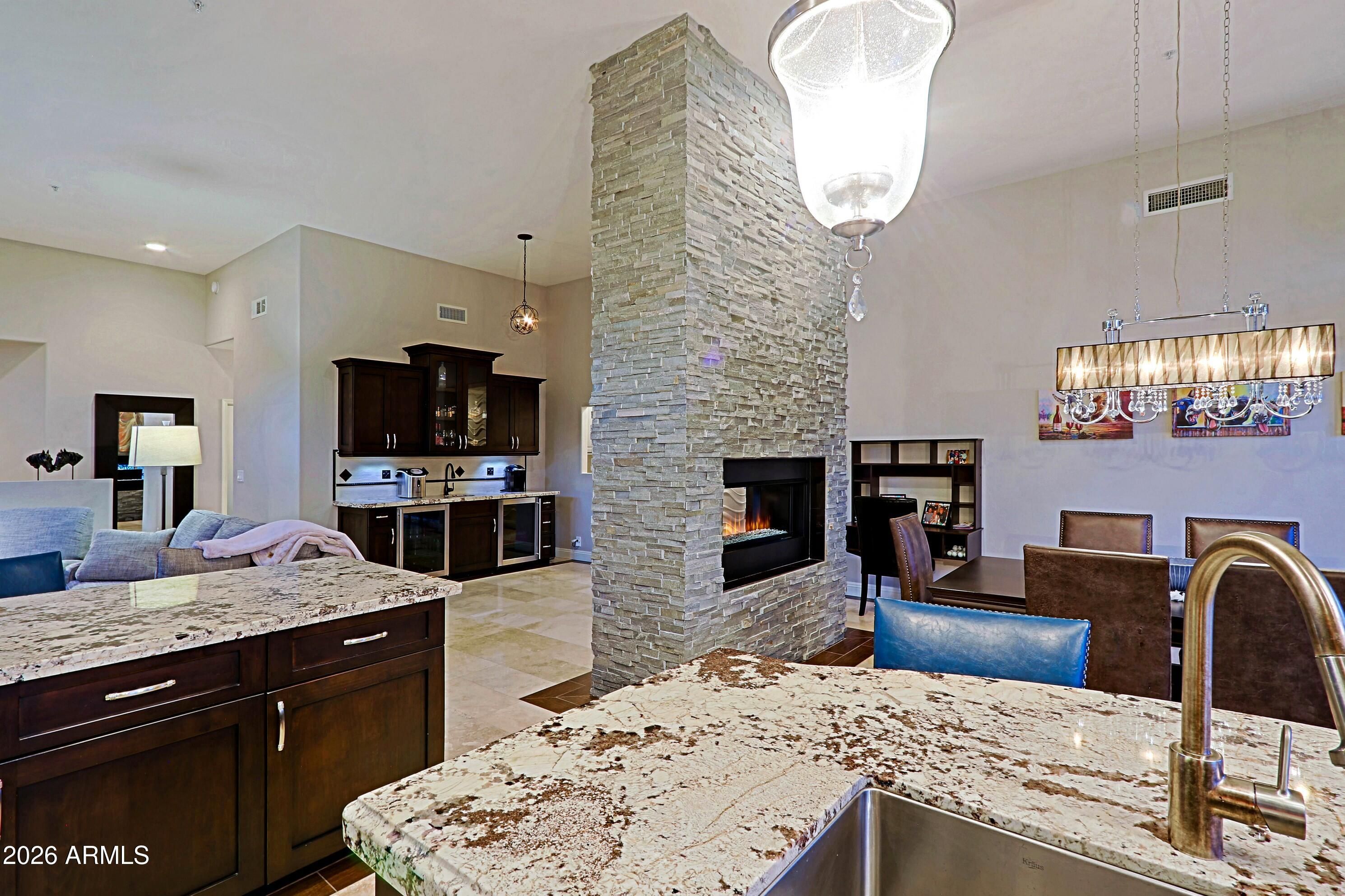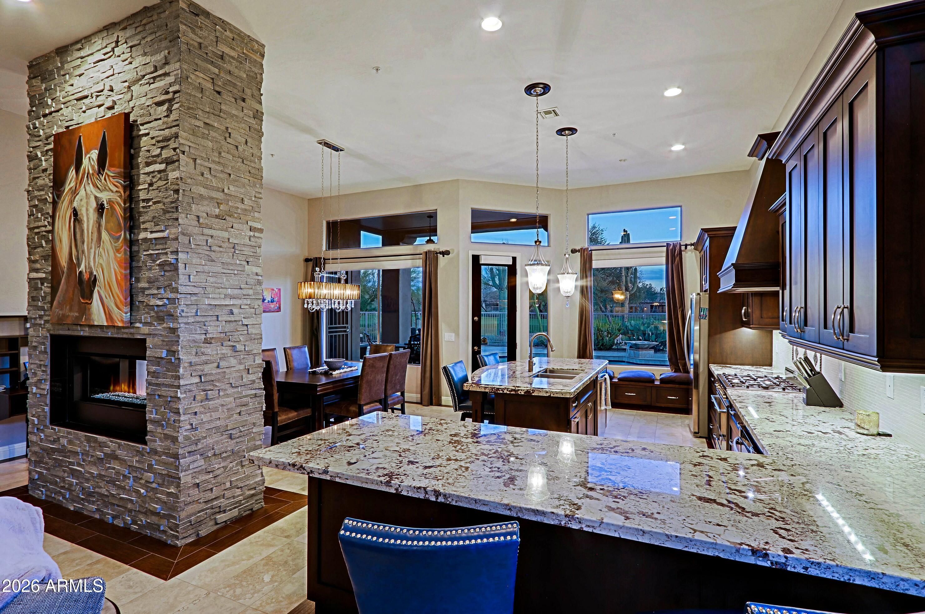 Charming and timeless Terravita home located on a premium lot with unobstructed views of the 14th fairway. Open floor plan with travertine and wood tile flooring throughout. Updated kitchen cabinetry, gorgeous granite counters, stainless steel appliances including a Bertazoni range and oversized hood. Beautiful two-way fireplace at the dining/great room with stacked stone. Complete with a wet bar with a separate beverage and wine refrigerator. Primary bath has an oversized shower with double shower heads and marble counters. The backyard is a true desert oasis boasting travertine pool decking, a stunning salt water & heated pool with contemporary water features, BBQ and firepit offering the perfect entertaining spot for guests. Make this stunning home your own!