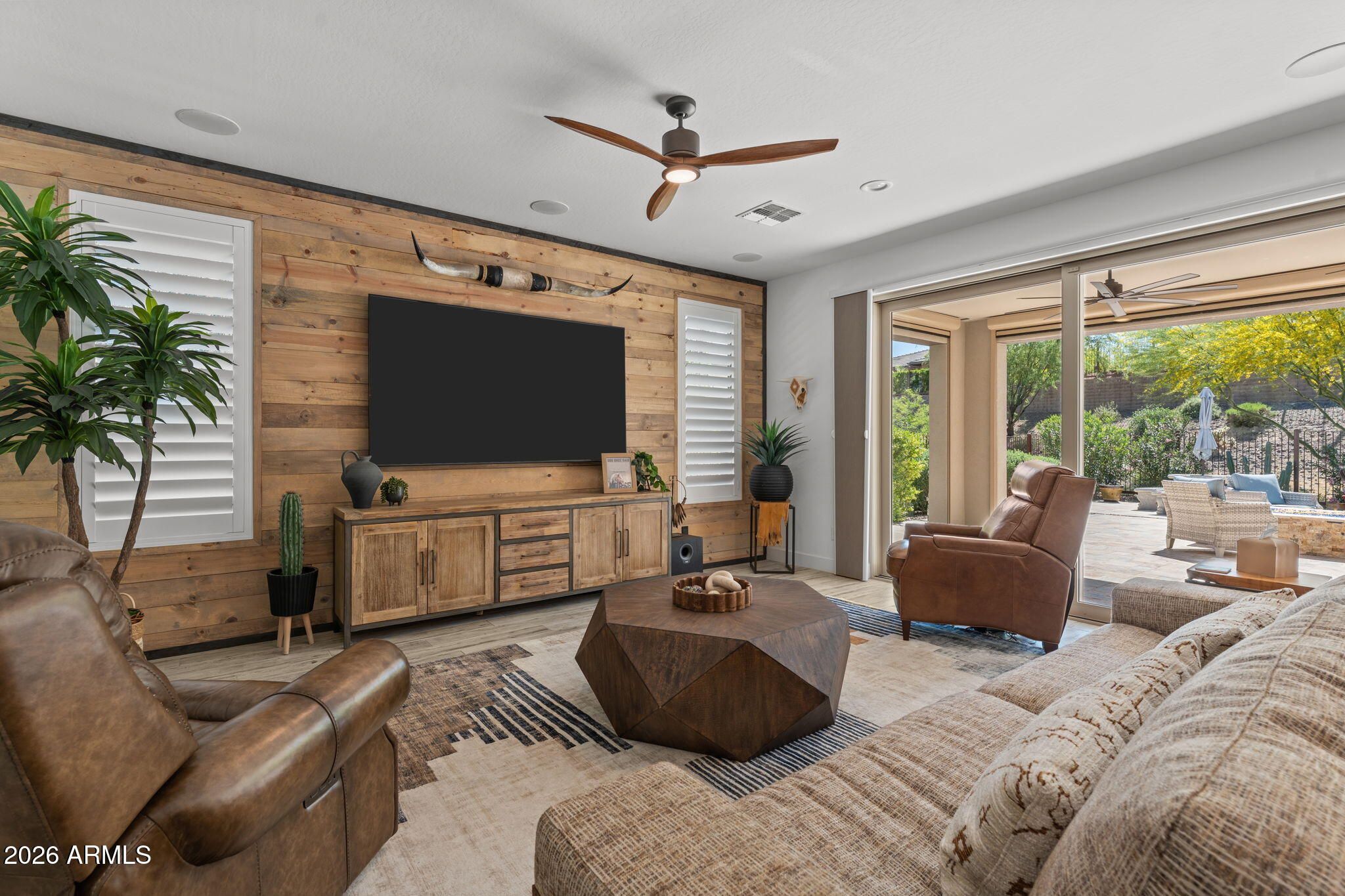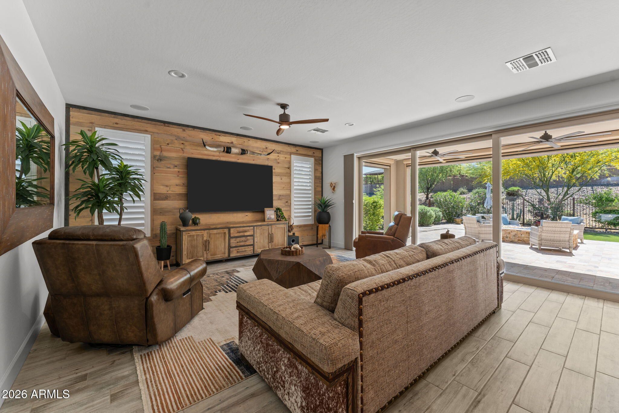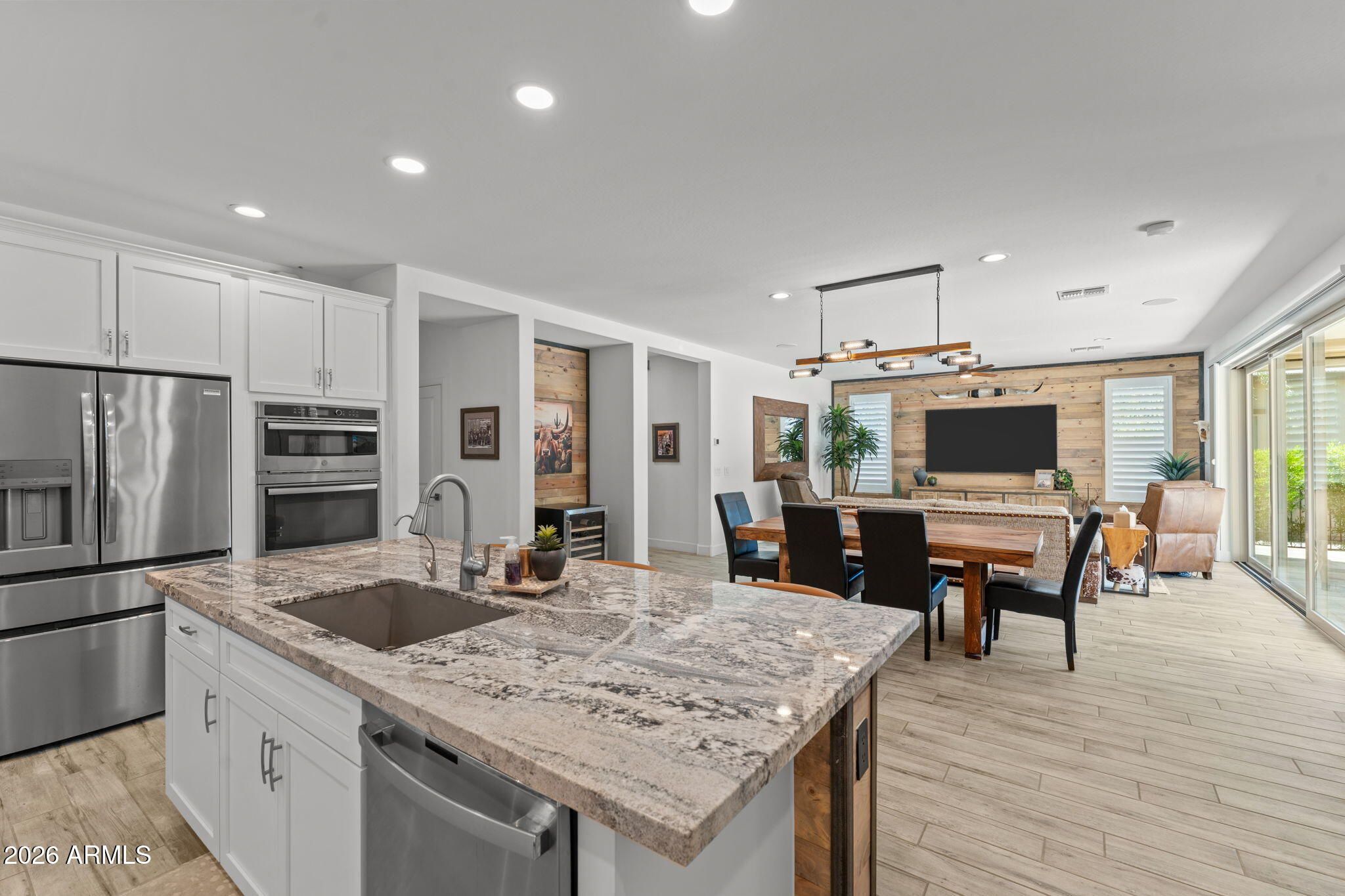 Experience effortless desert luxury in the highly sought-after Wickenburg Ranch community. This beautifully maintained home features fresh interior paint and a bright, open-concept design ideal for both everyday living and entertaining. The well-appointed kitchen flows seamlessly into the main living space, creating an inviting, upscale atmosphere. A versatile den/office offers flexibility as a third bedroom--perfect for hosting guests. Step outside to your private backyard retreat with a covered patio, built-in fire pit for cool Arizona evenings, and newly installed turf for easy, low-maintenance, lock-and-leave living. Enjoy resort-style amenities including golf, dining, fitness, pickleball, and a vibrant social lifestyle.