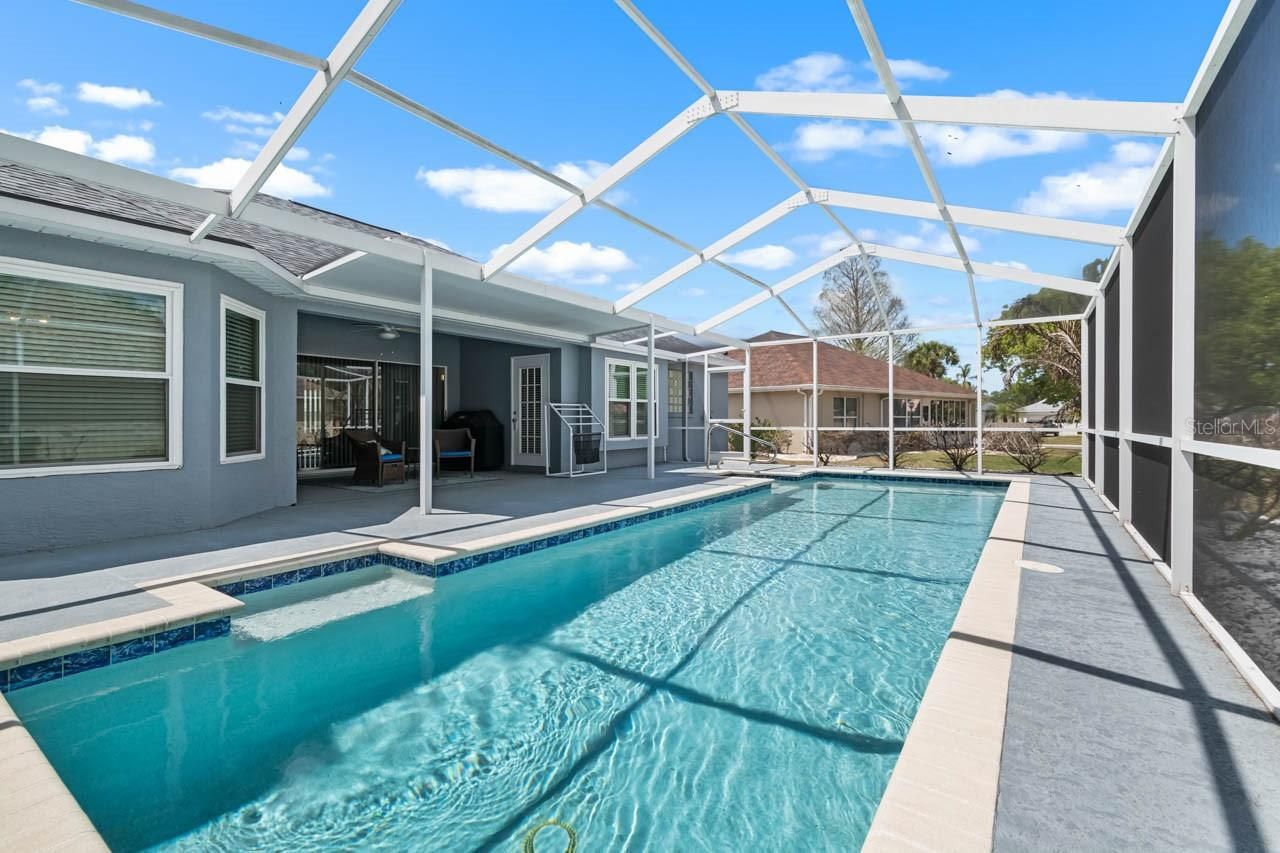 Welcome to this stunning home in the desirable Caloosa Golf & Country Club neighborhood of Sun City Center! This beautifully updated 2-bedroom + office, 2-bath, pool home offers the perfect blend of comfort, style, and peace of mind. From the moment you arrive, you’ll appreciate the great curb appeal, with mature landscaping and a welcoming exterior that sets the tone for what’s inside. Step inside to find vaulted ceilings and NO carpet throughout, creating a bright, open, and low-maintenance living space. The kitchen features granite countertops and stainless steel appliances, ample cabinetry, and a convenient eat-in dining space. The primary suite features a large walk-in closet and an ensuite bath complete with a separate soaking tub and walk-in shower, updated vanities and granite counters. The second bedroom provides comfort for visiting friends and family, while the flexible office/den is ideal for a home office, hobby room, or additional guest space. The guest bath features an updated vanity and granite counters. Enjoy seamless indoor-outdoor living with three entryways to the screened lanai, perfect for entertaining or relaxing in your own backyard oasis featuring a refreshing, sparkling pool and patio area. The 2-car garage adds extra storage and convenience. Major upgrades include a new roof (2023), AC (2021), and 17 impact windows (2022), providing energy efficiency and storm protection. Bonus: Furniture and golf cart can be included, making this a true move-in-ready opportunity. Located in the sought-after Caloosa Golf & Country Club neighborhood, you’ll enjoy a vibrant 55+ lifestyle with golf, recreation, and social activities right at your doorstep. This home truly checks all the boxes—schedule your showing today!