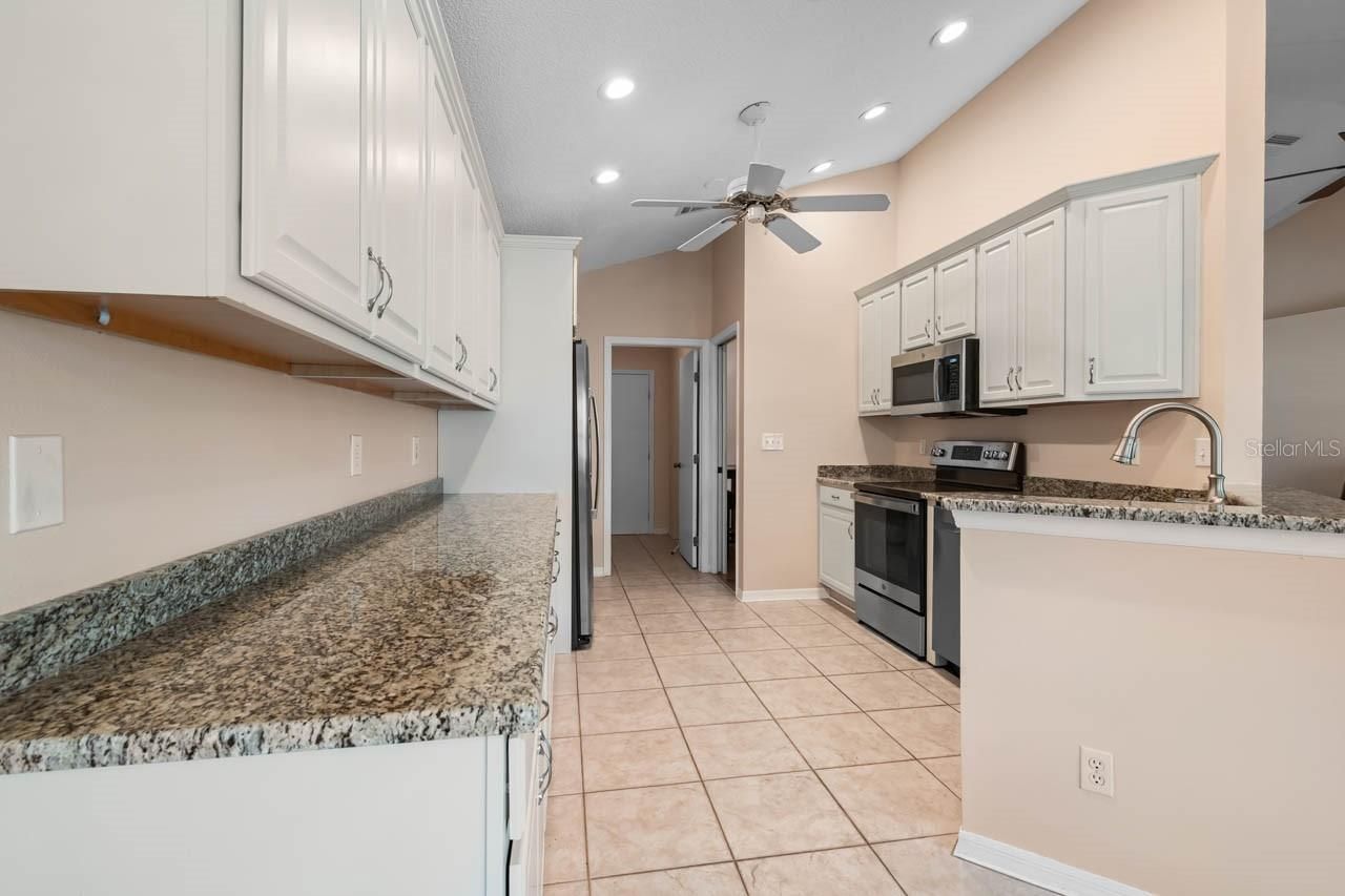 - Cathedral Ceiling(s), Ceiling Fan(s), Eat-in Kitchen, Living/Dining Room, Stone Counters, Thermostat, Window Treatments