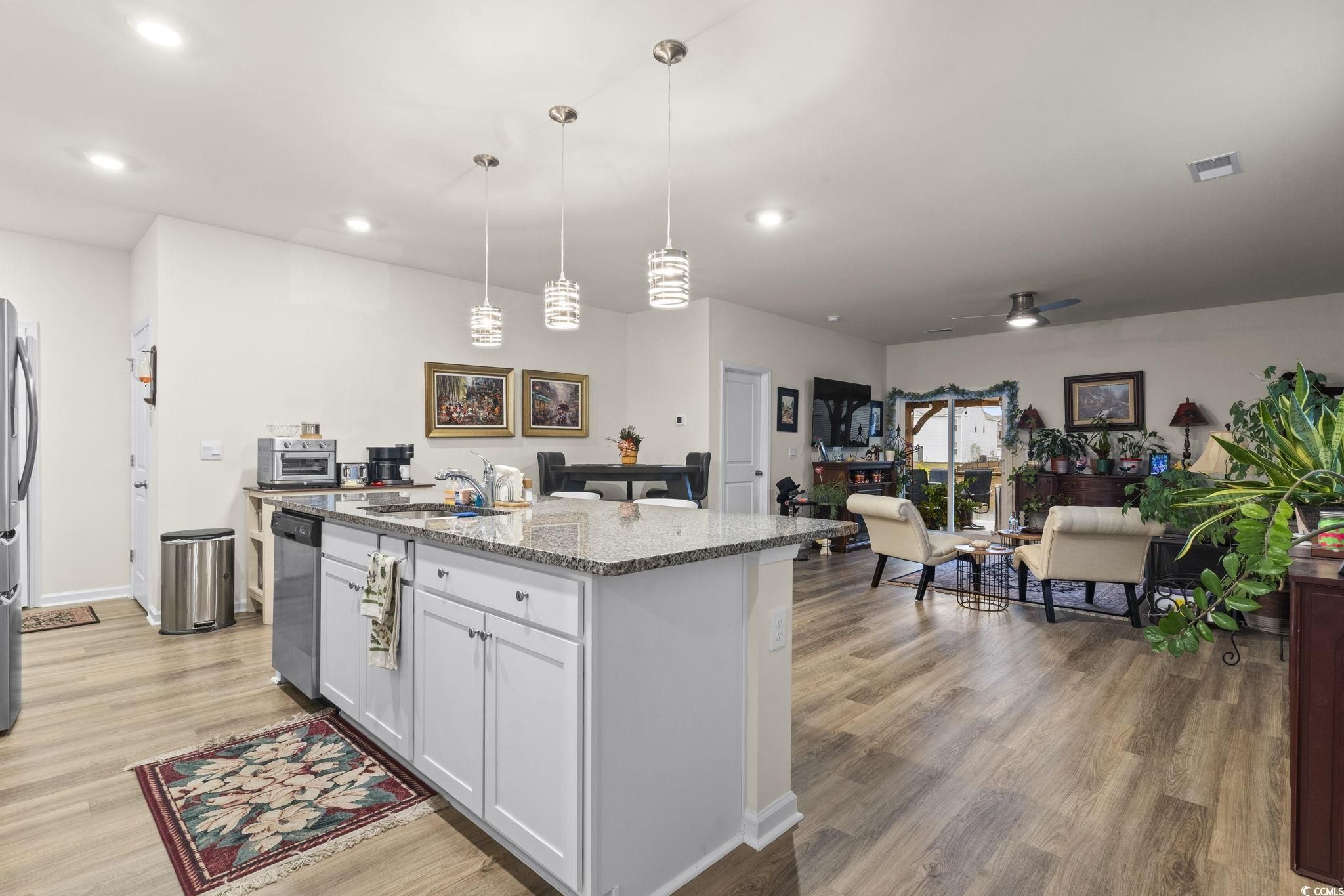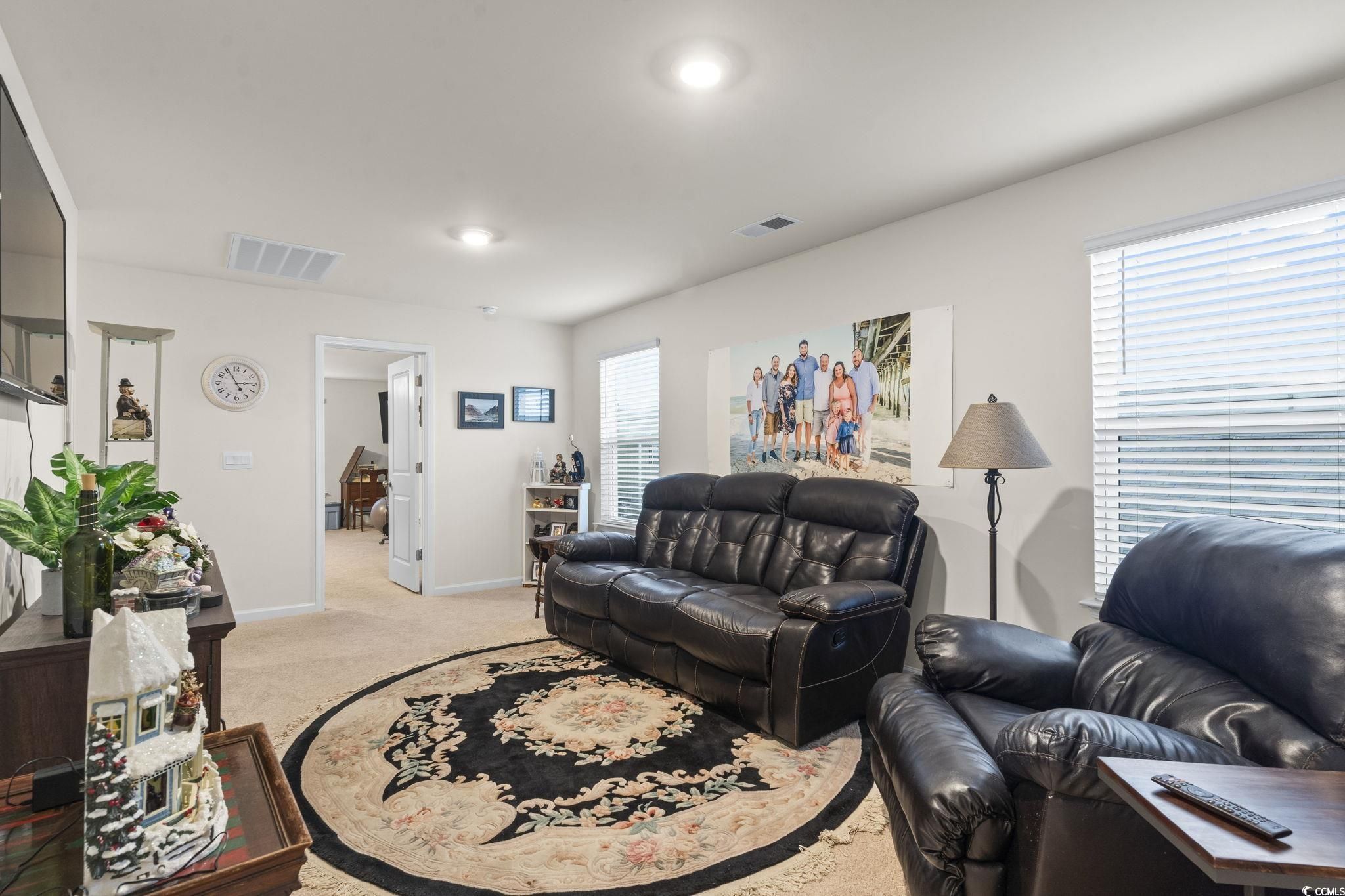 Welcome to 327 Vacarro Drive, a meticulously maintained and recently enhanced 2023-built home situated on a tranquil pond in the highly desirable Island Green community. This stunning property seamlessly blends the contemporary design of the sought-after Wren B floorplan with key owner upgrades, offering a truly Coastal Carolina lifestyle. The moment you step through the door, the home’s open-concept design immediately impresses. Bathed in natural light, the main living area is designed for entertaining and comfortable daily life. The large open concept features the kitchen complete with an oversized central island illuminated by newly added Pendant lighting, providing ample workspace, casual seating, and a focal point for gatherings, as well as, durable solid surface countertops, stainless steel appliances(Range, Microwave and Dishwasher) and abundant cabinetry. The kitchen flows smoothly into the spacious great room, a perfect retreat for relaxation. From here, you gain a beautiful perspective of the private backyard and the pond view that defines this property’s serene atmosphere. One of the most practical features of the Wren B plan is the strategic placement of the Primary Suite on the main floor. This private retreat offers the convenience of single-level living. The suite is generously sized and includes a large walk-in closet. The accompanying Primary Bathroom is appointed with modern fixtures, a standing shower, and a double vanity. Beyond the core living spaces, the current owners have invested in improvements that significantly enhance both the home’s aesthetic appeal and its practical functionality. The most exciting new addition is the brand-new private back patio. This patio dramatically extends the usable living space outdoors.Say goodbye to sun and rain worries! Relax and entertain beneath the generous fully covered (roofed) patio structure, offering a cool, shaded retreat and stunning pond views making it a perfect spot for morning coffee or simply unwinding after a long day. Inside, the organization and efficiency of the bar area have been maximized with the installation of custom sliding drawers. Furthermore, the home’s exterior maintenance has been addressed with the installation of new gutters and an enhanced irrigation system which both protect the foundation and ensure a beautifully maintained landscape with minimal effort. Tthe upper level reveals the home’s remarkable flexibility. A bright and airy loft space greets you at the top of the stairs, offering a versatile area that can be utilized as a reading nook, homework station, or secondary lounge. Adjacent to the loft is a substantial bonus room, an ideal flex space that can easily accommodate a home office, media room, dedicated gym, or a large play area. Three additional well-sized bedrooms are also located upstairs, as well as, 2 full bathrooms, making this floorplan ideal for growing families, hosting long-term guests, or having dedicated hobby space. As a recent 2023 construction, the home includes the builder’s America's Smart Home package, providing modern connectivity and security features. The spacious two-car garage offers secure parking and additional storage potential. Located in the popular Island Green community, residents enjoy convenient access to all the Coastal Carolina region has to offer—from the beaches of Myrtle Beach, golf courses, the Marshwalk, Brookgreen Gardens and dining choices.