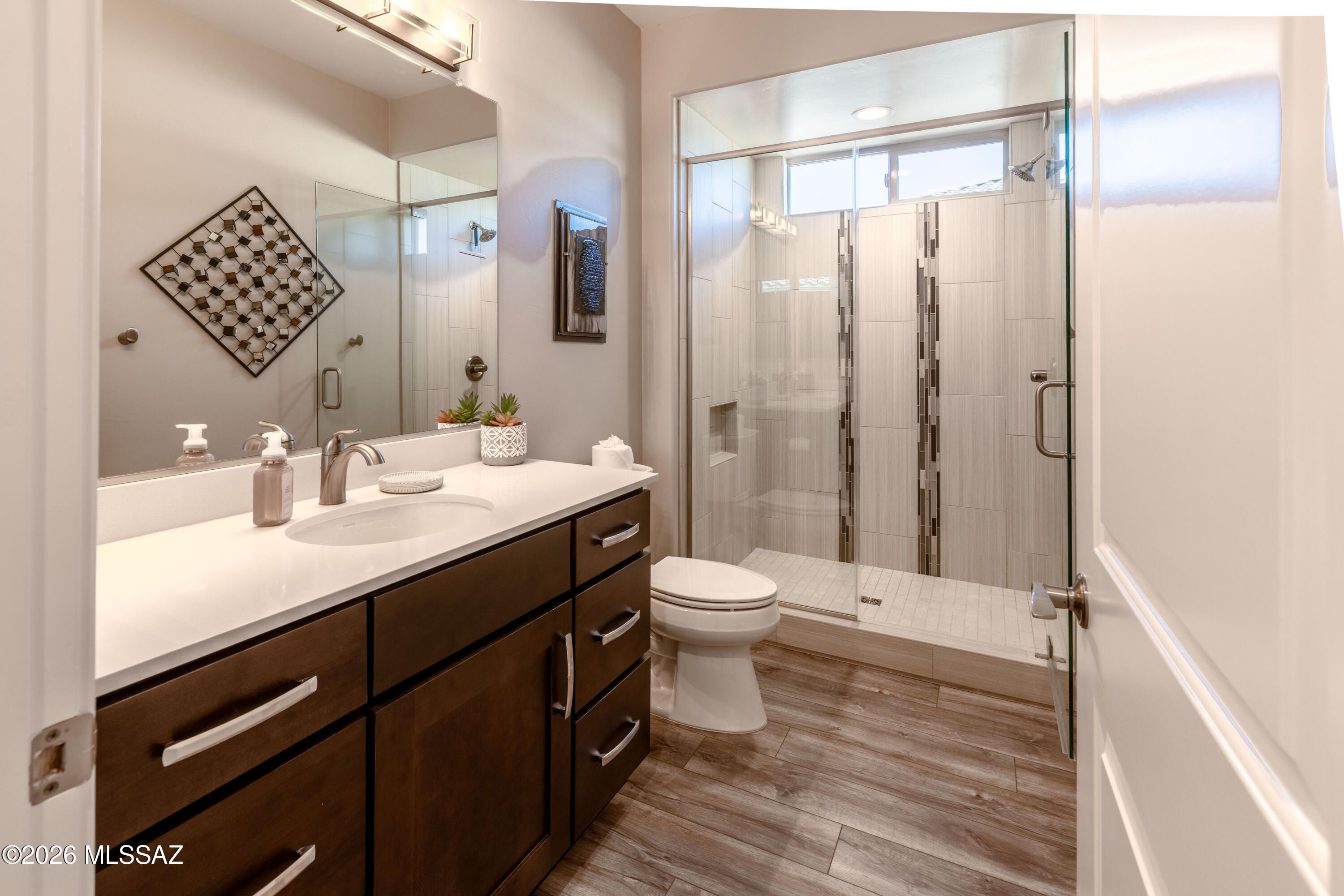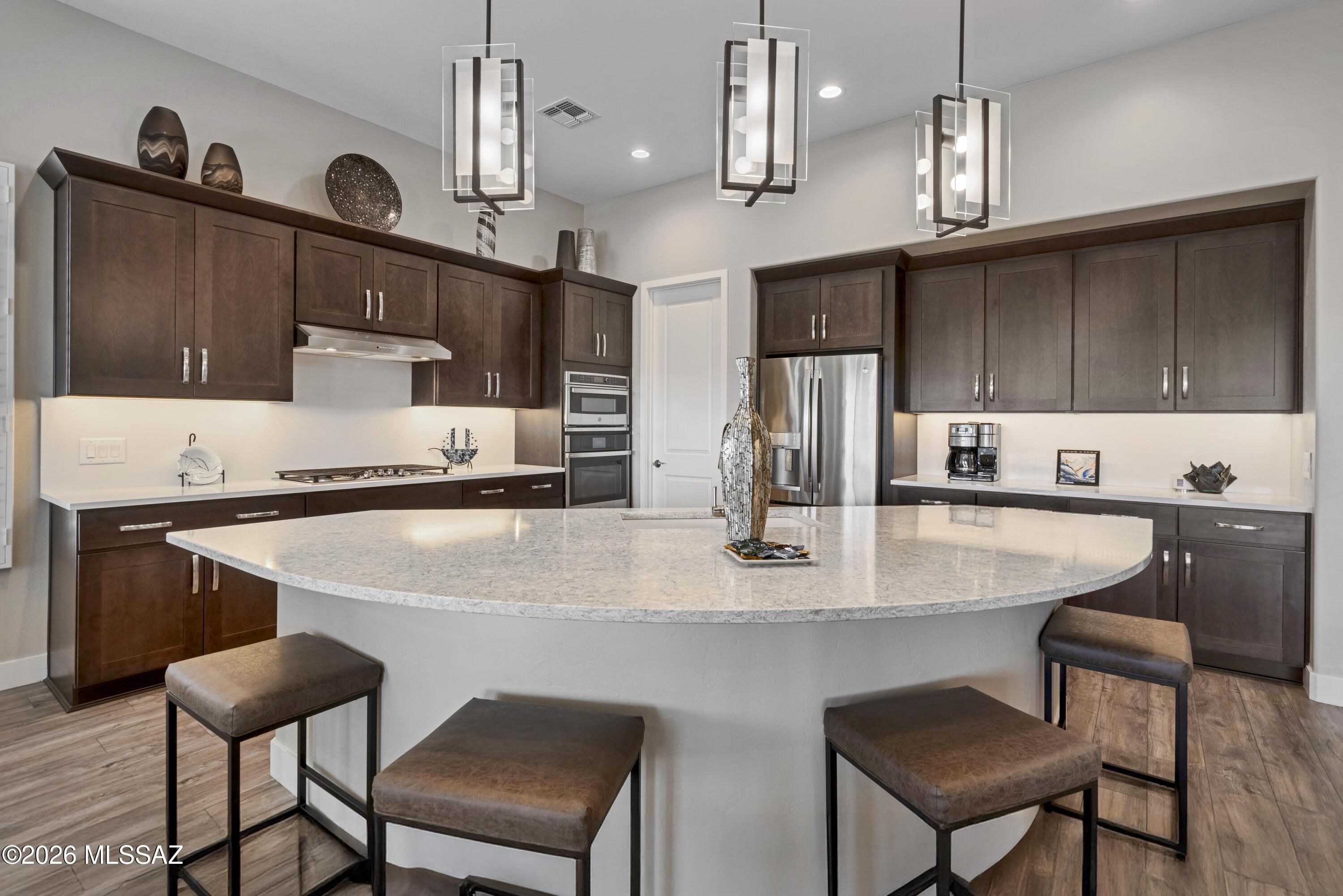 An Ideally located, Highly Upgraded, and Expanded 2594 Sq. Ft Vienta Exterior Design that has the Optional 3rd Bedroom Suite w/Shower making this a true ''Bedroom 3 Ensuite''. The home's additional amenities are a Powder room; Spacious Den that is pre-wired for surround sound speakers; Great Room w/Media Alcove and Dry Bar that has been pre-wired for a beverage cooler; Laundry Room w/Extra Storage; Primary Bedroom Suite w/Shower and separate Tub, and Walk-In Closet, and Vanity; 2nd Bedroom En Suite w/Walk-In Closet, Shower/Tub, and Walk-In Closet; 3rd Bedroom En Suite; Kitchen w/Entertainer's Kitchen Island, Walk-In Pantry, under Cabinet Counter lighting; and a 3-Car Extended Garage w/H2o Concepts Water Filtration System. The backyard is fully landscaped and includes Tucson Rolling