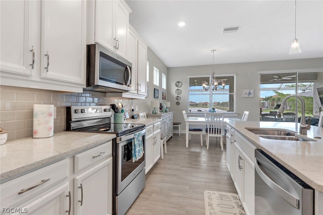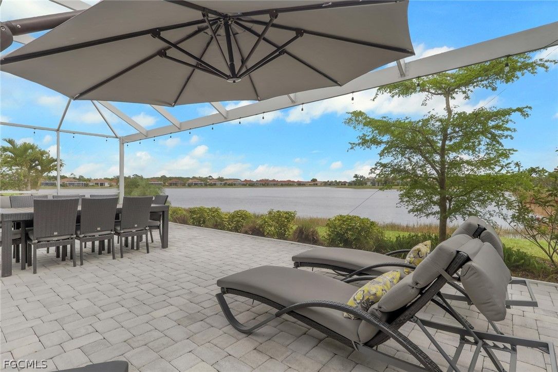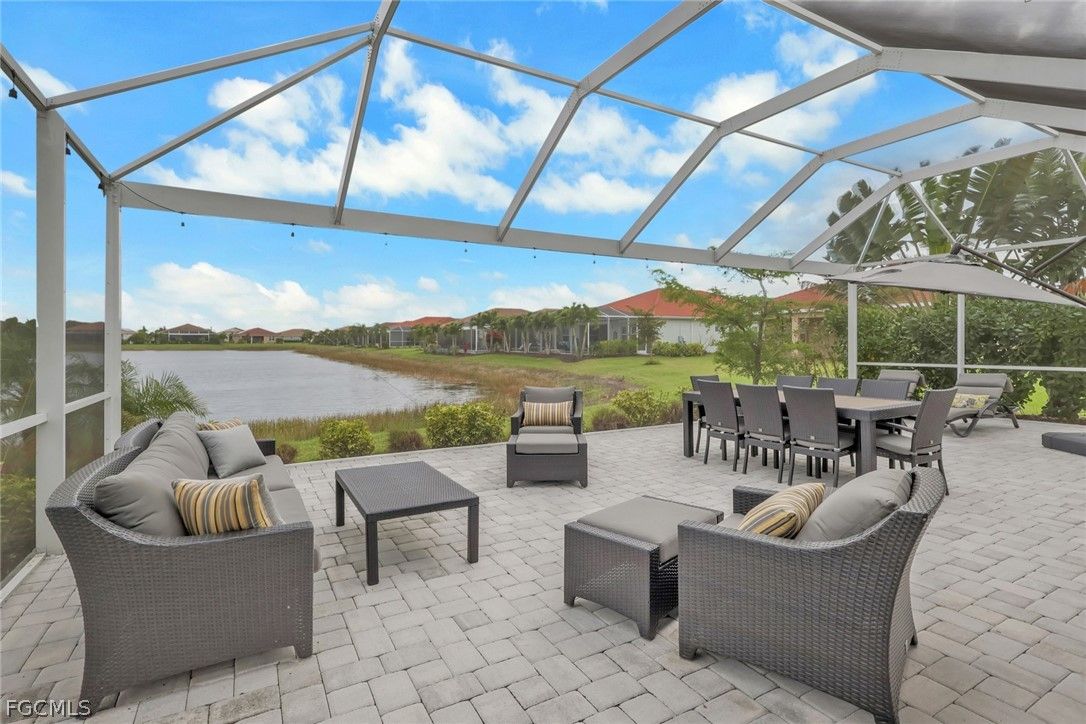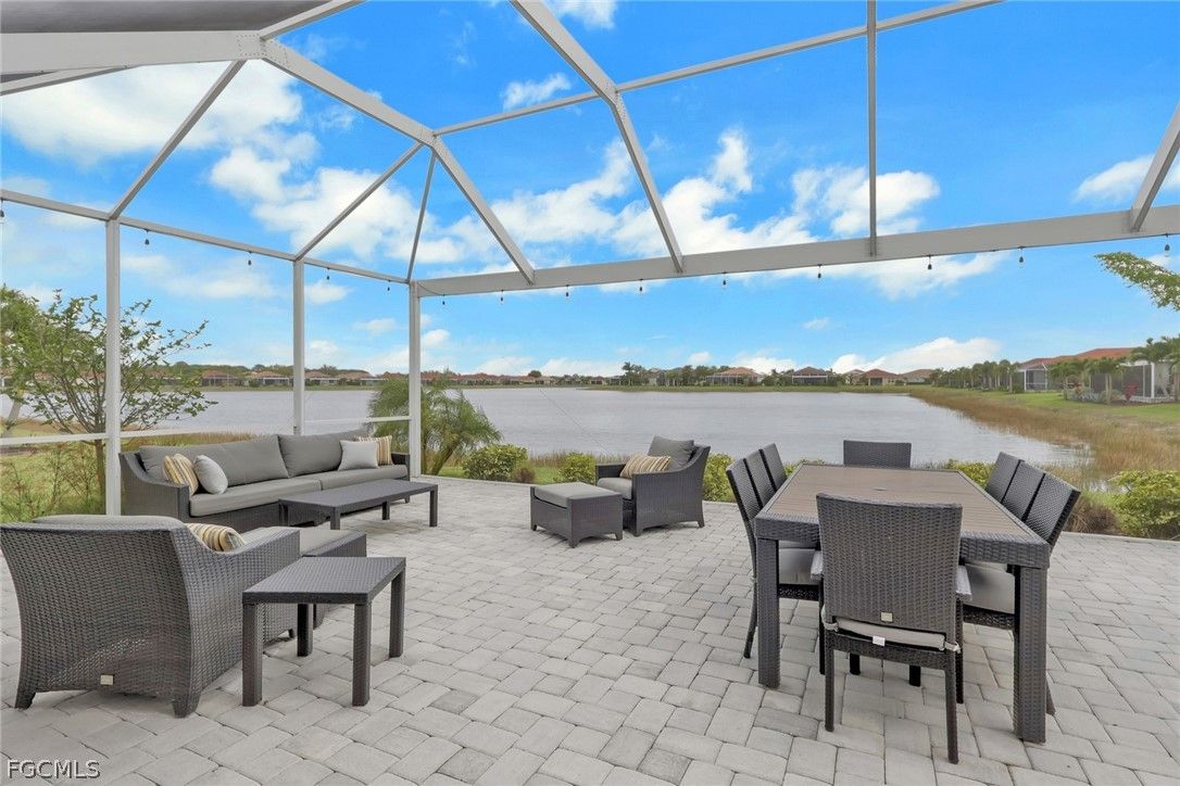 Luxury waterfront living in Cascades at River Hall, a fabulous 55+ active adult community. This stunning open concept home with tile flooring throughout boasts 3 bedrooms, a 4th bedroom/office, 2 bathrooms, and a large 3 car garage. The kitchen is a chef's delight with quartz counters, stainless steel appliances, and a large island for casual entertaining/dining. The expansive water views are visible from the kitchen, dining and living areas. Step outside to your private, screened 20 x 40 lanai with 40 foot-wide picture window to enjoy the spectacular expansive lake view with plenty of room entertaining making your backyard a paradise. The community offers an extensive list of social activities planned all year round, including pickleball, bocce, and tennis courts for the active lifestyle you deserve. Low HOA fees include all your lawn care, access to the fitness center, resort-style heated pool, and community room for gatherings with family, friends and/or neighbors. This is a great opportunity to live in luxury and comfort in a prime location close to shopping and dining. Make this house your forever home and start living the lifestyle you deserve.