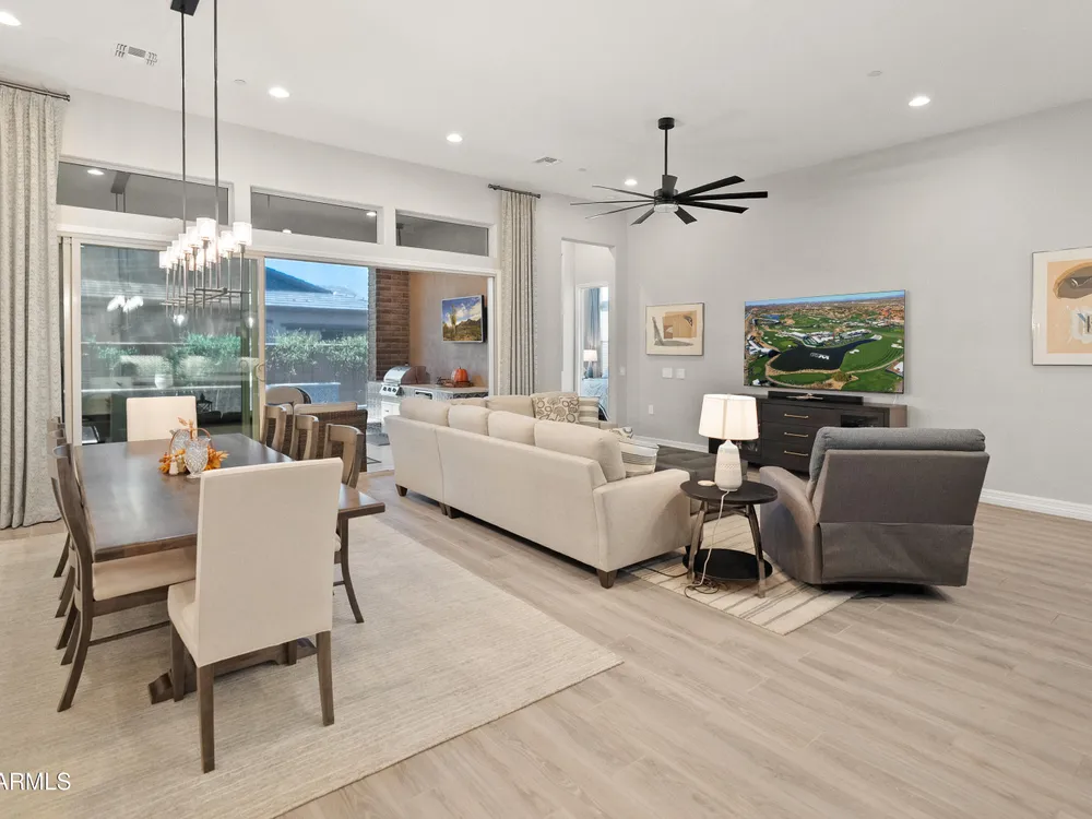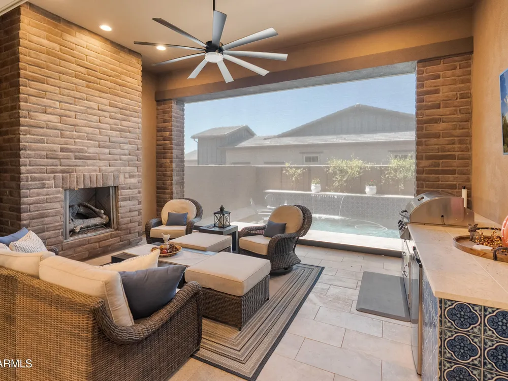 Located in a gated 55+ community, this beautifully designed home showcases tall ceilings and elegant finishes throughout. The modern kitchen features a large quartz island, stainless steel appliances, double Monogram ovens, gas cooking, and a walk-in pantry. Just off the kitchen, a cozy office nook adds functionality and charm. Enjoy seamless indoor-outdoor living with a pocket sliding door that opens to a private patio complete with a fireplace, BBQ, pool, and retractable screen—perfect for relaxing or entertaining. The community offers pickleball courts, a pool, and is conveniently located near Asher Hills Community Park.