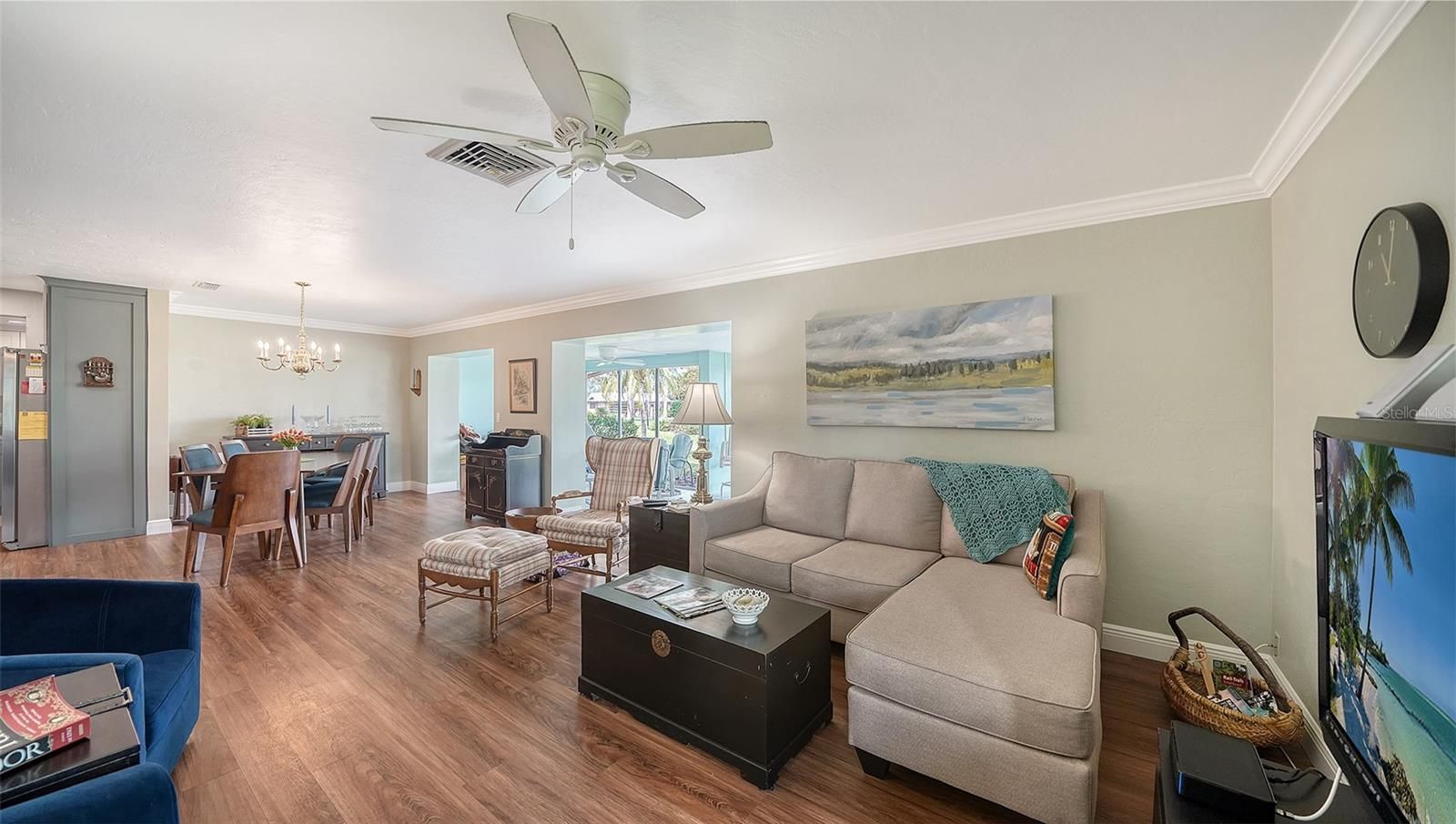 - Built-in Features, Ceiling Fan(s), Crown Molding, Open Floorplan, Main Level Primary, Solid-Wood Cabinets, Thermostat, Walk-In Closet(s)