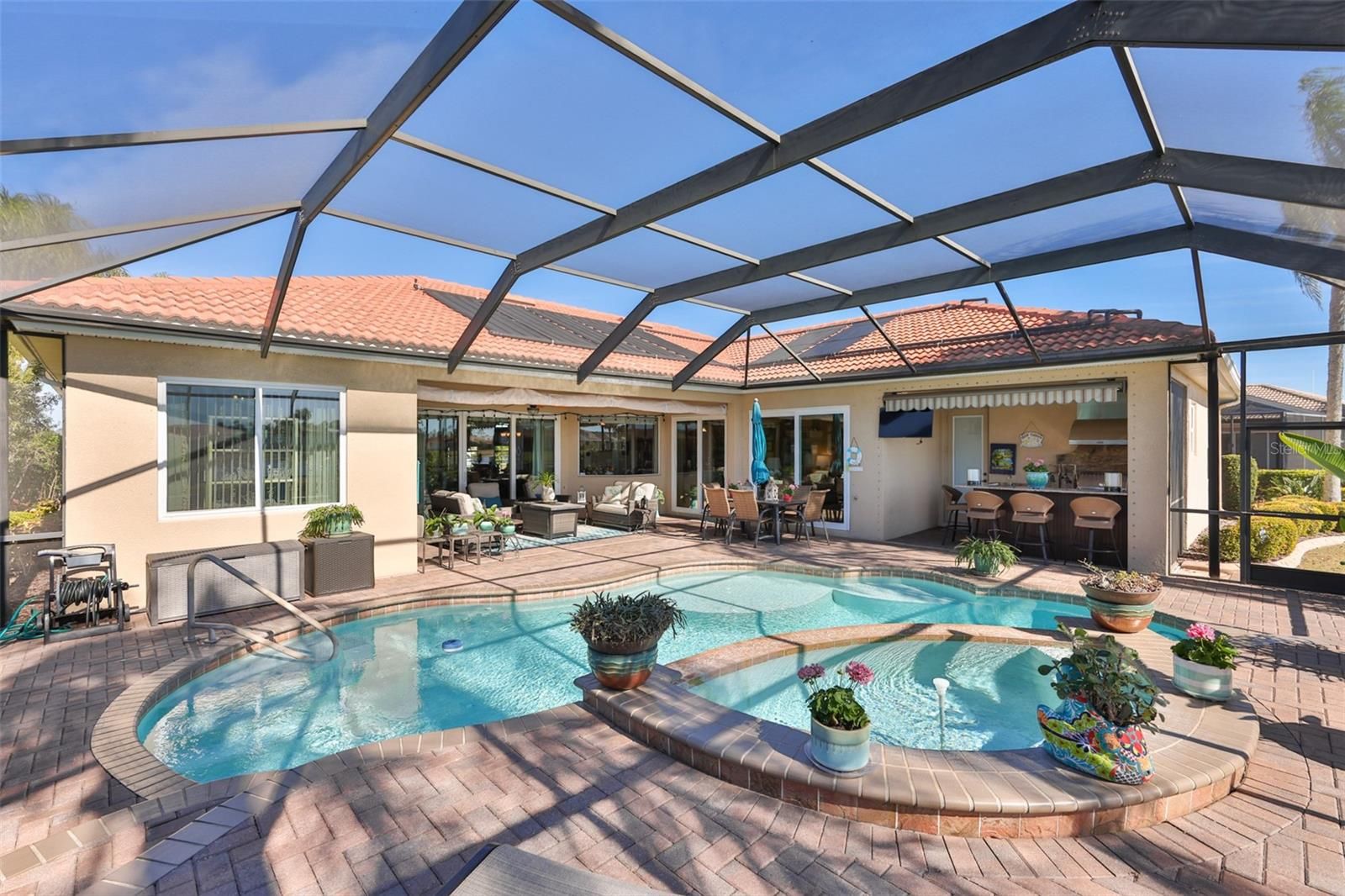 Click On Interactive Tour Above ----- GORGEOUS HOME W/POOL & SPA, STUNNING WATER VIEWS AND UPGRADES GALORE! Welcome to this immaculate and perfectly maintained executive home on a large PREMIUM WATER VIEW LOT, in the resort-style, 55+ community of Renaissance. Step inside the beautiful screened entryway w/UPGRADED DOUBLE DOORS and be wowed by the terrific WATER VIEWS ALL ACROSS THE REAR OF THE HOME. The elegant living room/dining room combo with ENGINEERED HARDWOOD FLOORING (2021), is the perfect space for entertaining, and has a wall of sliders for easy access to the lanai area. The fabulous UPGRADED EAT-IN KITCHEN (2023) has 42 inch wood cabinetry w/pullouts, stainless appliances, including a natural gas cooktop, counter height quartz waterfall counters & breakfast bar, marble backsplash and modern gold faucets. The comfortable family room has a custom built-in entertainment center w/cabinets, surround sound ceiling speakers and another wall of sliders leading to the lanai. The EXTENDED owner's suite has a private entrance to the lanai, CALIFORNIA CLOSET ORGANIZERS, luxurious ensuite bathroom with walk-in shower and separate vanities. The other 3 spacious bedrooms and full bathroom are at the opposite end of the home for privacy. The 4th bedroom is currently being used as an office with BUILT-IN CALIFORNIA CLOSET OFFICE SYSTEM w/MURPHY BED. The home also has a full INTERIOR POOL BATH for added convenience. The extraordinary lanai (SCREENED 2025) boasts a large heated pool w/ spa, covered shady area, OUTDOOR KITCHEN (2025) W/GRANITE COUNTERS, MARINE GRADE CABINETS W/LYNX GRILL/ROTISSERIE, REFRIGERATOR, ICE MAKER, SINK & RETRACTABLE AWNING. Other home upgrades are, HVAC (2025), SOLAR PANELS FOR POOL (2022), POOL EQUIPMENT (2020), WATER SOFTENER (2020), HURRICANE SCREEN FOR LANAI COVERED AREA & ALL EXPOSED WINDOWS ARE IMPACT (2017), WHOLE HOUSE GENERATOR and OVERSIZED GARAGE W/CEILING STORAGE LOFT. A ONE YEAR HOME & POOL WARRANTY will also be provided. This home is just a short golf cart ride away from the neighborhood Club Renaissance where you can enjoy dining, drinks, spa, fitness classes, social activities and so much more. So come and tour this beauty today and discover why you'll want to call it home!