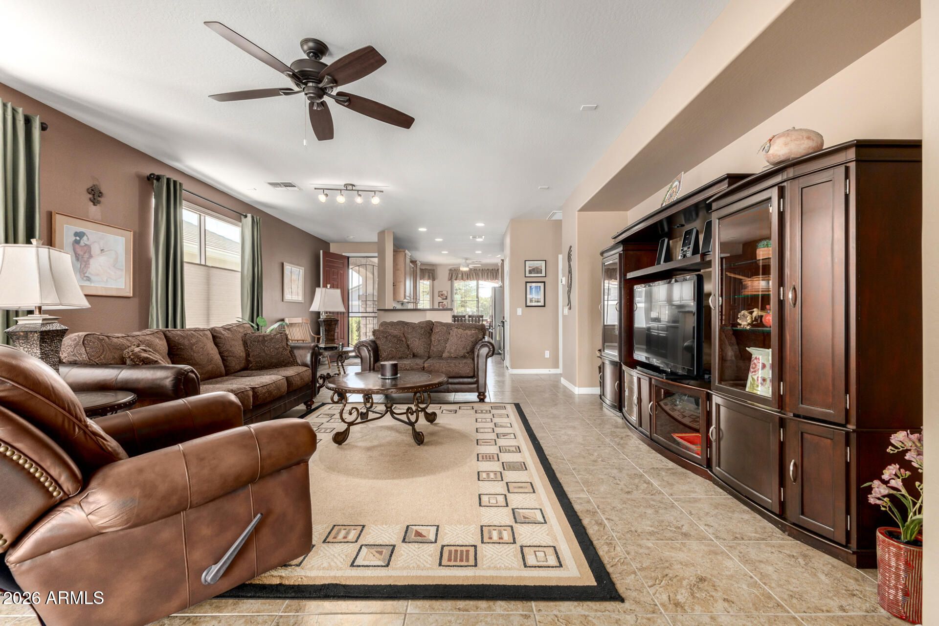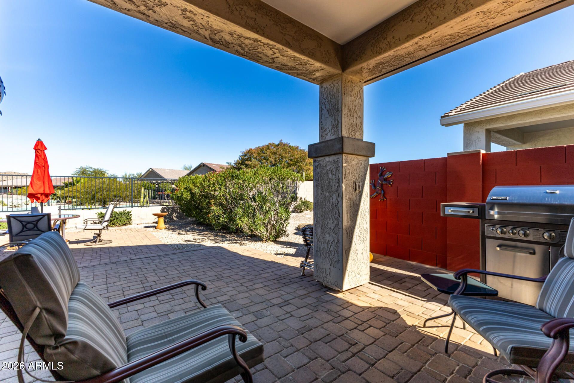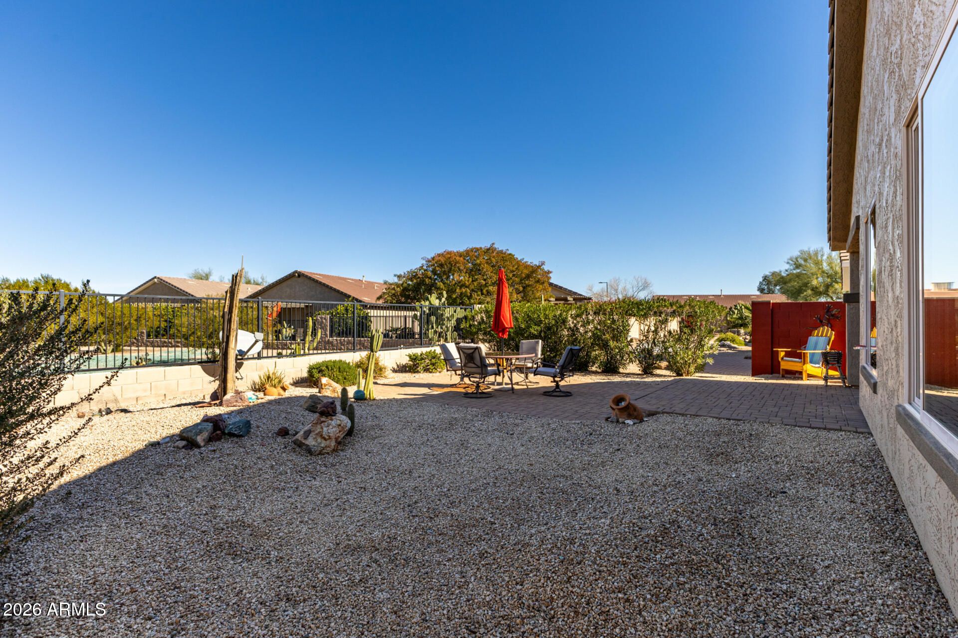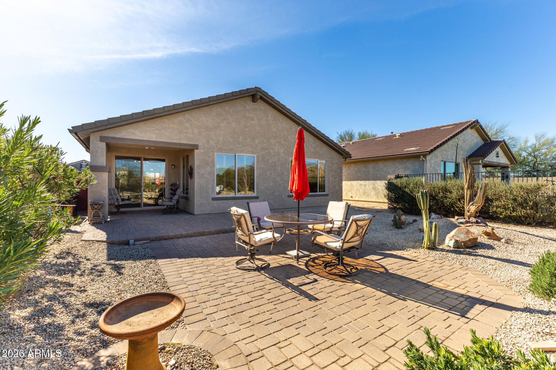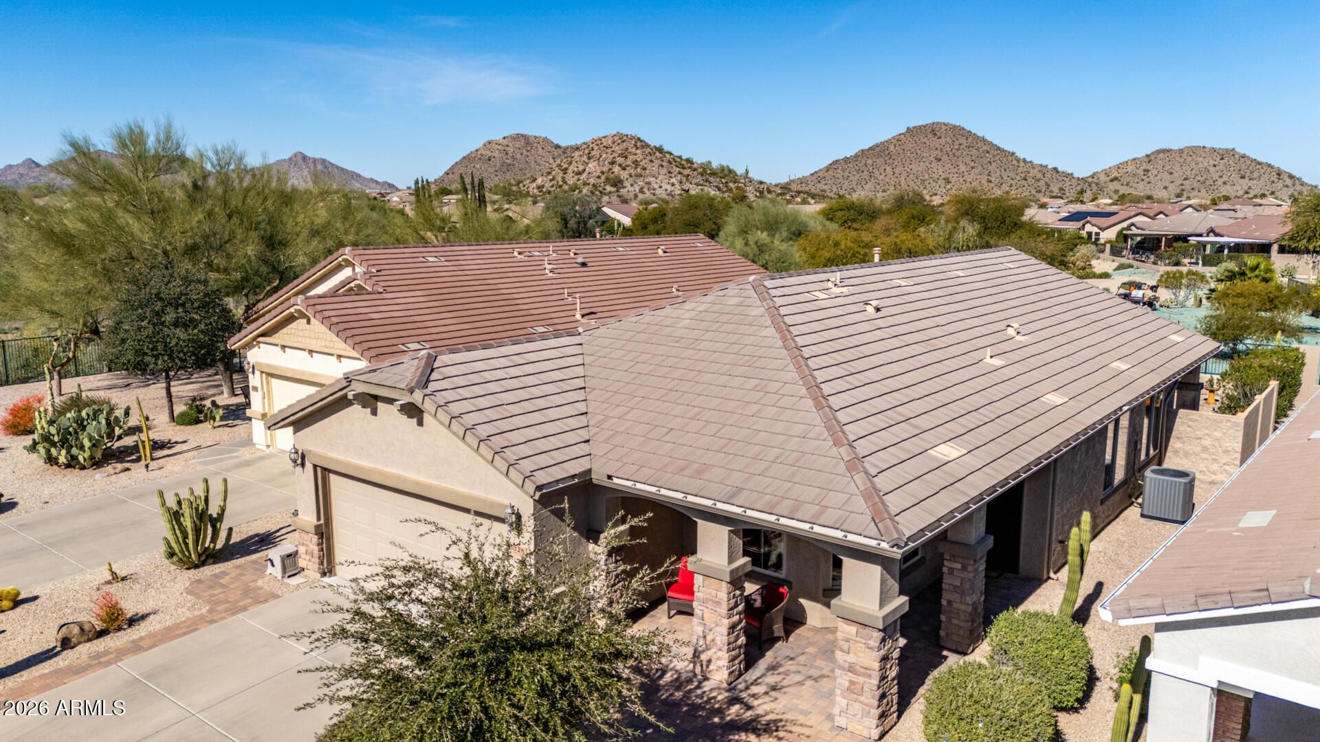 Enjoy peaceful desert living in the 55+ gated community of Solera at Johnson Ranch! This 2 bed, 2 bath + den home features a split floor plan, tile throughout (carpet only in bedrooms), and a bright kitchen with SS appliances, Corian countertops, breakfast nook, and views into the great room, plus a security door for added comfort. The primary suite offers a walk-in closet, double sinks, and a separate tub and shower. Come outside to a north facing backyard with an extended paver patio, desert landscape and mountain views, and no rear neighbors! Additional highlights include garage shelving and cabinets, an extended paver driveway and front patio. Enjoy everything Solera has to offer with amenities such as golf, pools, spa, fitness center, pickleball, billiards, and more! Welcome home!