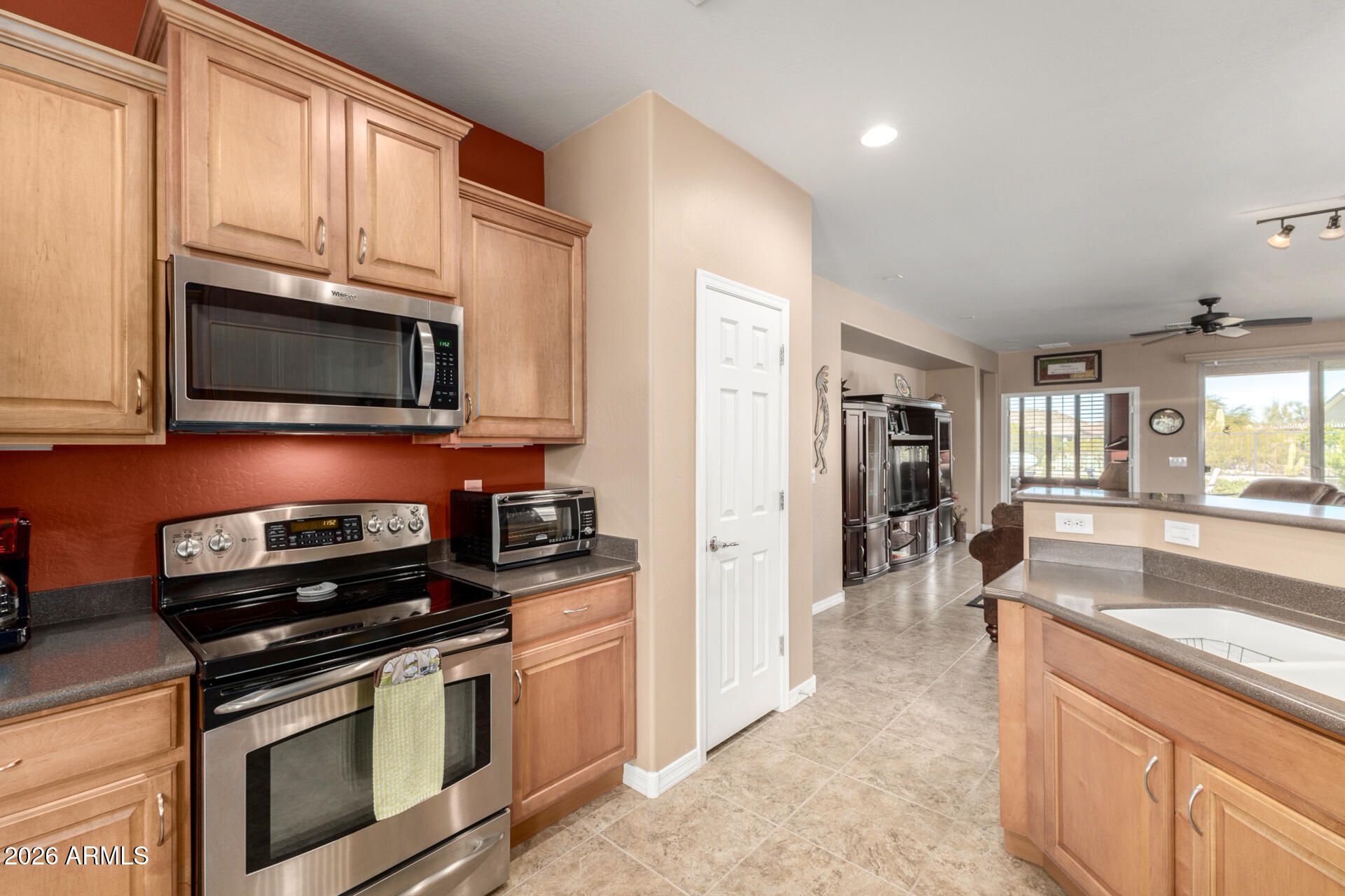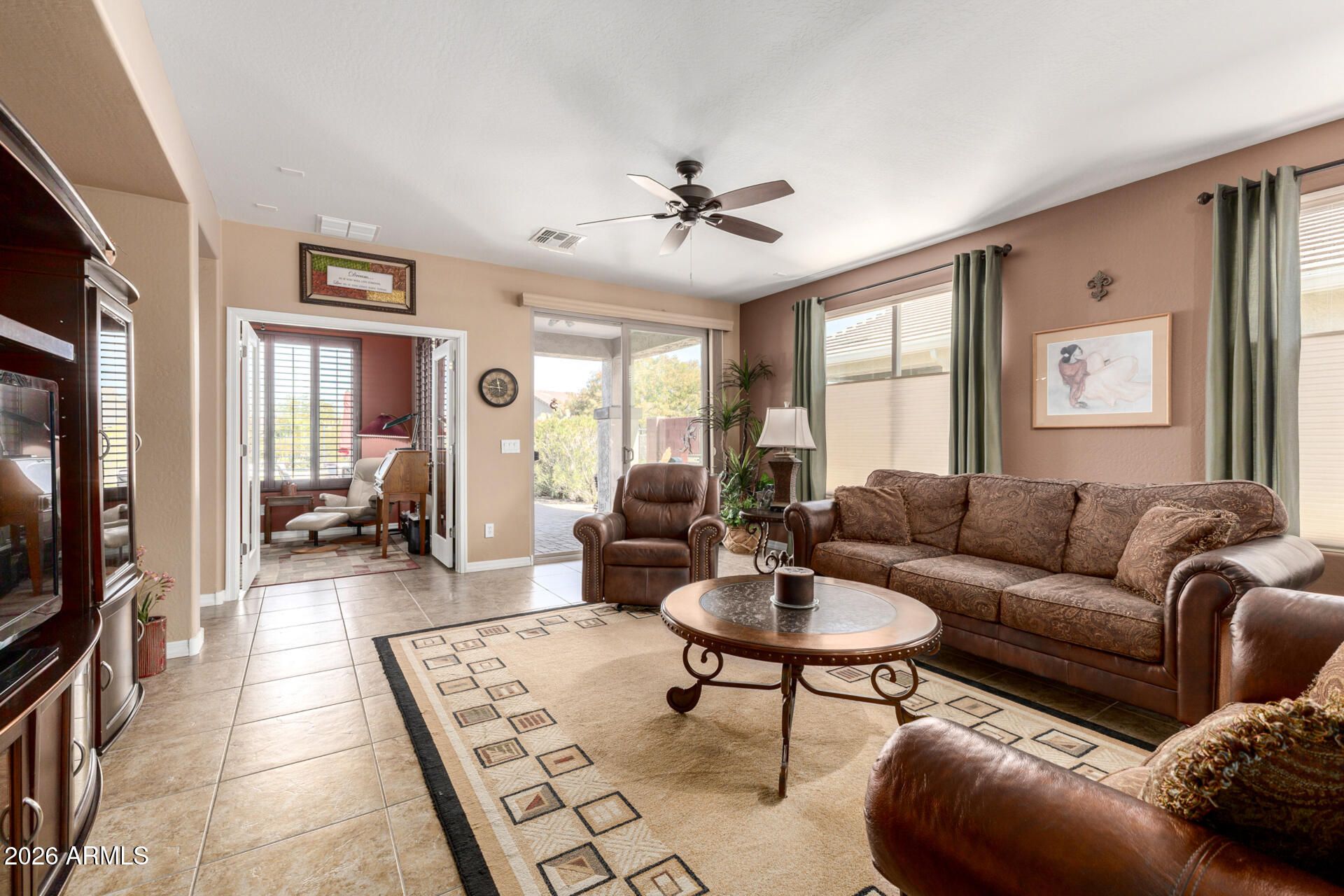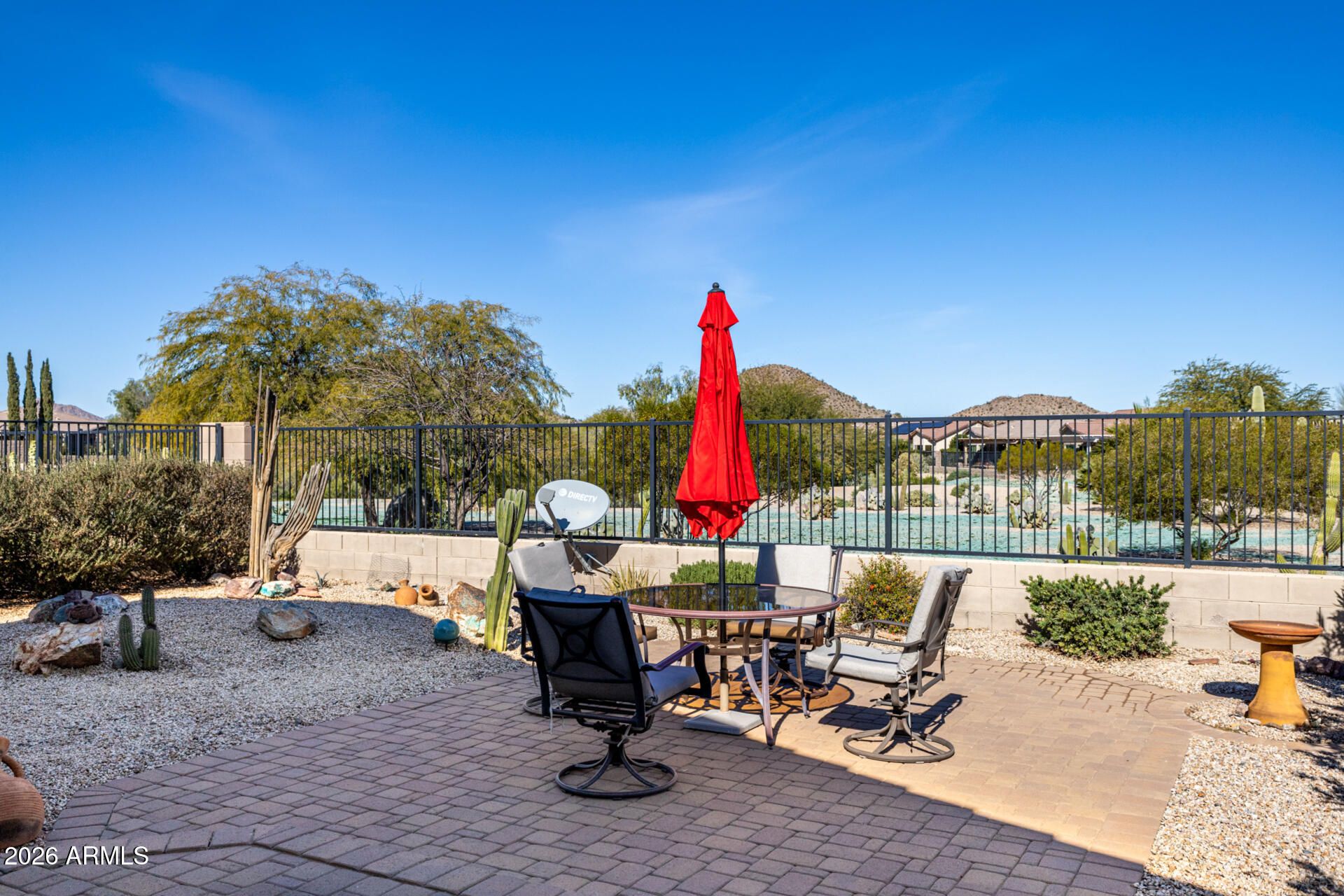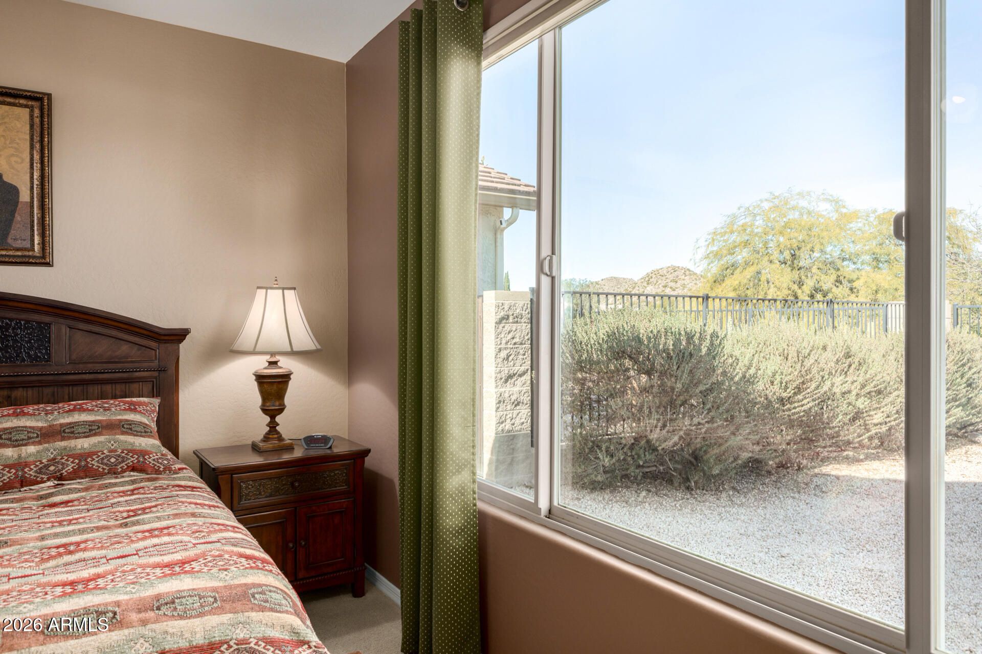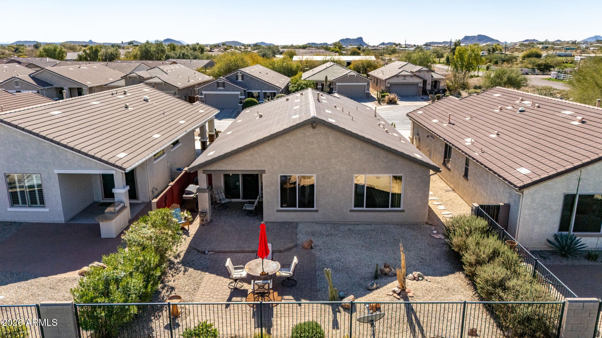 Enjoy peaceful desert living in the 55+ gated community of Solera at Johnson Ranch! This 2 bed, 2 bath + den home features a split floor plan, tile throughout (carpet only in bedrooms), and a bright kitchen with SS appliances, Corian countertops, breakfast nook, and views into the great room, plus a security door for added comfort. The primary suite offers a walk-in closet, double sinks, and a separate tub and shower. Come outside to a north facing backyard with an extended paver patio, desert landscape and mountain views, and no rear neighbors! Additional highlights include garage shelving and cabinets, an extended paver driveway and front patio. Enjoy everything Solera has to offer with amenities such as golf, pools, spa, fitness center, pickleball, billiards, and more! Welcome home!
