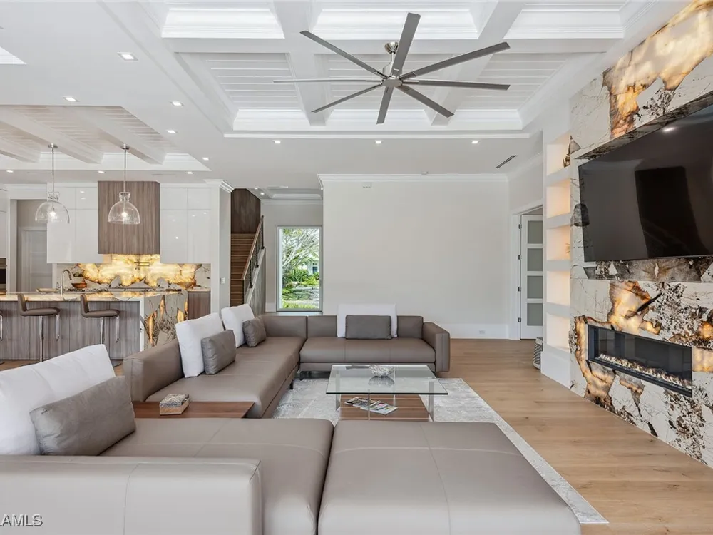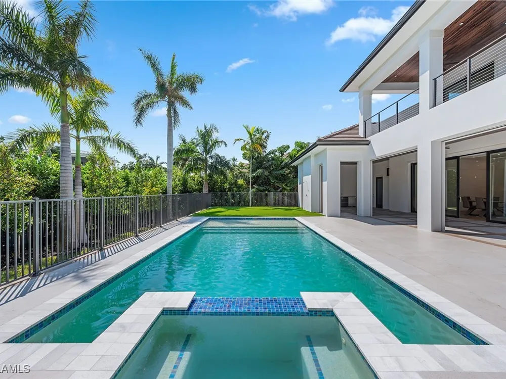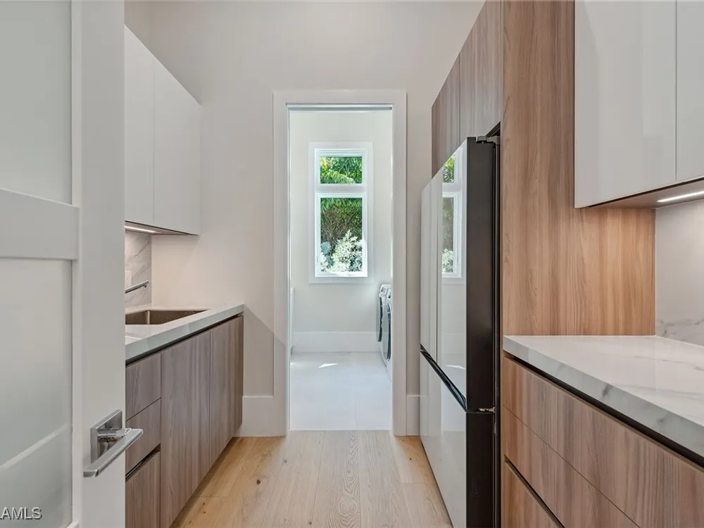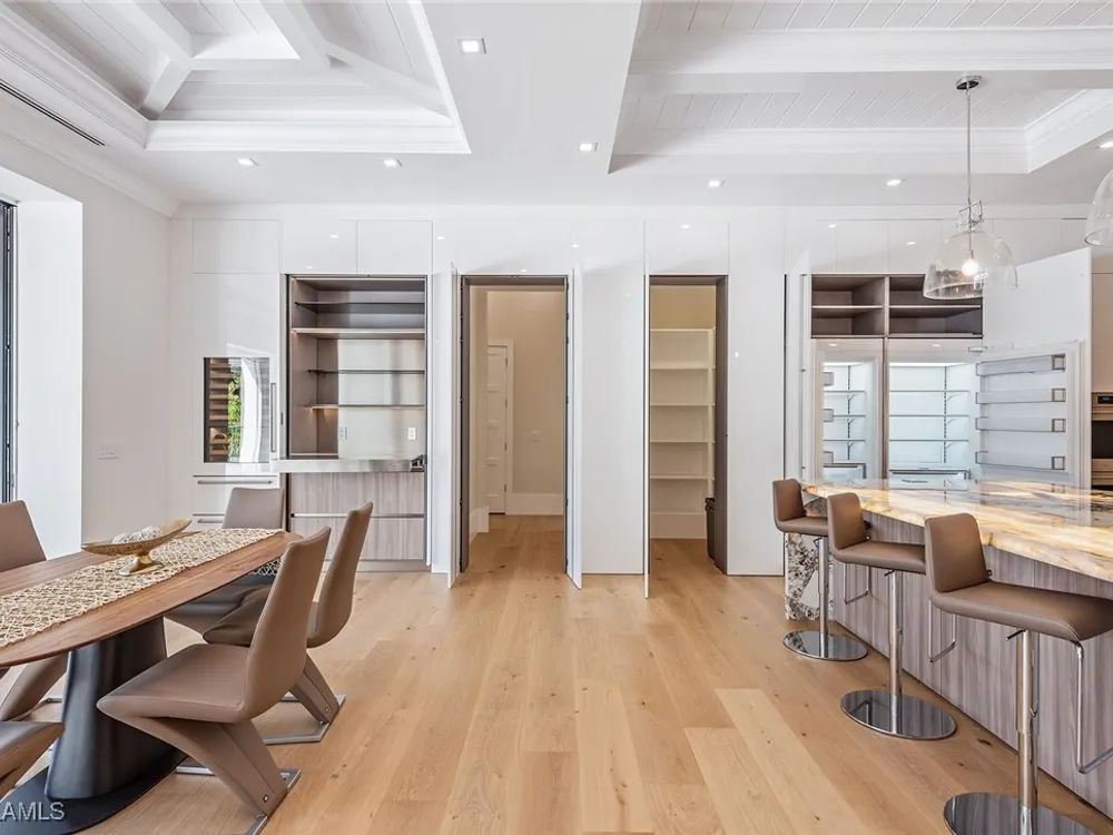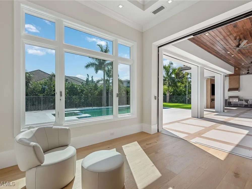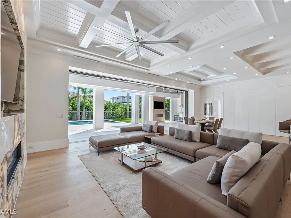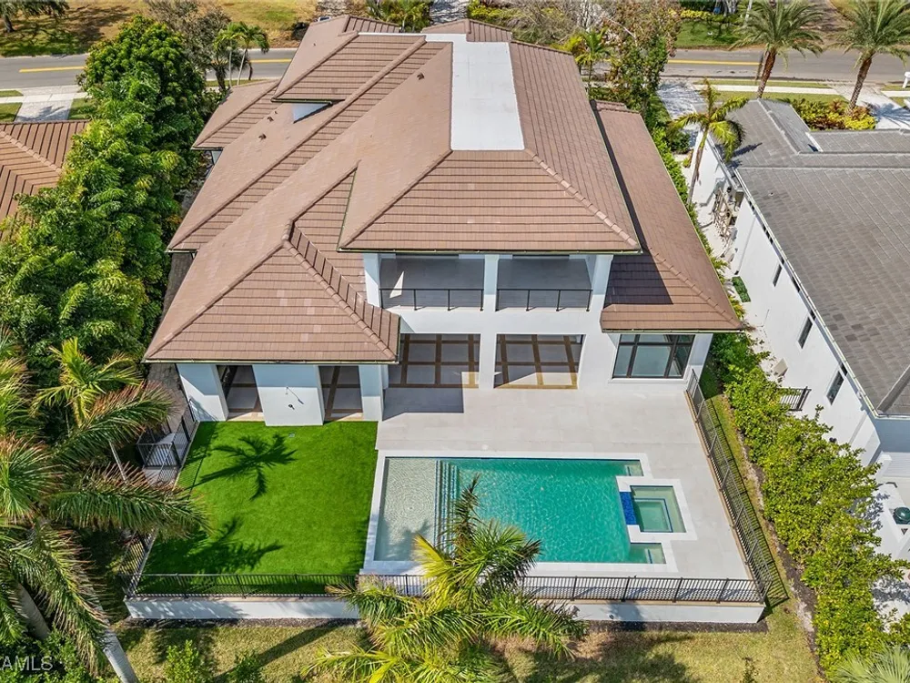 Designed by JMDG Architecture, this luxurious home offers a seamless blend of elegance and function. The kitchen, crafted in Italy by Idea Group, features partially translucent, highest-grade quartz countertops and premium Wolf and Sub-Zero appliances, including a double oven and dishwasher. A spacious walk-in pantry adds convenience. The home's finishes, including those in the baths, are from the renowned brand Porcelanosa, showcasing sophistication in every detail. With five bedrooms, a den and 5.5 uniquely styled baths, this home offers ample space and style. Rolf Benz indoor furniture and Restoration Hardware light fixtures enhance the contemporary design, while all Anderson windows, sliders and a pivot front door add to the home's sleek appeal. Outside, enjoy the poolside fire and water feature, complete with electric hurricane shutters and rolldown screens that provide privacy or keep out bugs. The three-car garage has room for up to three car lifts. A built-in wine cooler, 1,000-gallon propane tank and Pentair water filtration system ensure comfort throughout.