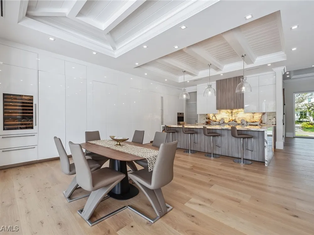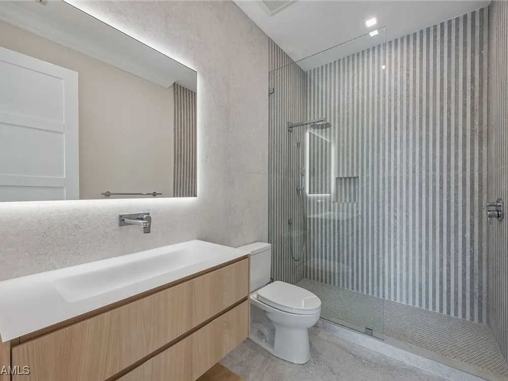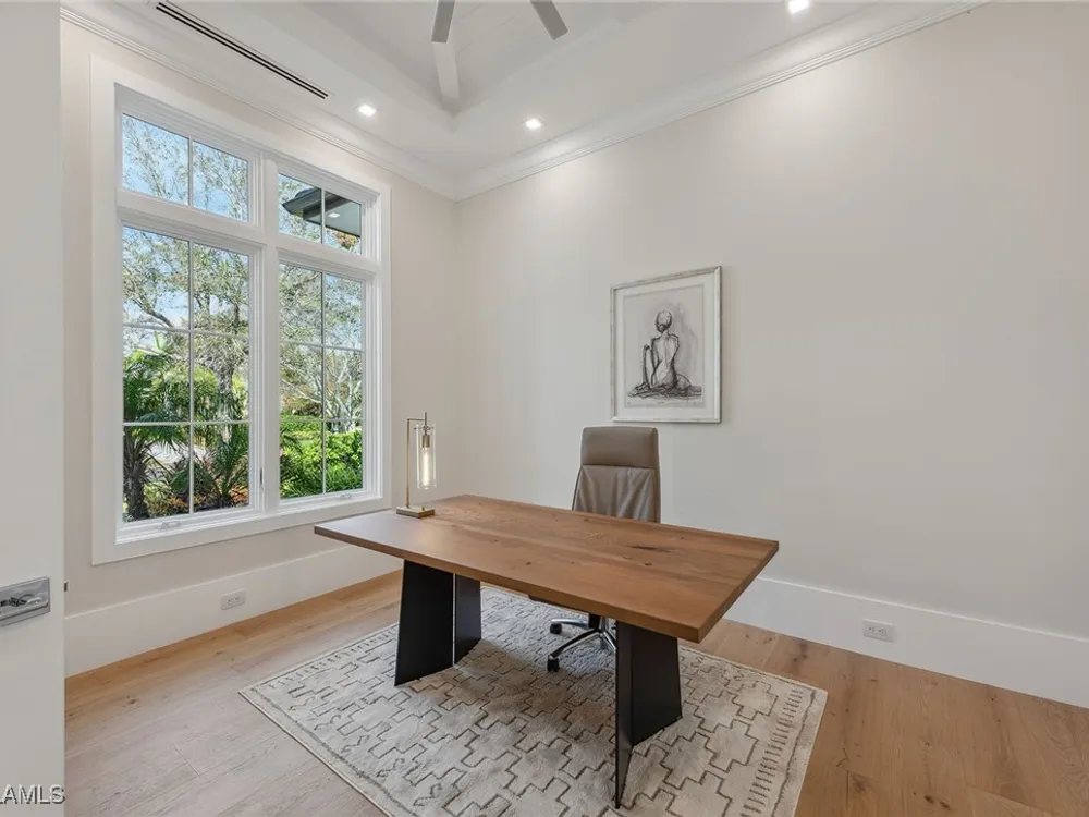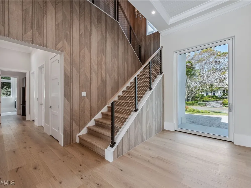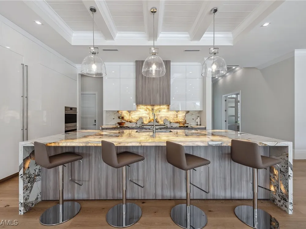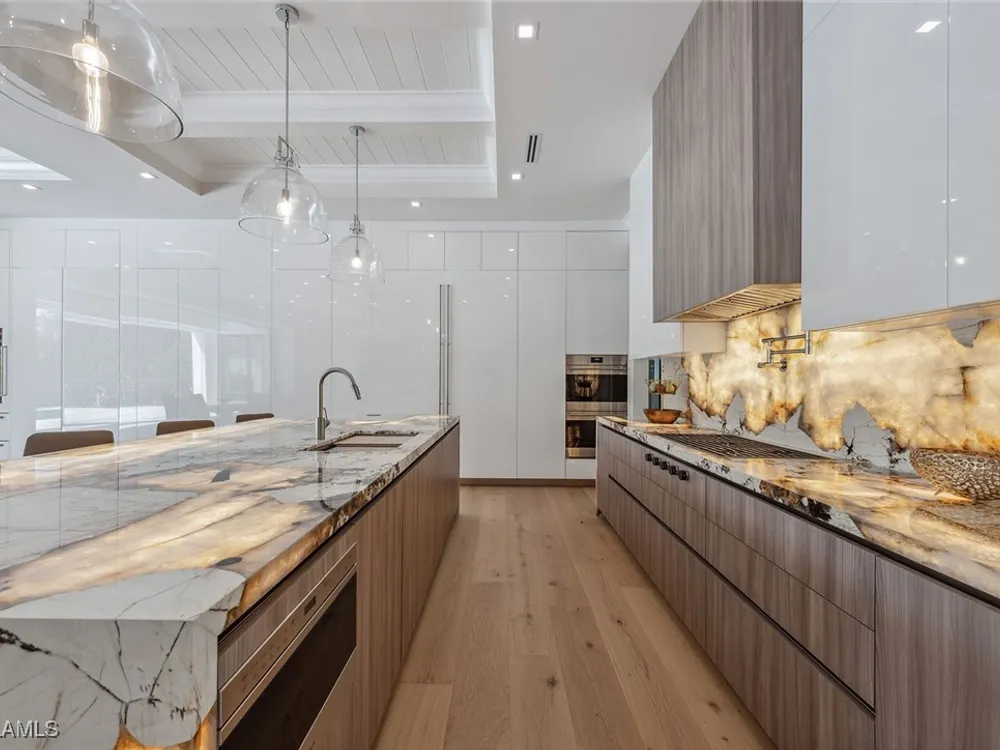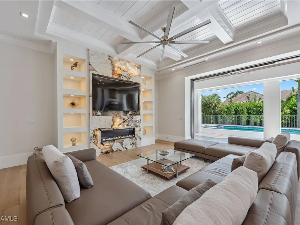 Designed by JMDG Architecture, this luxurious home offers a seamless blend of elegance and function. The kitchen, crafted in Italy by Idea Group, features partially translucent, highest-grade quartz countertops and premium Wolf and Sub-Zero appliances, including a double oven and dishwasher. A spacious walk-in pantry adds convenience. The home's finishes, including those in the baths, are from the renowned brand Porcelanosa, showcasing sophistication in every detail. With five bedrooms, a den and 5.5 uniquely styled baths, this home offers ample space and style. Rolf Benz indoor furniture and Restoration Hardware light fixtures enhance the contemporary design, while all Anderson windows, sliders and a pivot front door add to the home's sleek appeal. Outside, enjoy the poolside fire and water feature, complete with electric hurricane shutters and rolldown screens that provide privacy or keep out bugs. The three-car garage has room for up to three car lifts. A built-in wine cooler, 1,000-gallon propane tank and Pentair water filtration system ensure comfort throughout.