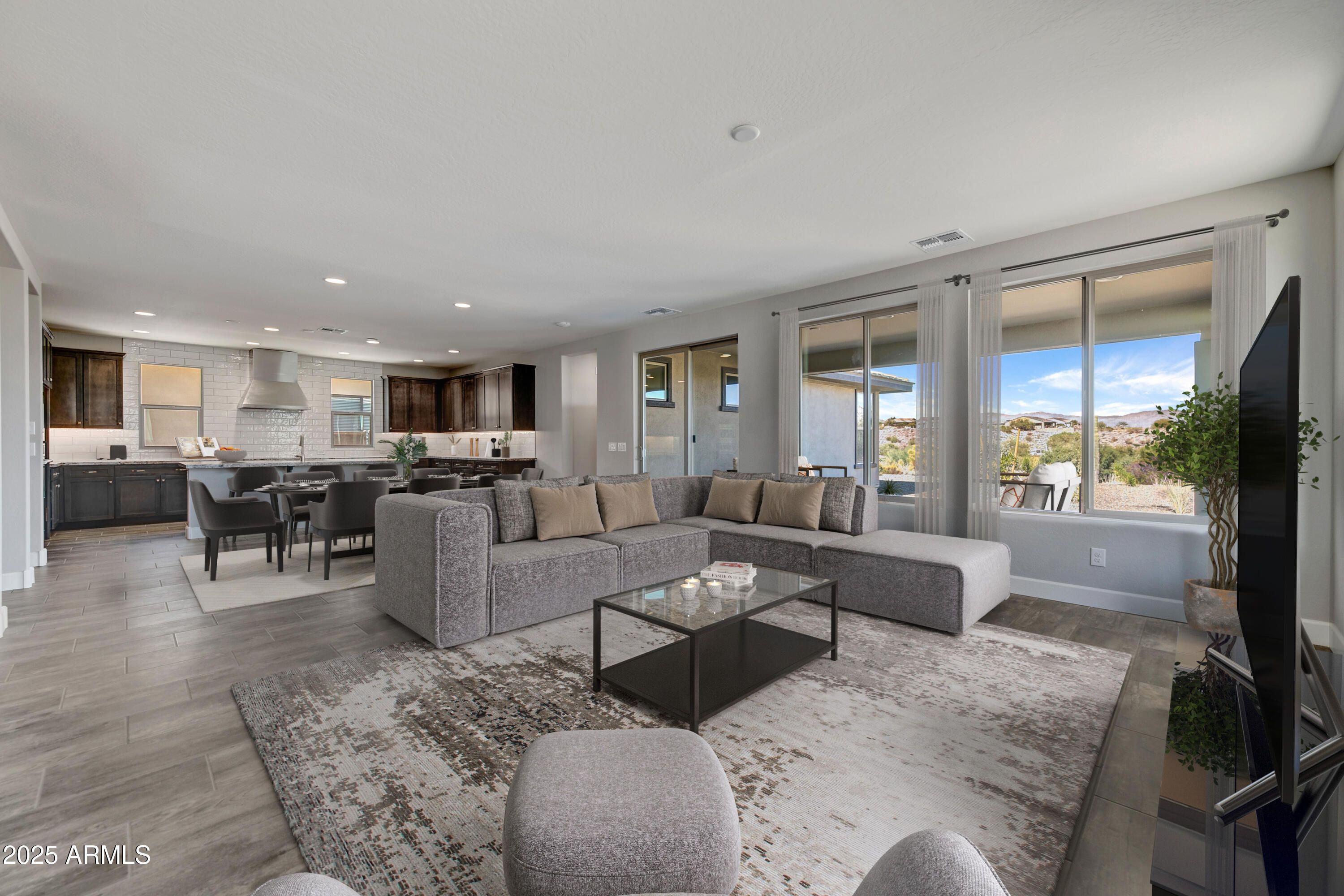 Spectacular views of the 1st hole of the championship course & desert mountains highlight this Ironwood plan at Trilogy Wickenburg Ranch. Approx. 2,111 sq ft with 2 beds, 2.5 baths & den. Just moments from clubhouse, resort pool, spa, fitness & sports amenities. Chef's kitchen features Café stainless appliances, granite, extended cabinetry & custom backsplash. Great room opens to covered patio on oversized homesite with custom landscape, perfect for entertaining. Primary suite offers spa-style bath with heavy glass shower & designer finishes. Upgrades include Smart Space laundry, 4' garage extension, recirculating hot water, wood-look tile & more. Enjoy resort living with golf, dining & social events steps away