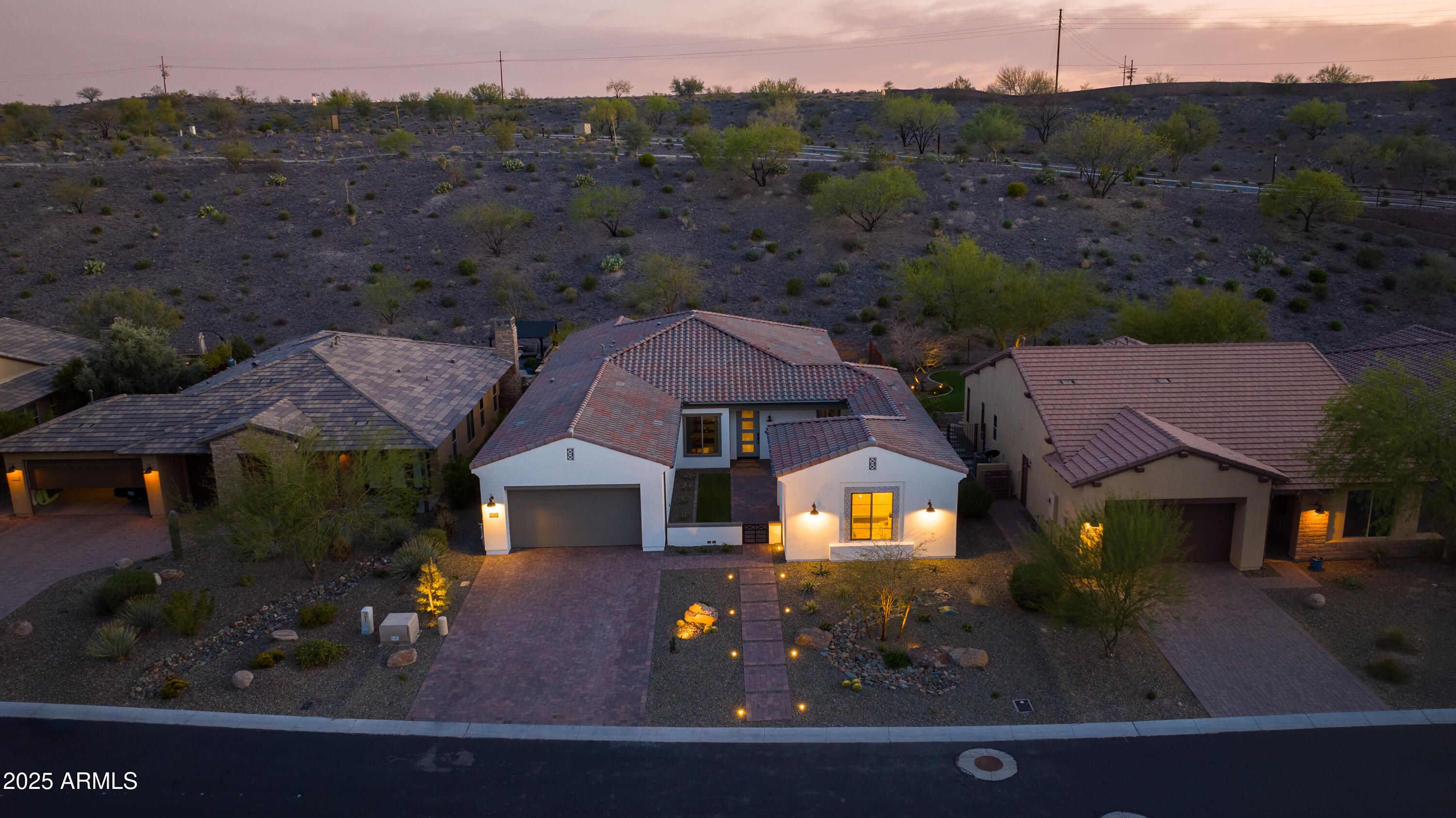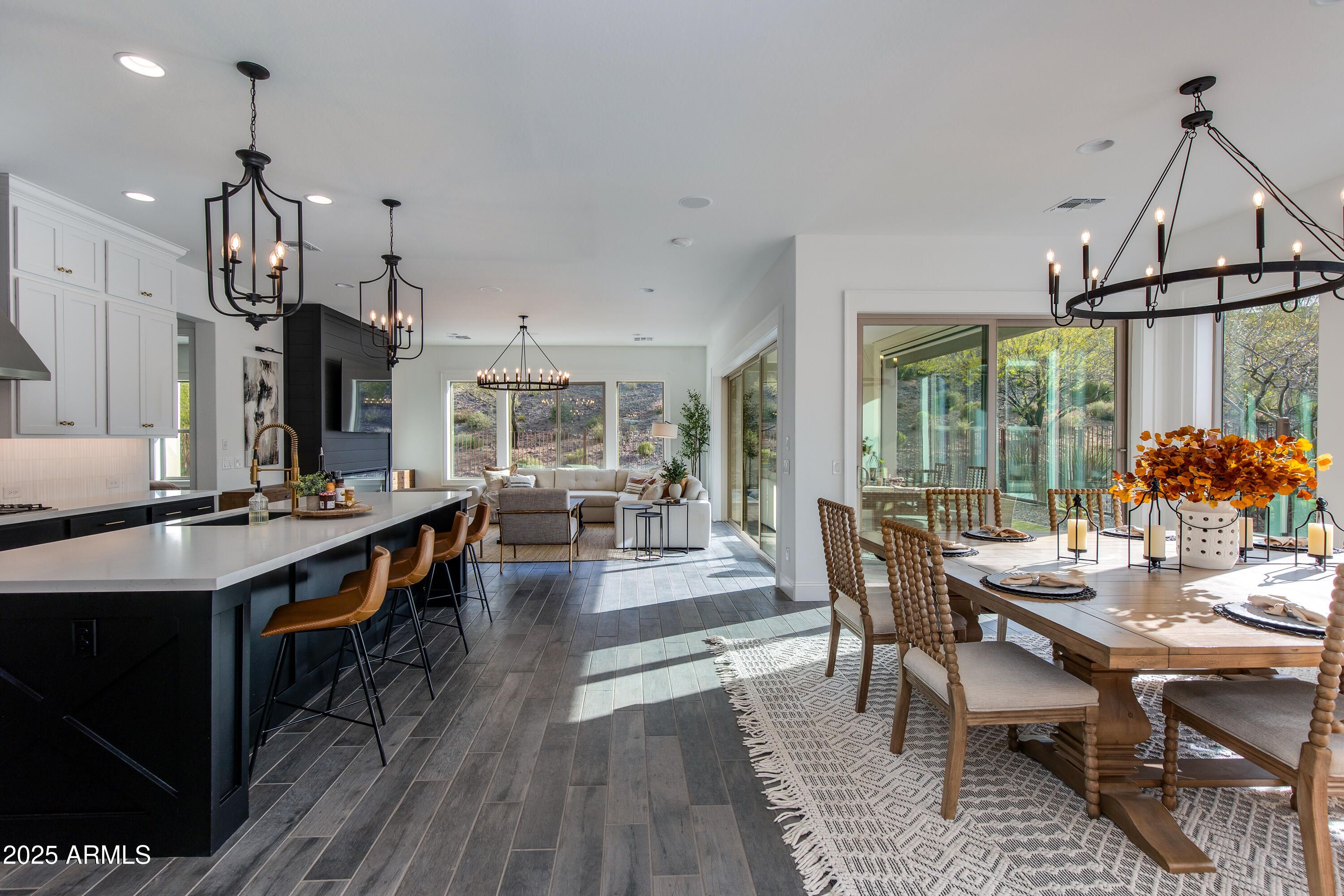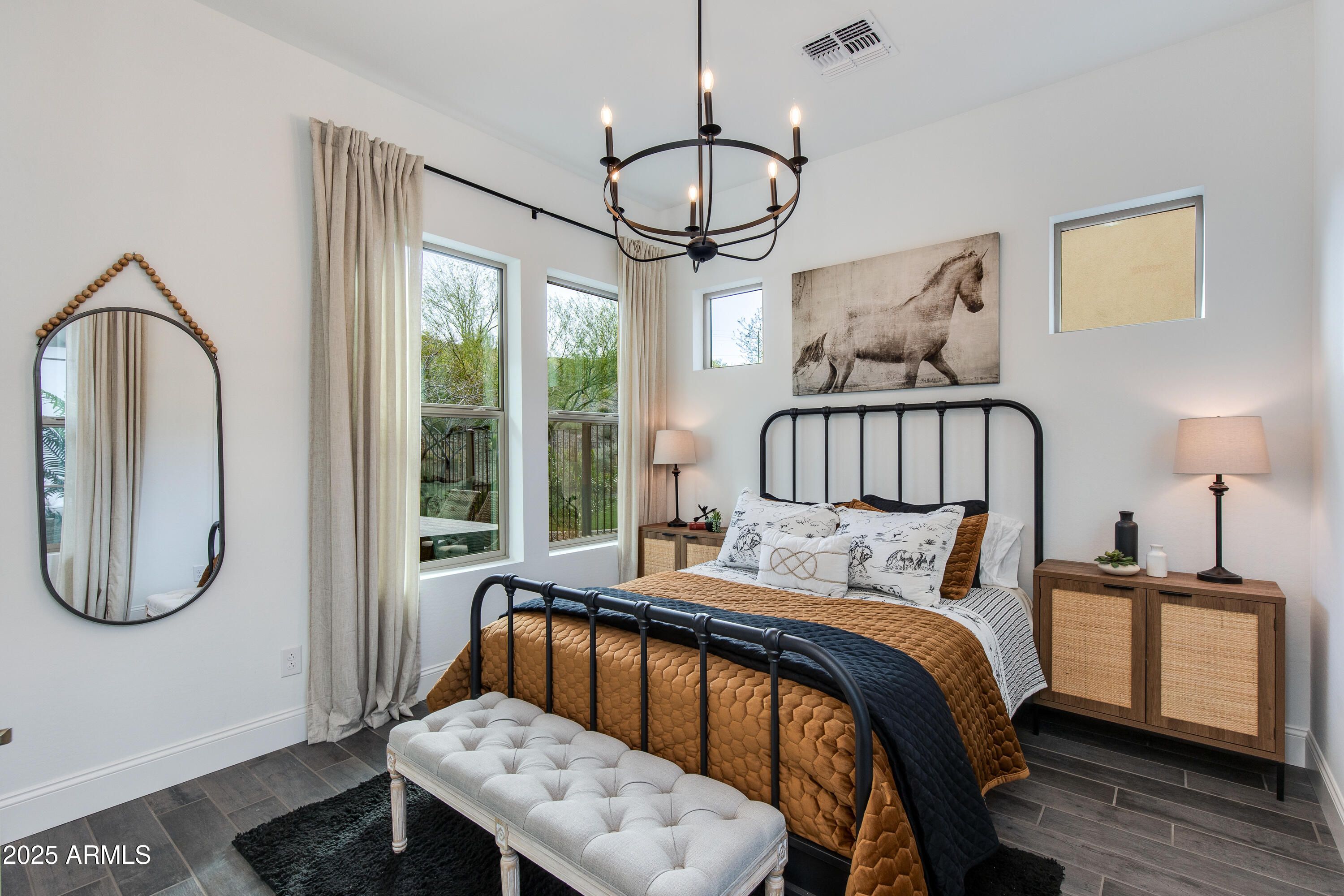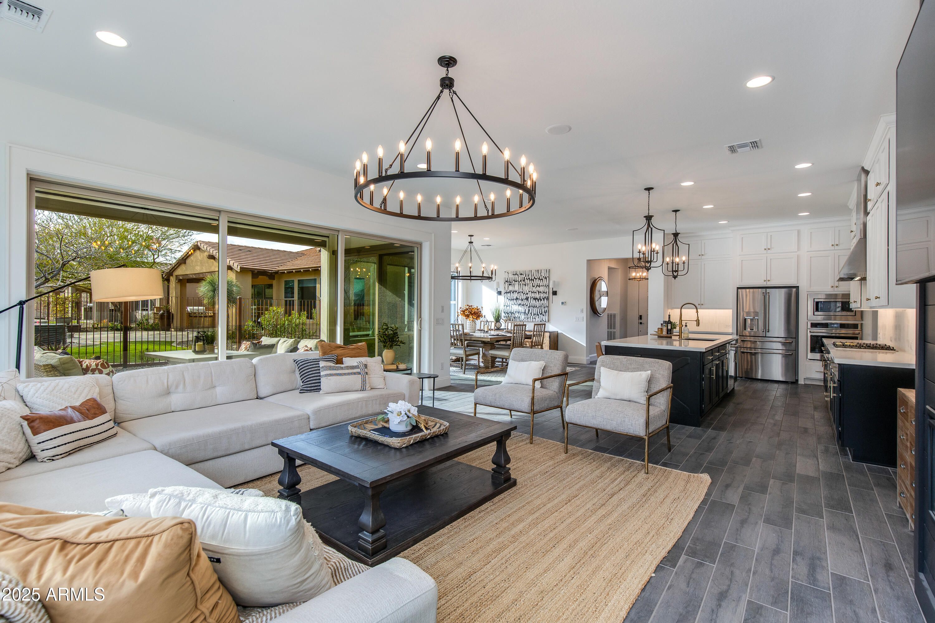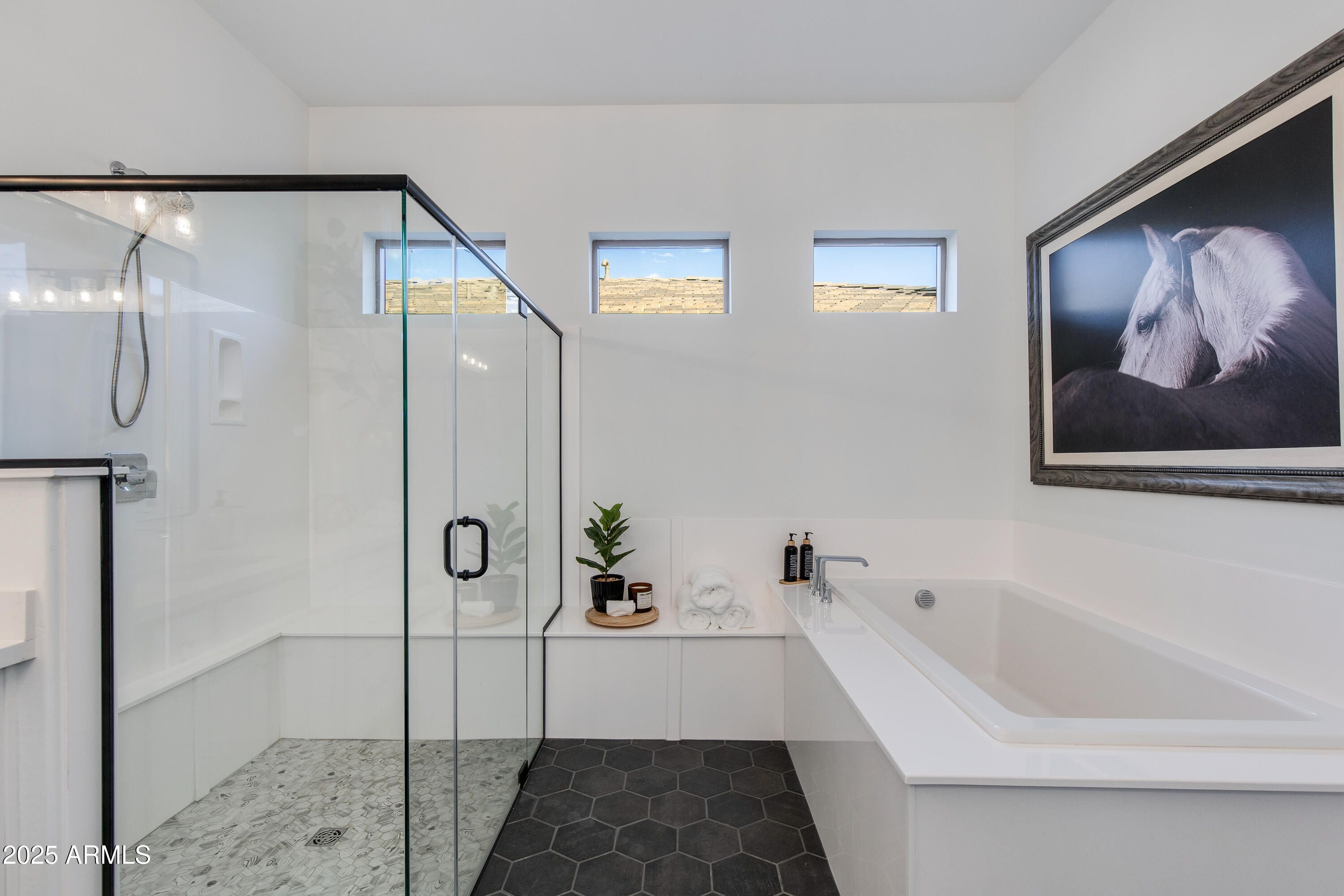 Custom Designed with Modern Finishes! 2,768 sq. ft. Latigo floor plan in Wickenburg Ranch features 3 bedrooms, 3.5 baths including a private-entry guest casita off a spacious central courtyard. Inside, enjoy soaring 10 ft ceilings, tile flooring, engineered stone countertops, ceiling-height black & white cabinetry with brass hardware & designer lighting. Great room & primary suite showcase custom window moldings. The fully fenced backyard includes heated pool, spa, motorized patio shade & protective fencing. Tandem garage with bonus storage. Walk to clubhouse, fitness center, golf & resort-style amenities—move in today!