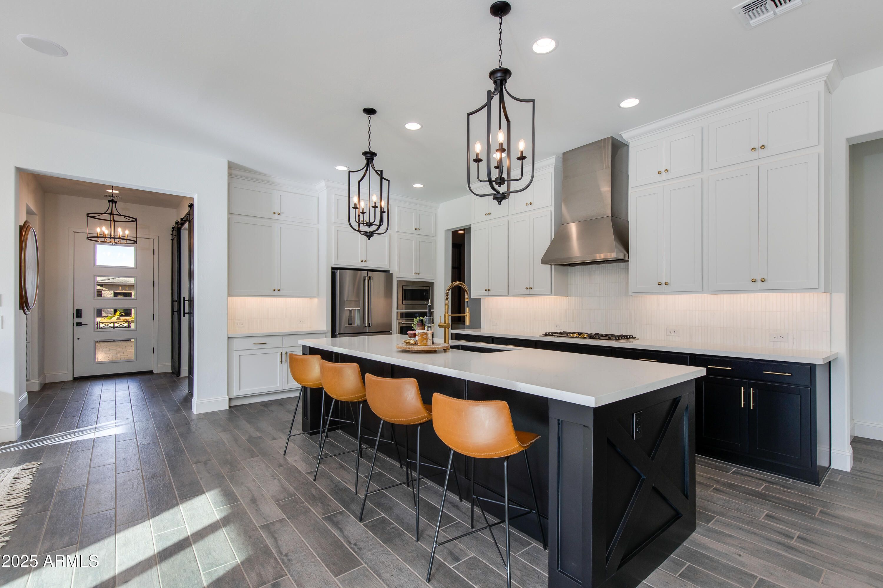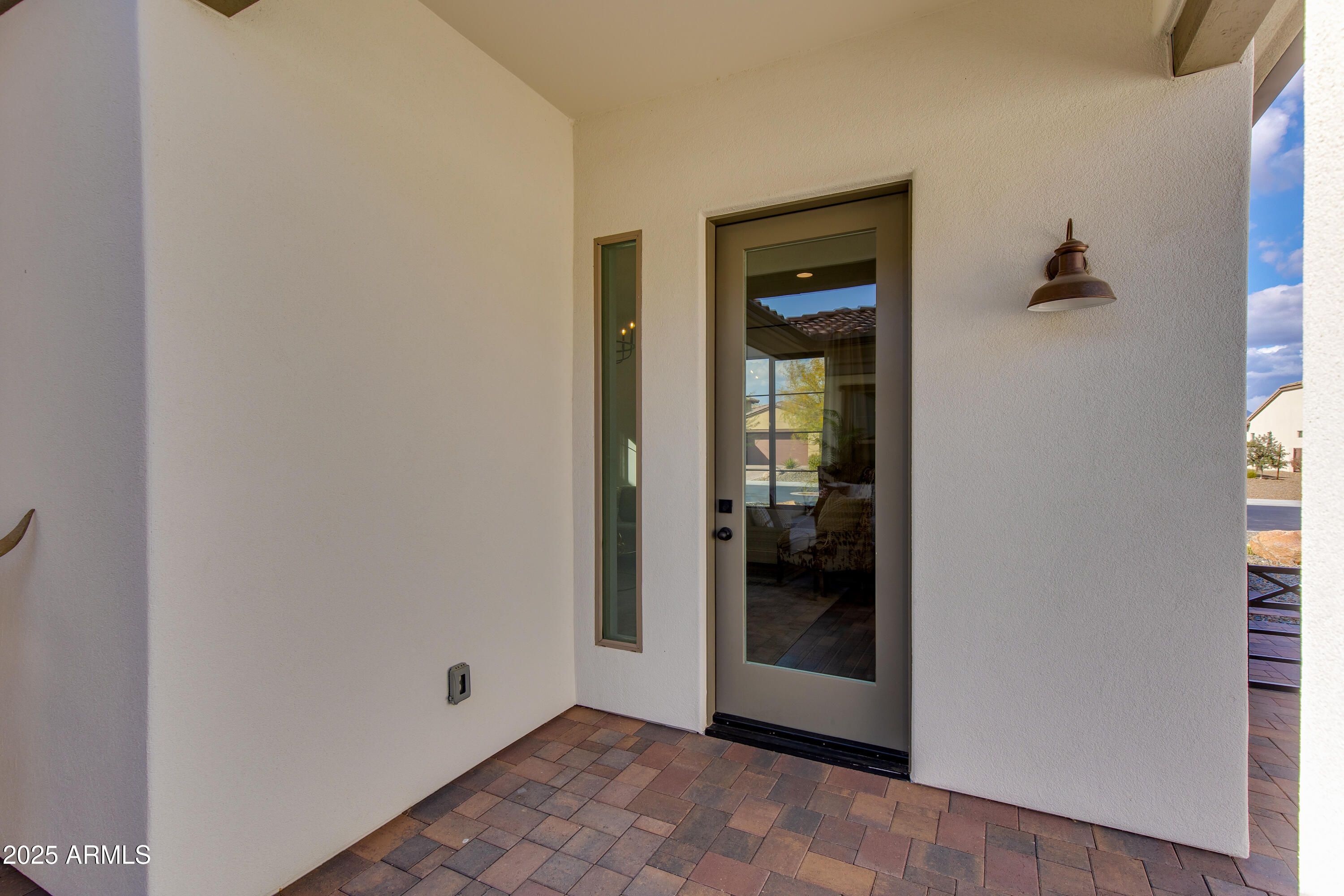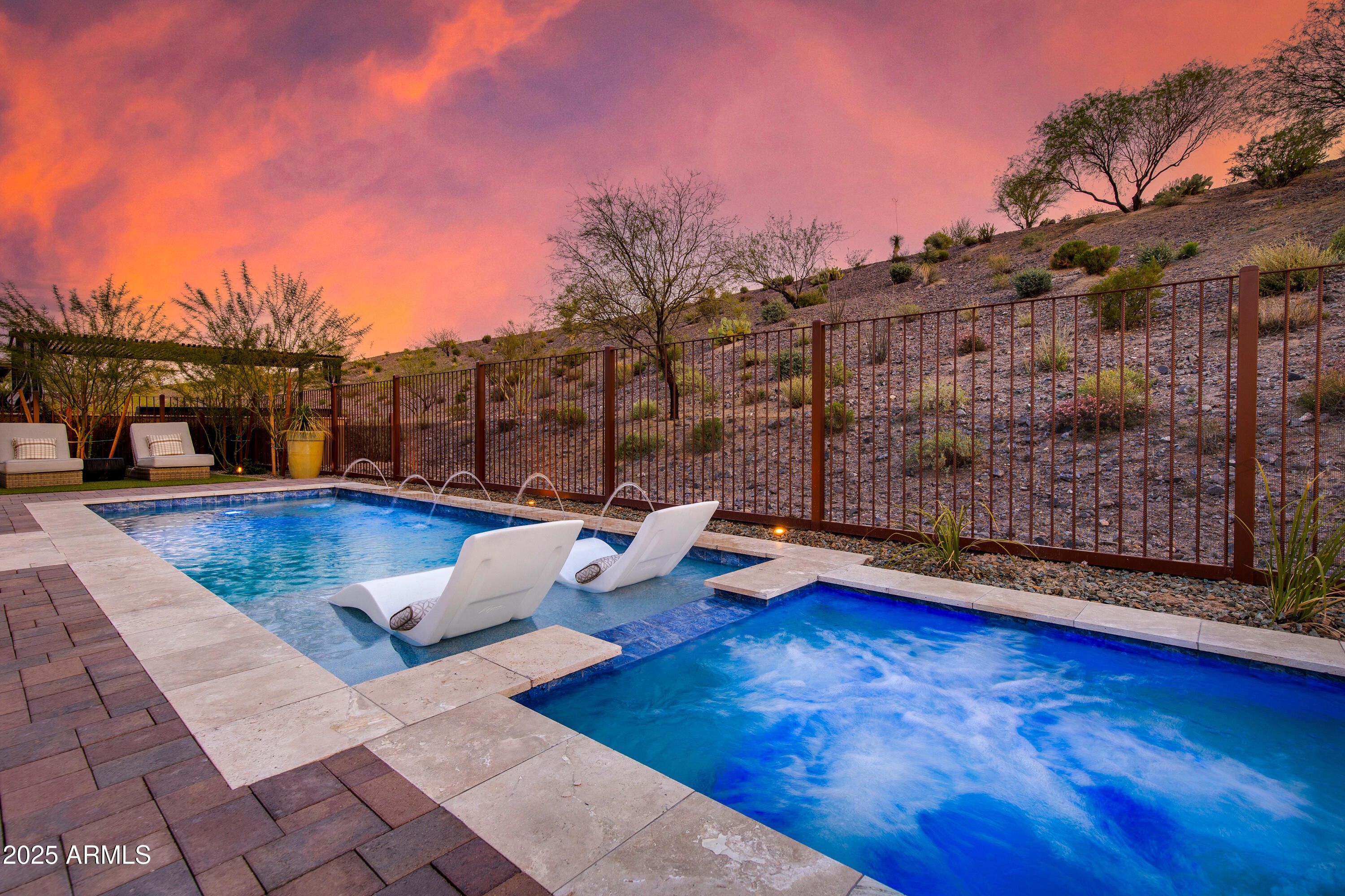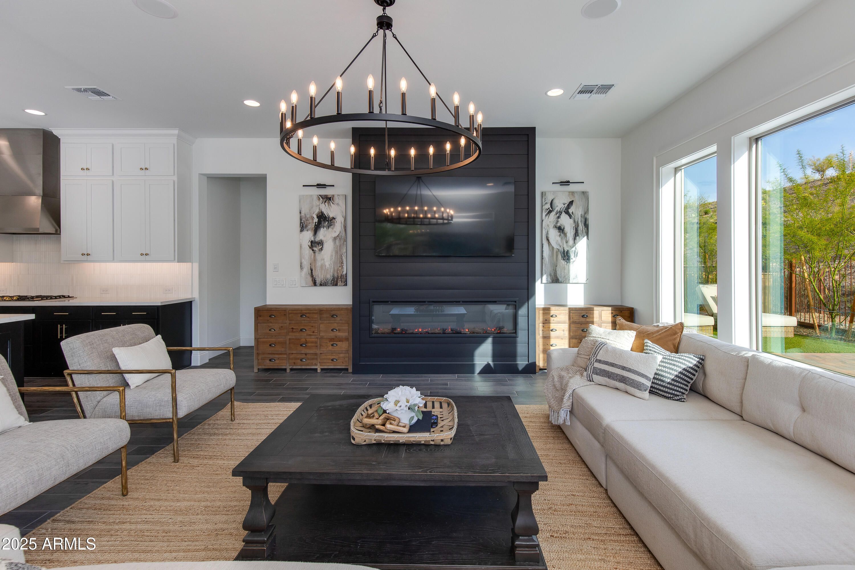 Custom Designed with Modern Finishes! 2,768 sq. ft. Latigo floor plan in Wickenburg Ranch features 3 bedrooms, 3.5 baths including a private-entry guest casita off a spacious central courtyard. Inside, enjoy soaring 10 ft ceilings, tile flooring, engineered stone countertops, ceiling-height black & white cabinetry with brass hardware & designer lighting. Great room & primary suite showcase custom window moldings. The fully fenced backyard includes heated pool, spa, motorized patio shade & protective fencing. Tandem garage with bonus storage. Walk to clubhouse, fitness center, golf & resort-style amenities—move in today!