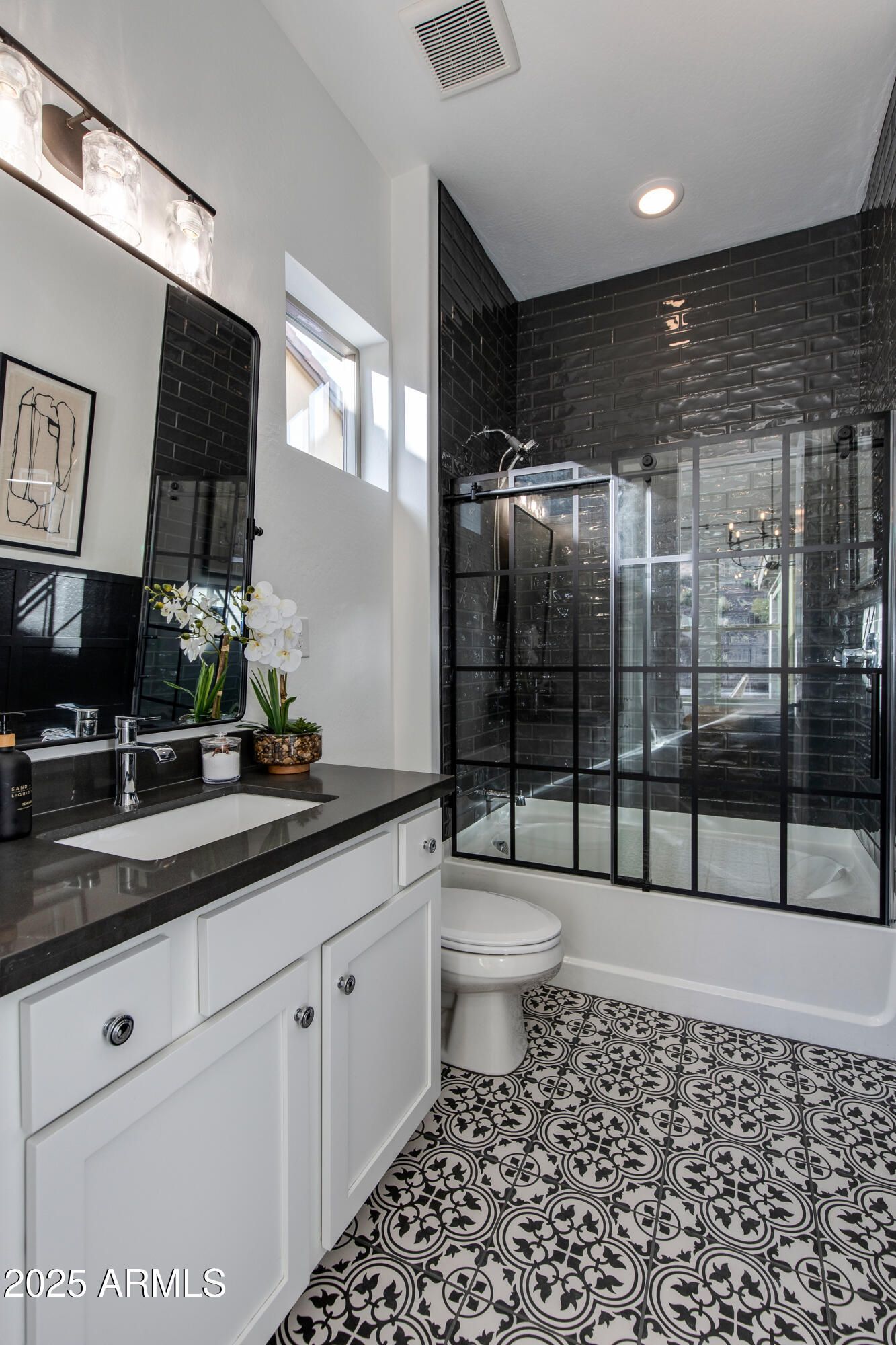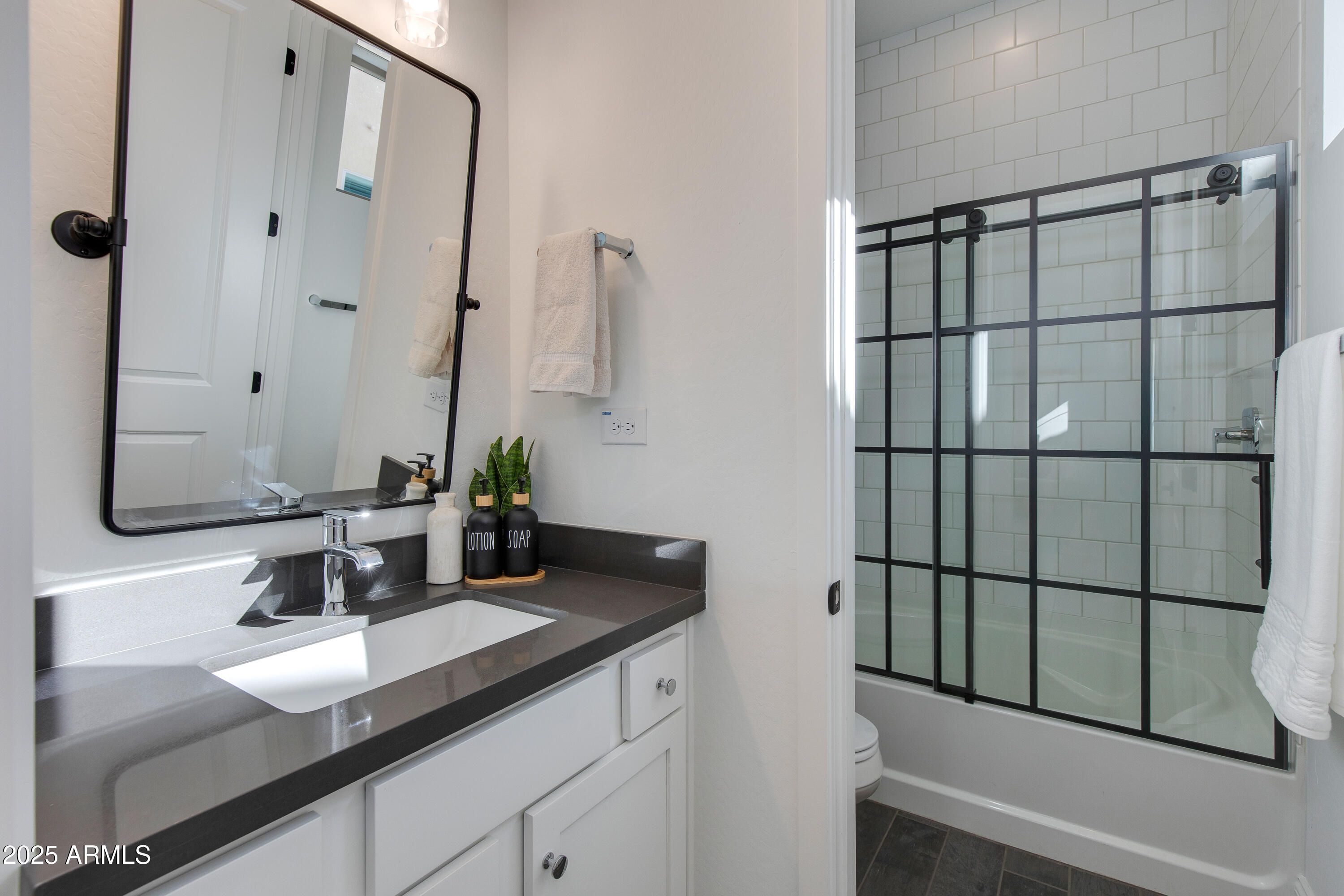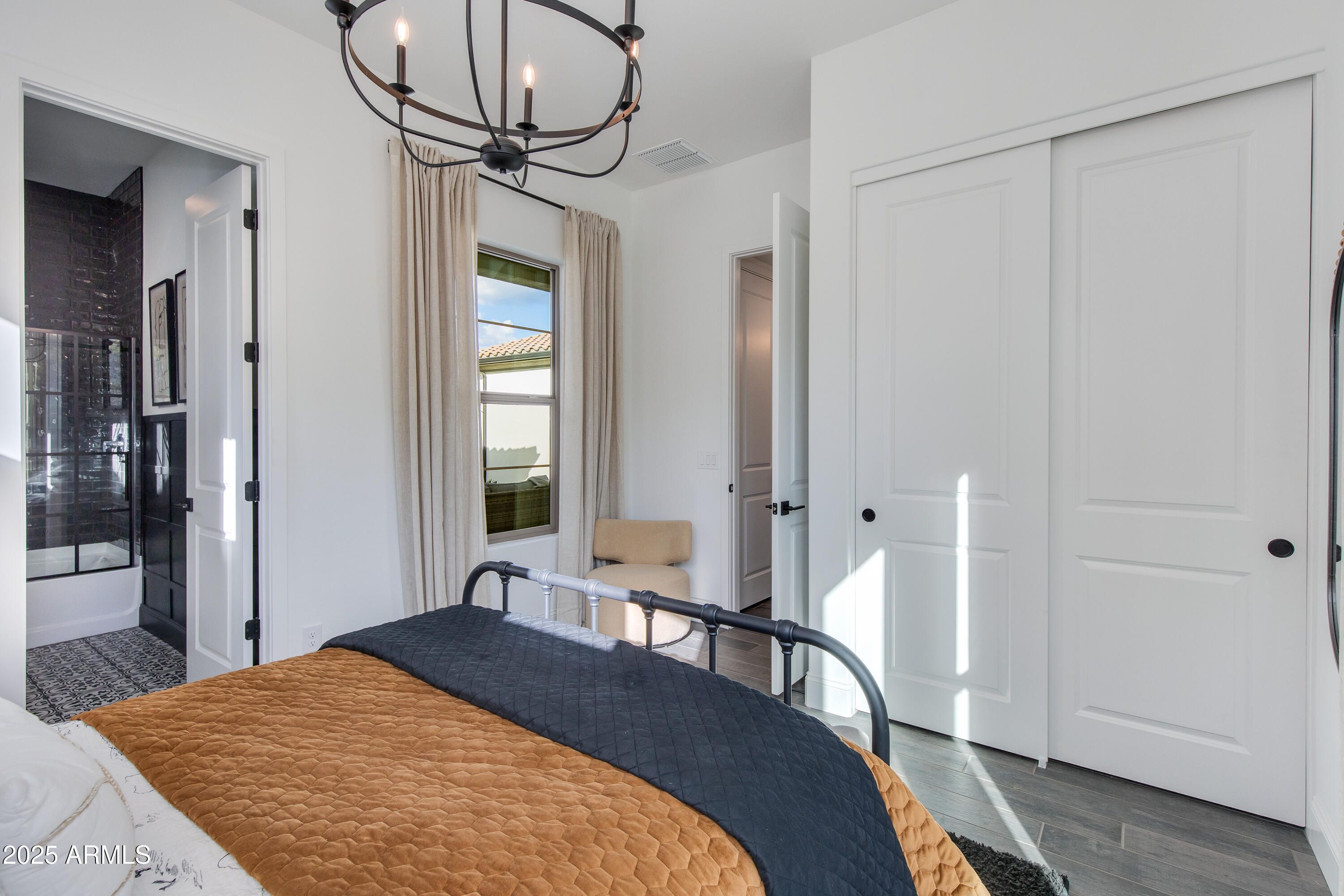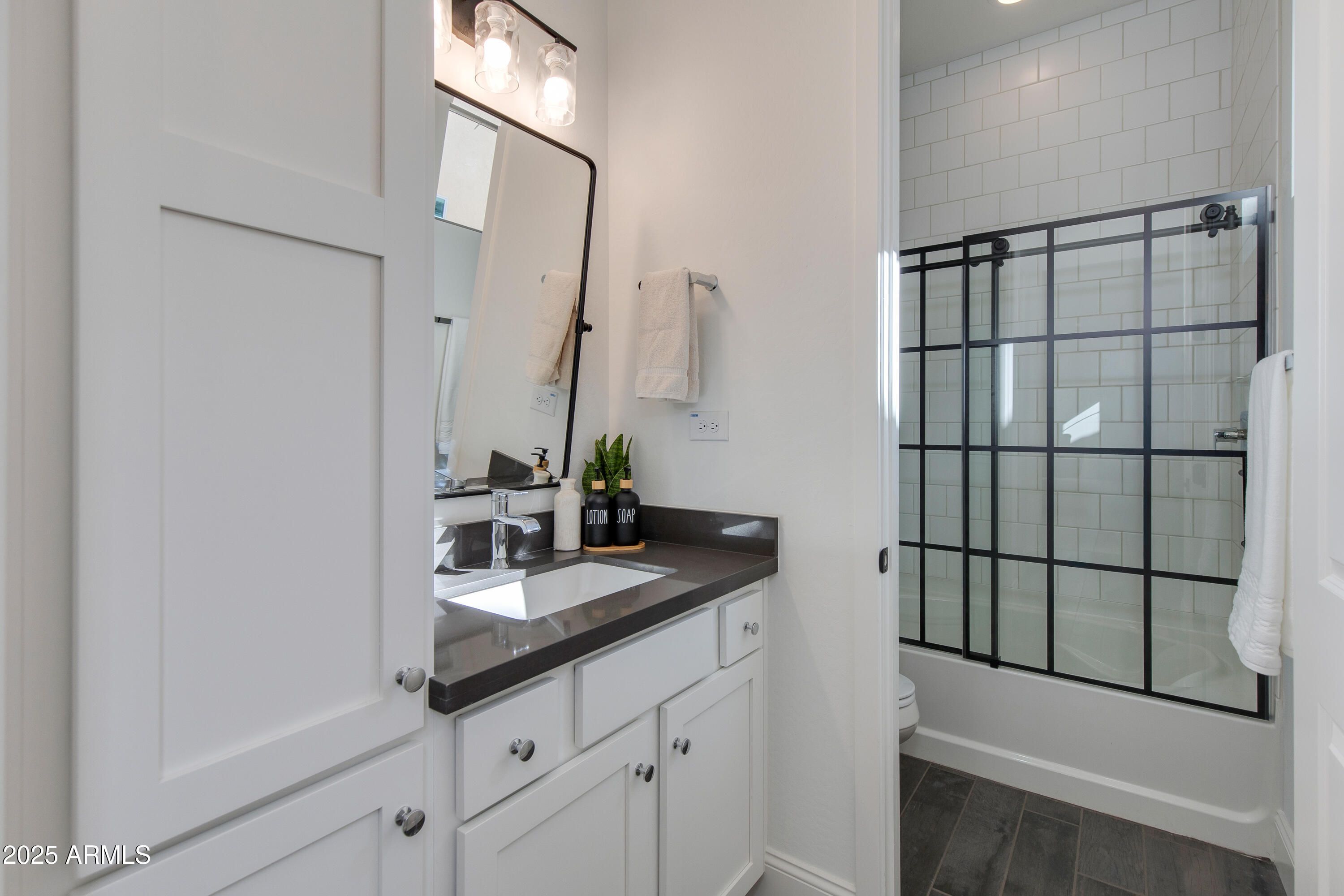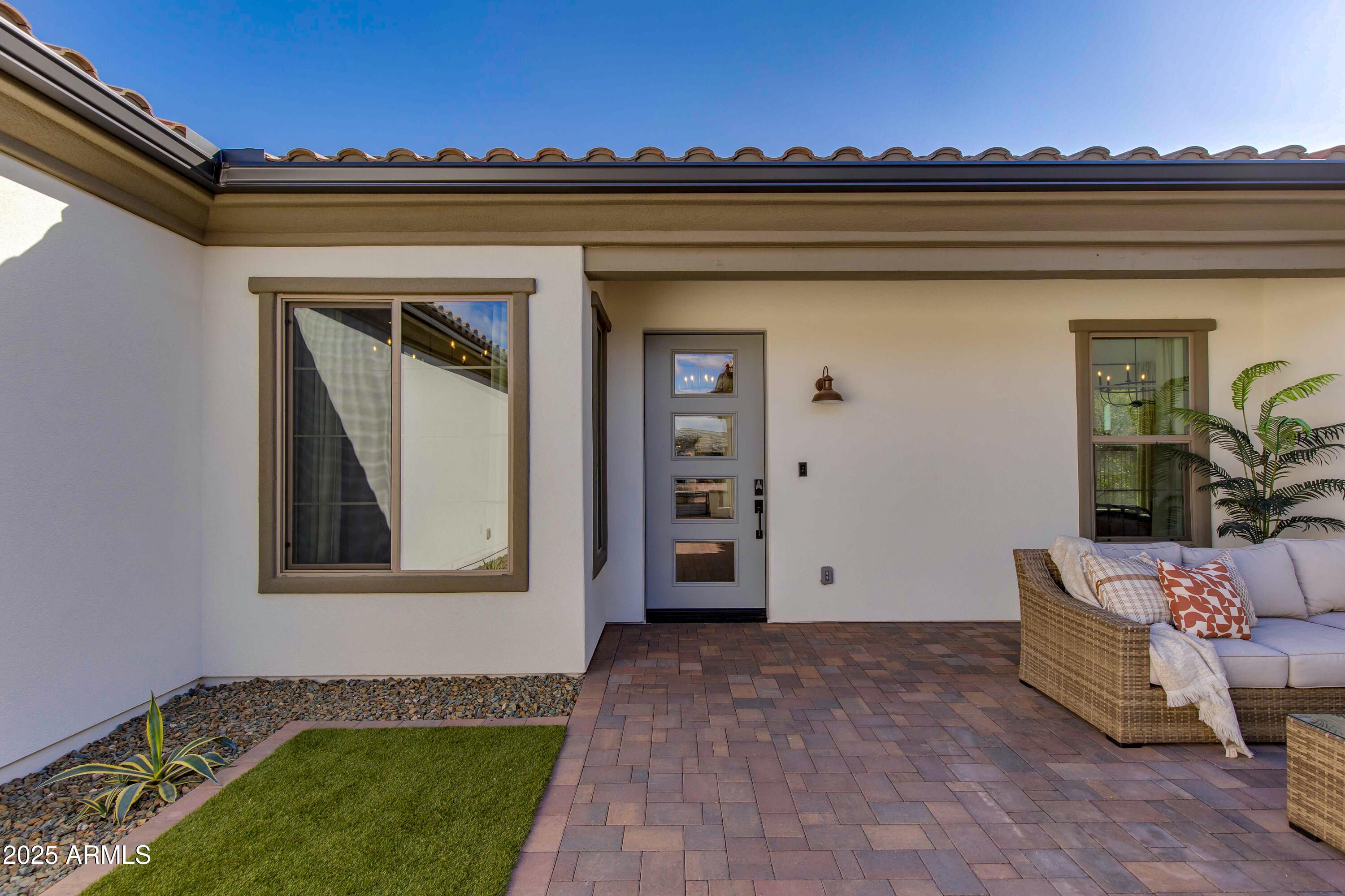 Custom Designed with Modern Finishes! 2,768 sq. ft. Latigo floor plan in Wickenburg Ranch features 3 bedrooms, 3.5 baths including a private-entry guest casita off a spacious central courtyard. Inside, enjoy soaring 10 ft ceilings, tile flooring, engineered stone countertops, ceiling-height black & white cabinetry with brass hardware & designer lighting. Great room & primary suite showcase custom window moldings. The fully fenced backyard includes heated pool, spa, motorized patio shade & protective fencing. Tandem garage with bonus storage. Walk to clubhouse, fitness center, golf & resort-style amenities—move in today!