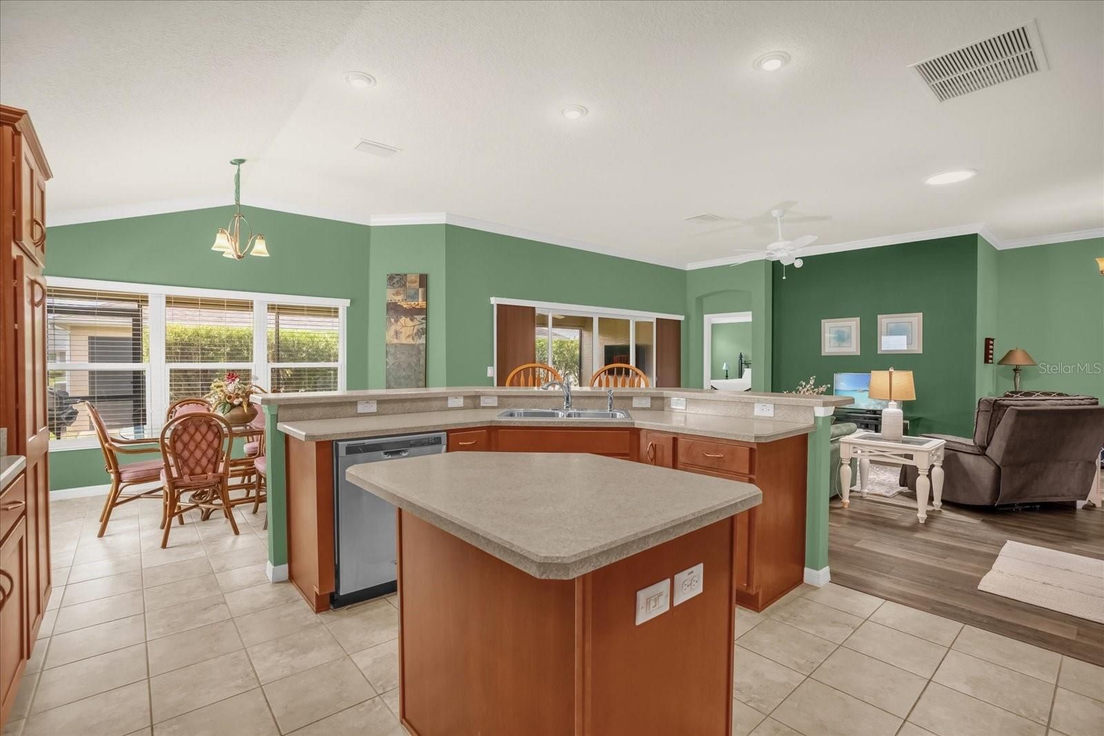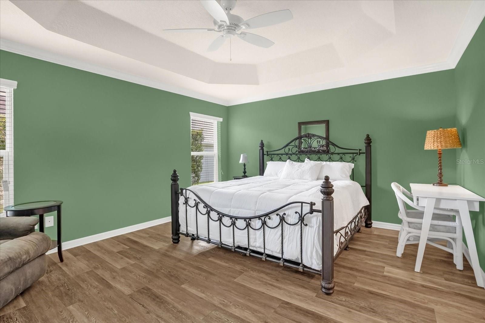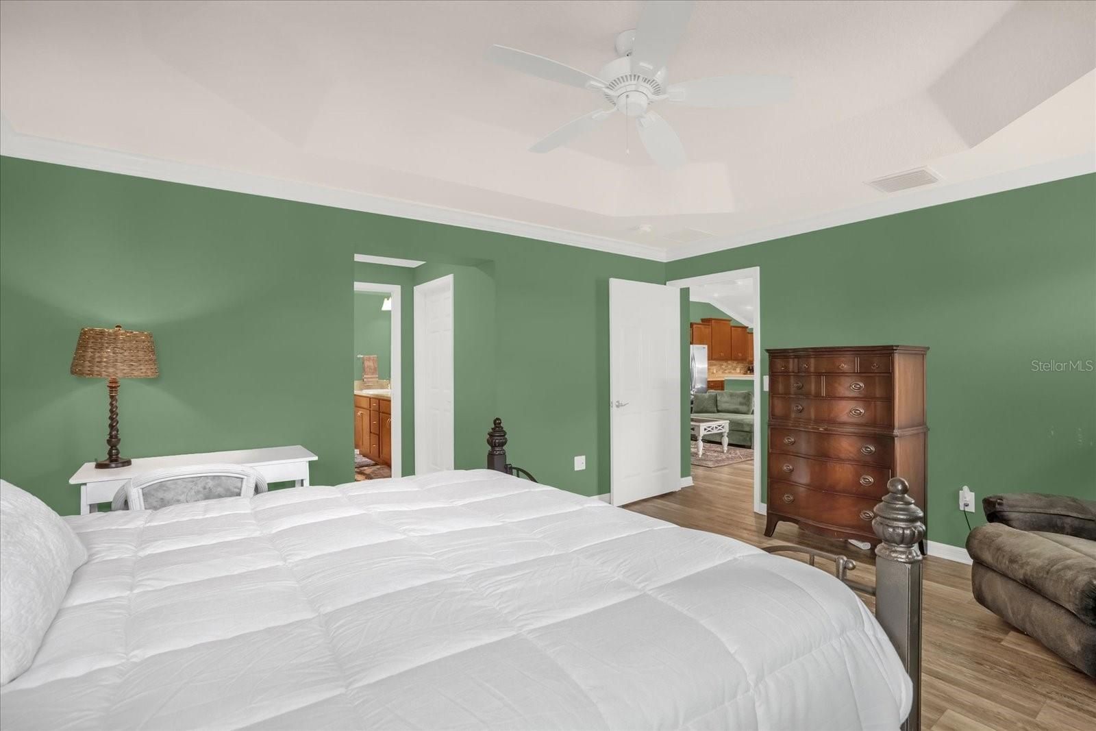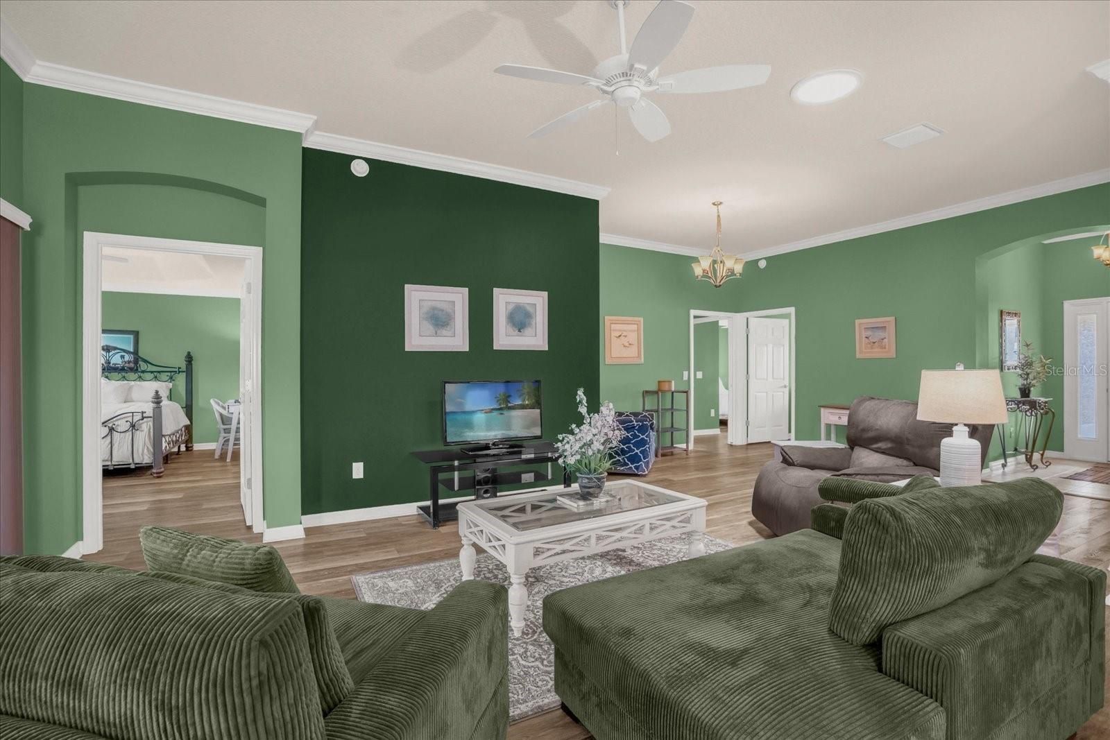 - Ceiling Fan(s), Crown Molding, Eat-in Kitchen, High Ceilings, Kitchen/Family Room Combo, Living/Dining Room, Open Floorplan, Main Level Primary, Split Bedrooms, Vaulted Ceiling(s), Walk-In Closet(s), Window Treatments