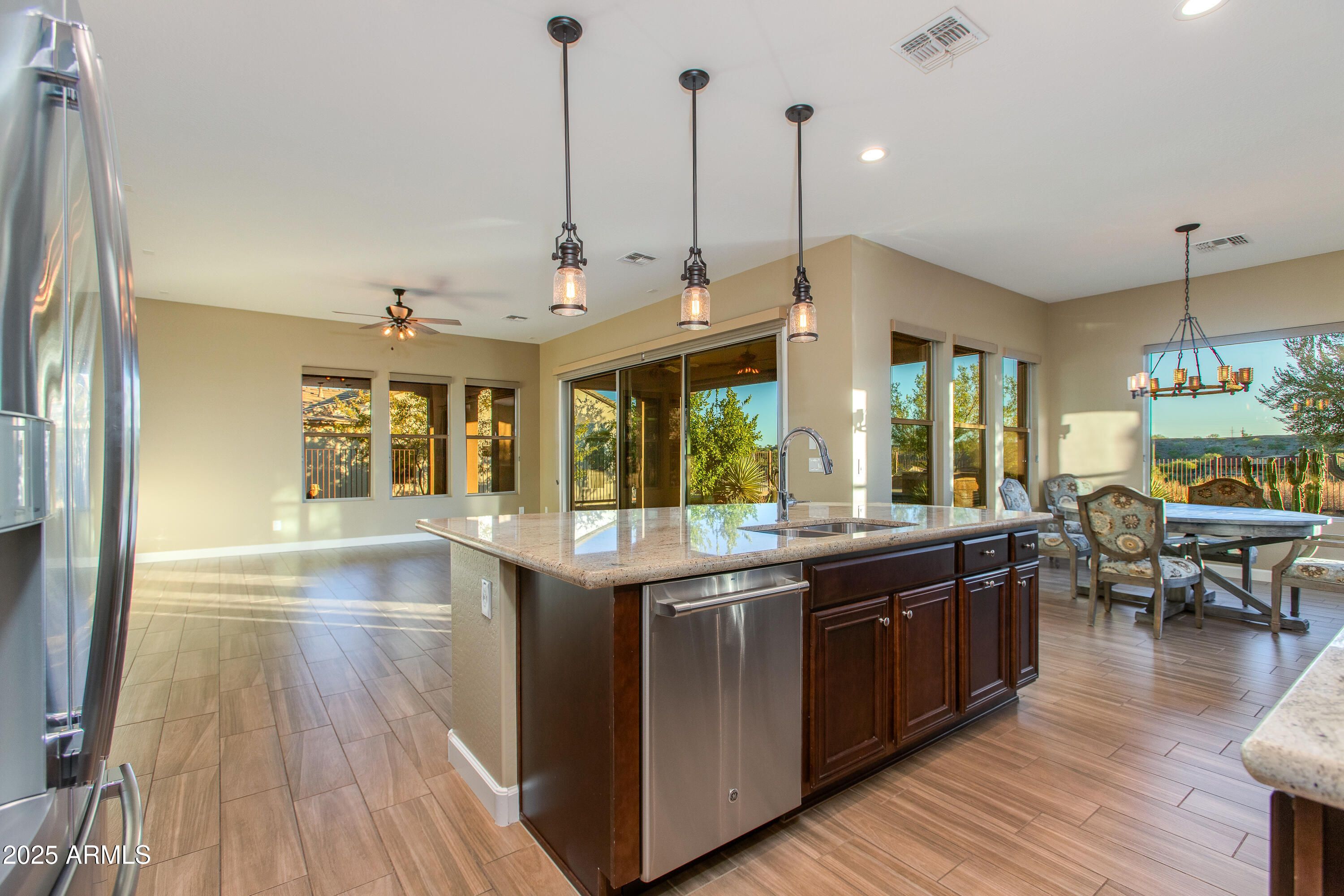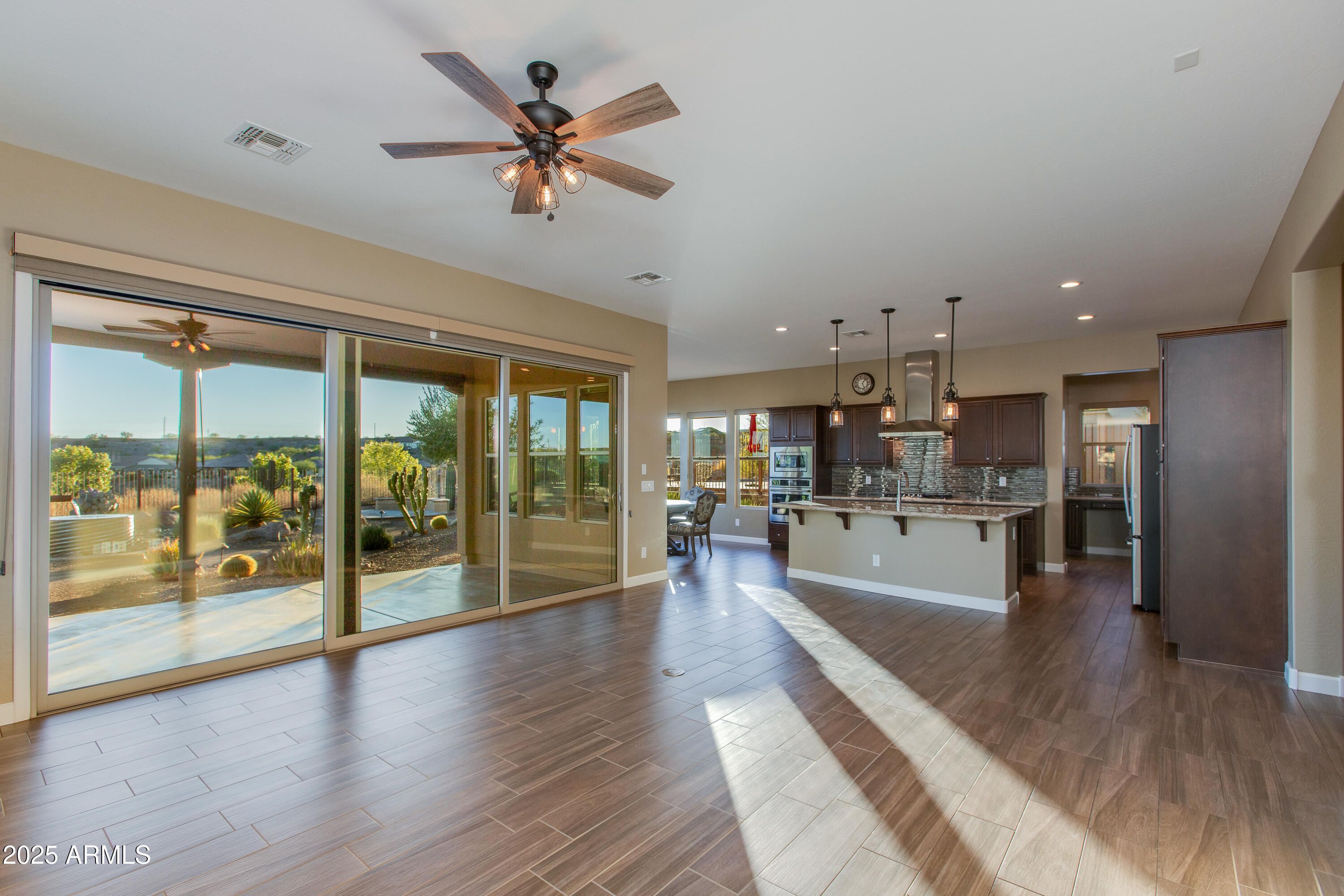 A stunning Brasada floor plan awaits you in the Sundance neighborhood of Wickenburg Ranch! Situated on an expansive lot with golf course views! 2,199 sq ft of absolute luxury! Seamless blend of indoor-outdoor living with 15 foot sliding glass wall in living room, extended patios, cozy firepit, custom water feature, and sweeping views of the high Sonoran desert. Inside, you'll find an open-concept layout with 2 bedrooms, den, and 2.5 baths. The gourmet kitchen is perfect for entertaining with a large island, granite counter tops, custom tile extended to bathrooms, stainless steel appliances, upgraded cabinetry. Escape it all in the private primary suite with a spa-inspired bathroom including a glass shower & oversized tub enclosure, including your private patio. Resort-amenities including golf, fitness, pool, spa, dining, and a vibrant social scene all within the secure, gated community of Wickenburg Ranch.