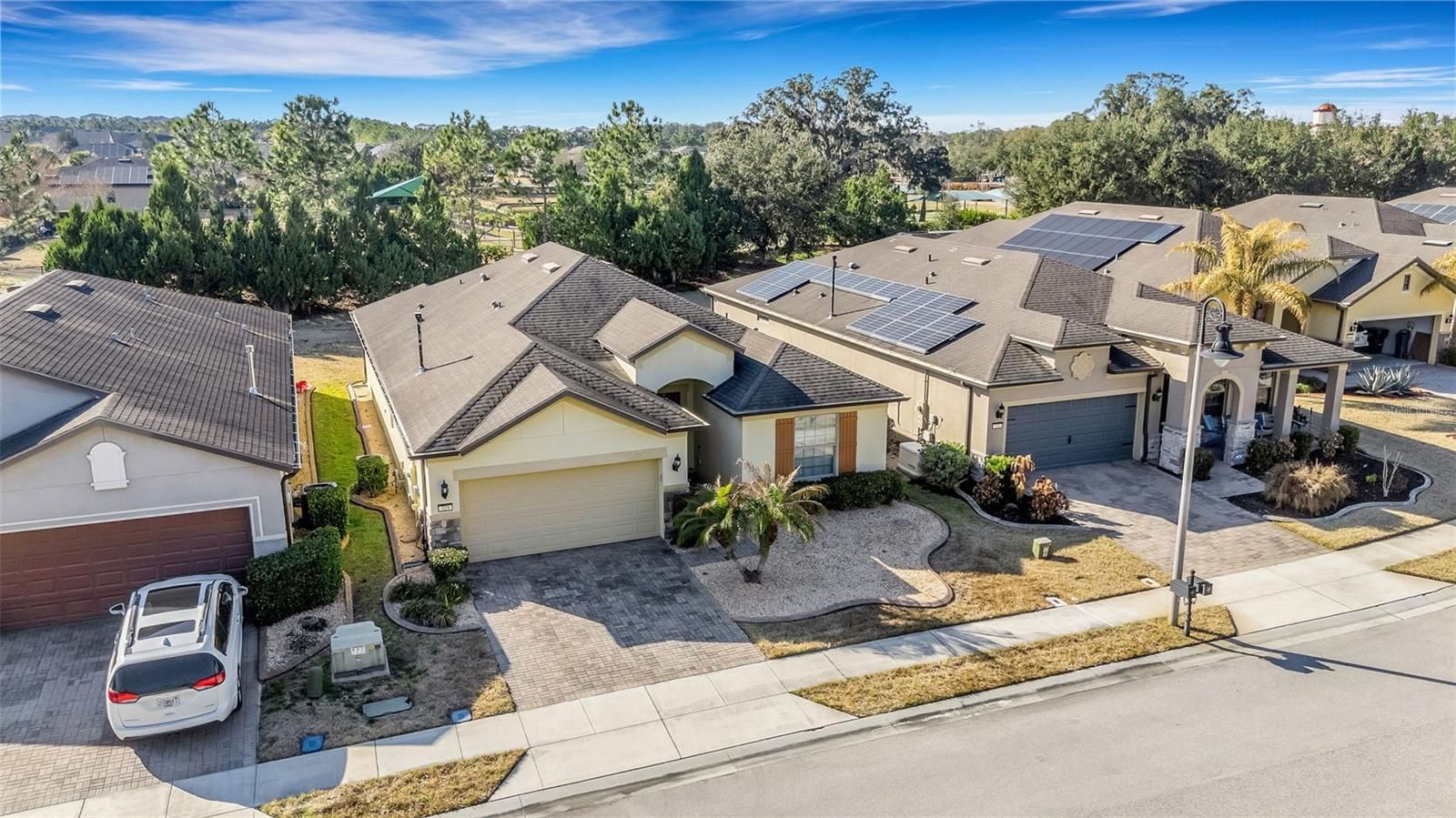 Located in the desired 55+ RESORT-STYLE community of Del Webb Orlando, this Summerwood floor plan that is conveniently located within walking distance to the Clubhouse has 3 bedrooms, 2 bathrooms, plus a den. The front entryway features an 8' decorative glass front door. Located in the front of the home are the two guest bedrooms complete with tile floors and the guest bathroom complete with a tiled shower with glass doors. The den/office is also located in the middle of the home and has glass French doors. The kitchen includes granite countertops, stainless steel appliances, including a NATURAL GAS range, built-in cabinet w/pullouts, backsplash, a large island for all your entertaining needs. The large master retreat is located in the rear of the home for owner privacy and features tile floors and a tray ceiling, a large tiled walk-in shower, double sinks, a linen closet and a large walk-in closet. From the great room you step through large sliding glass doors into a screened-in lanai with a beautiful tranquil view with no rear neighbors. The large laundry room has cabinets for extra storage and a utility sink. The two car garage is outfitted with epoxy floors and pull-down stairs to over-garage attic space. Located near the resident-only secondary gate, this home also features easy access to the community. The $425 semi-annual HOA fee provides 24x7 staffed security gate and master association-owned private road maintenance. Adjacent to recently renovated 18-hole White Heron Golf Club. The $282 monthly Del Webb HOA fee includes exclusive access to resident-owned 30,000+ SF Montecito clubhouse and amenities. DEL WEBB ORLANDO is a 55+ community with a tavern, indoor walking track, fitness center, indoor and outdoor pools and spas with locker rooms and showers, billiards, ping pong, craft room, and a ballroom for special events. Outdoor activities include pickleball, tennis, bocce, basketball, shuffleboard, community gardening center, an outdoor amphitheater, large brick fire pit and large screened-in gazebo over the water. Miles of biking and walking trails within Ridgewood Lakes gated community. Located conveniently to shopping at Posner Park (4 miles), Disney World, Universal Studios, Orlando & Central FL entertainment nearby. Easy access to I-4, medical facilities, airports & Sunrail Station. Advent Health hospital is 3 miles away