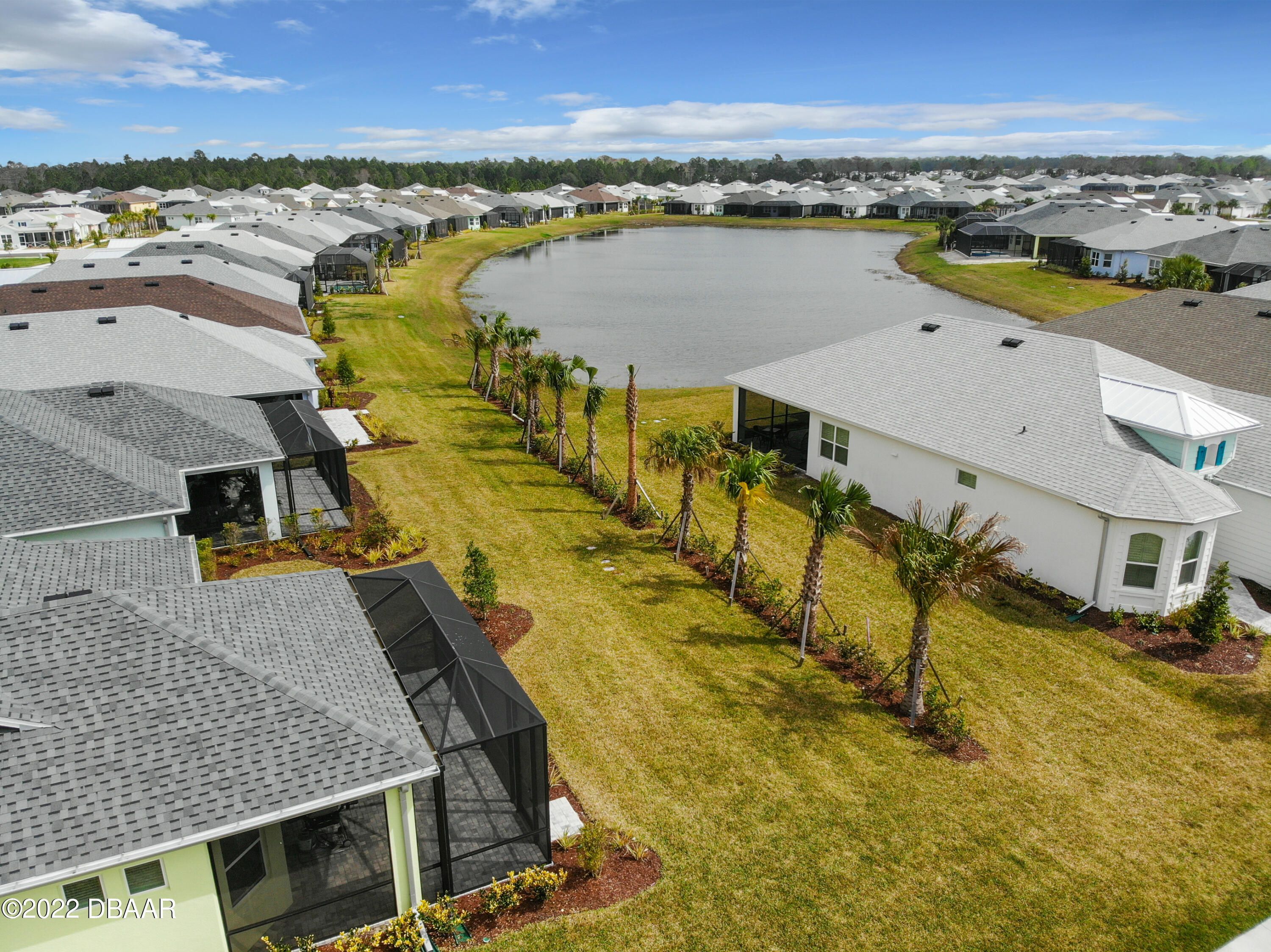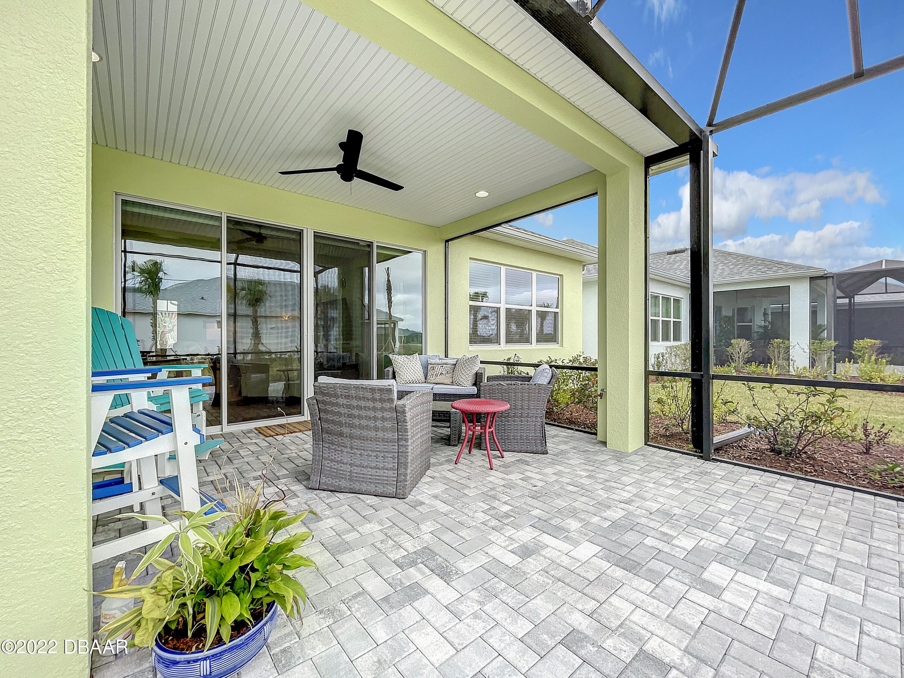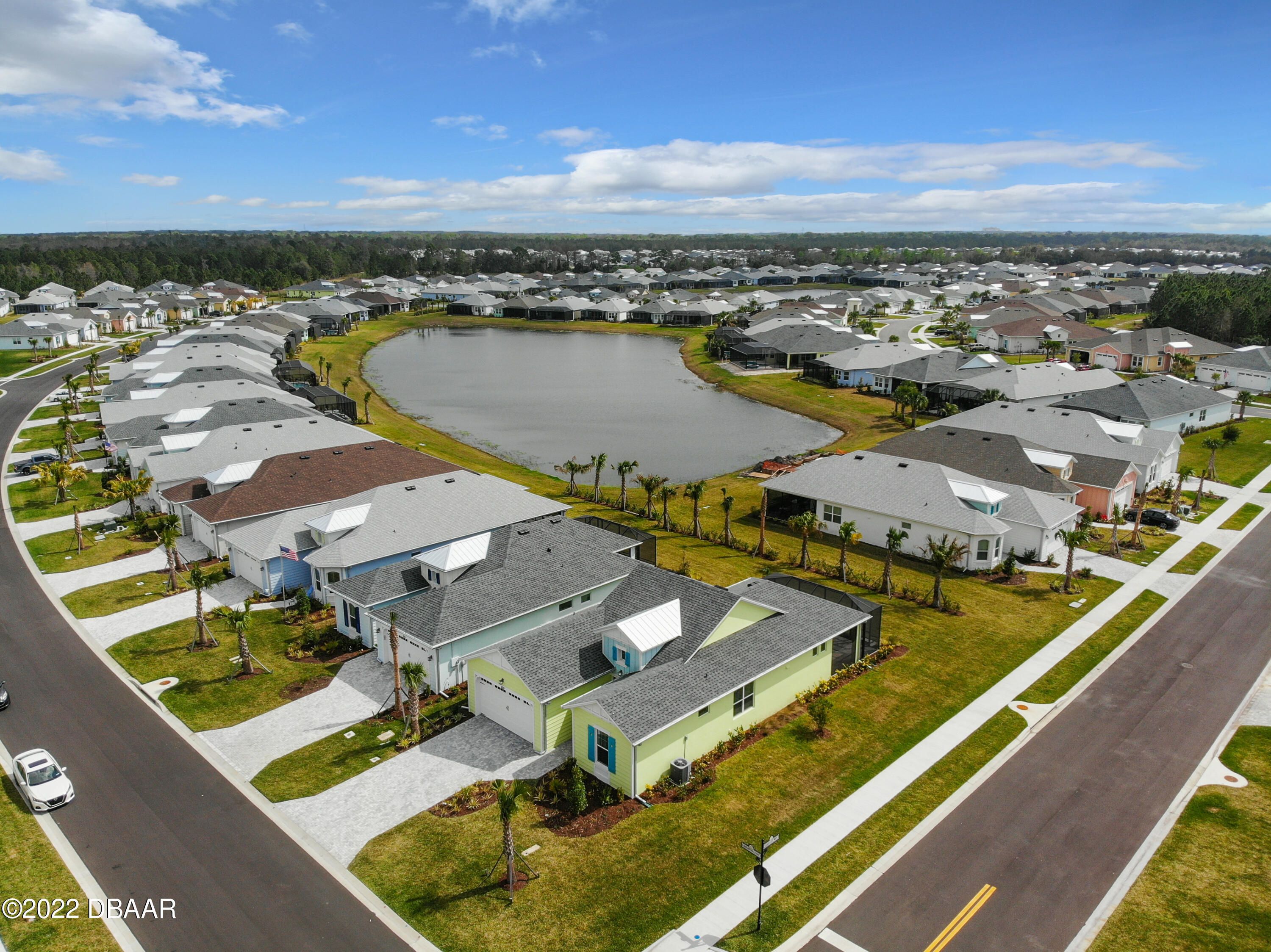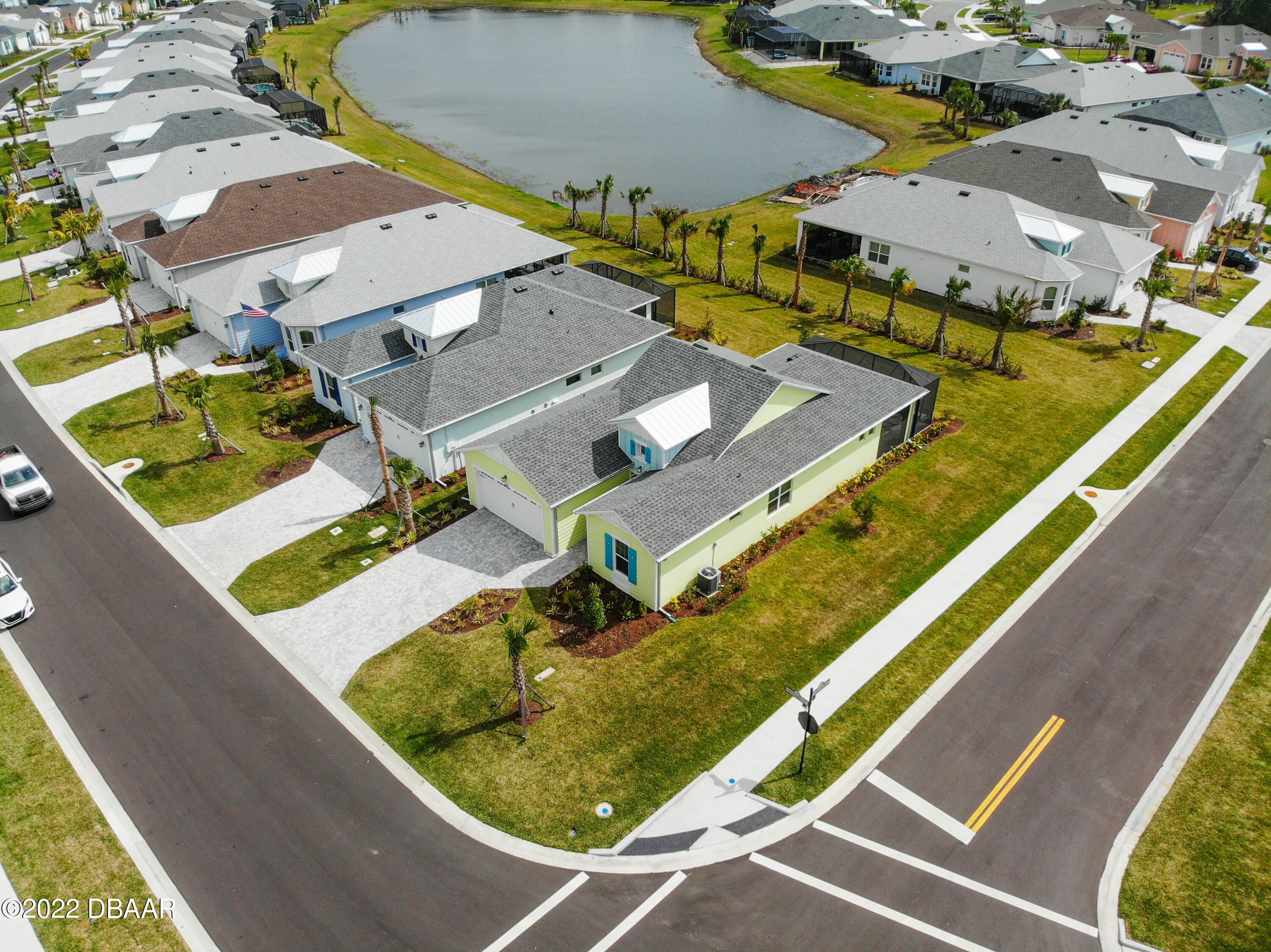 If you love the Coconut Model Home, you'll do a double take on this one. Enjoy a popular corner lot with a sunrise water view in the coveted Margaritaville community where you pack your bags and start living your best life. Beams in great room and primary, custom shiplap and crown molding throughout. Whole house blinds. Pocket doors, custom paint & shiplap accents. 42'' white softclose crown molded kitchen cabinets, Quartz countertops, Kitchen Aid appliances, gas range,built in refrigerator cabinet, glass tile backsplash, single sink, under cabinet lighting. Extended screened lanai with a single motorized single shade with gas drop and ready for a hot tub. Utility sink in garage, humidity control HVAC, upgraded tankless Instant Hot Water, Mohawk Wood Flooring throughout. Alexa/wifi Ecobee temp control with music. Amenities include a private Beach Club, Resort-Style Pool, Pickleball Courts, Bandshell, Gym, Indoor Lap Pool, Hot Tub, Theatre, Pottery and Woodworking rooms.