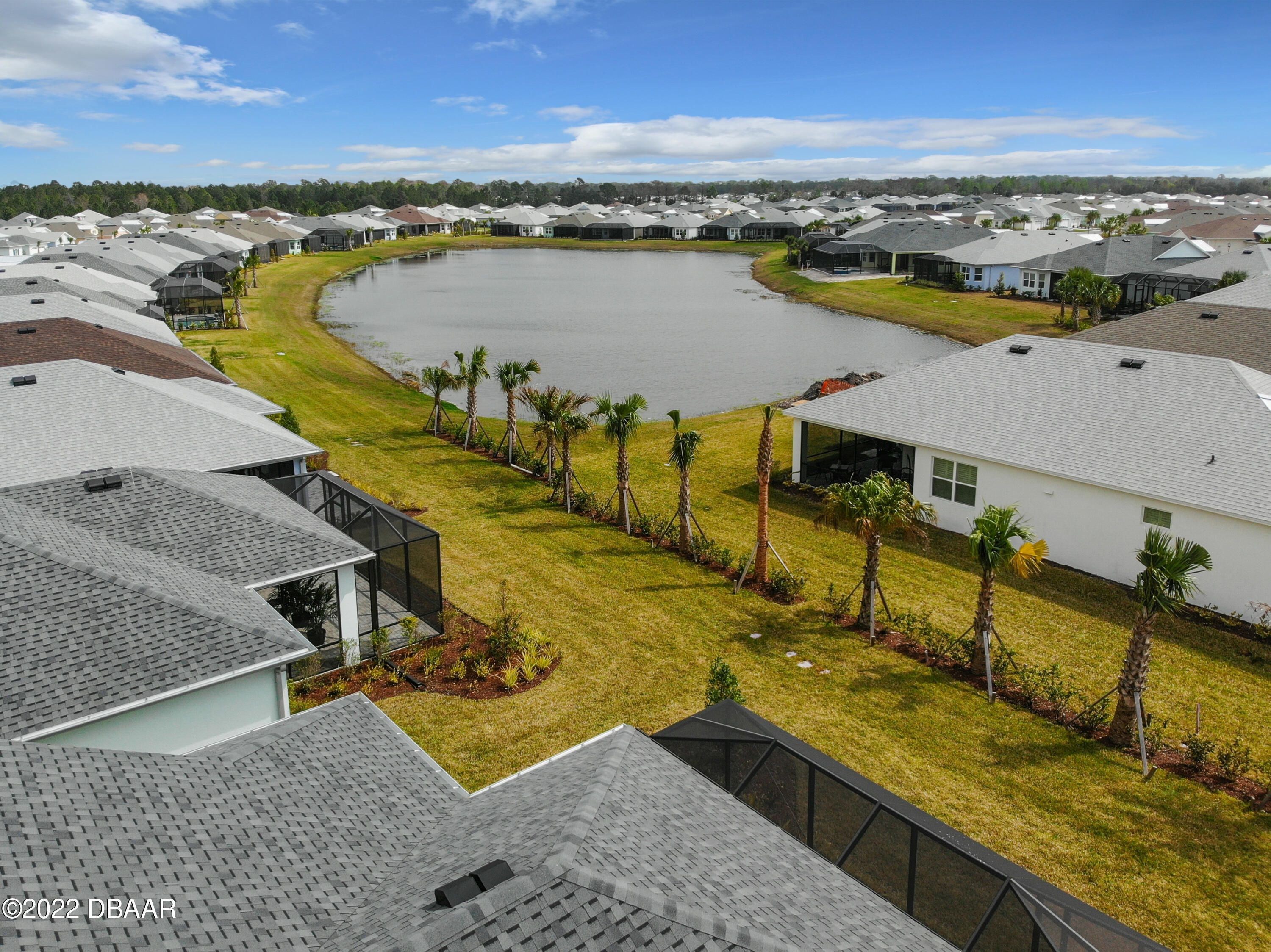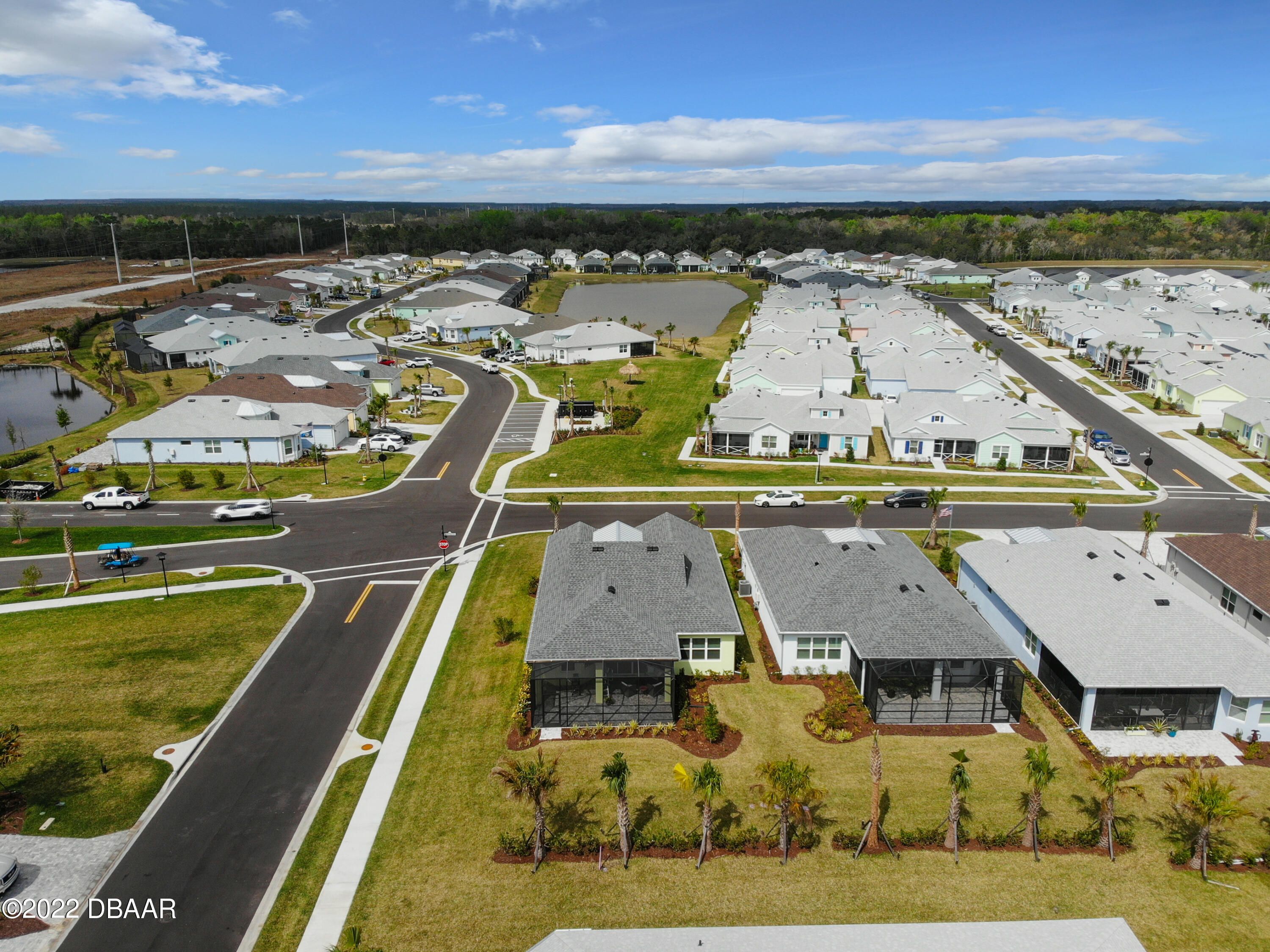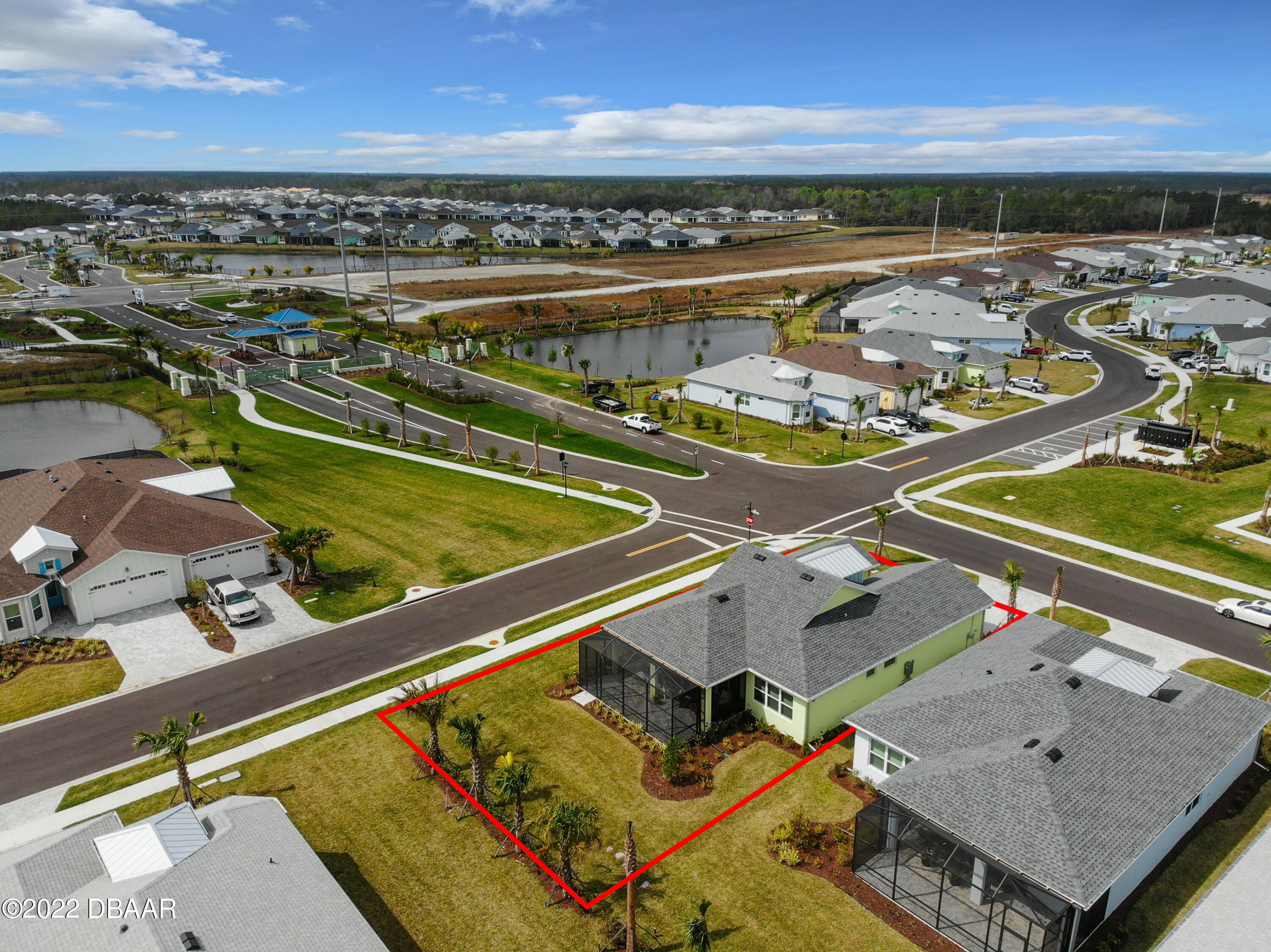 If you love the Coconut Model Home, you'll do a double take on this one. Enjoy a popular corner lot with a sunrise water view in the coveted Margaritaville community where you pack your bags and start living your best life. Beams in great room and primary, custom shiplap and crown molding throughout. Whole house blinds. Pocket doors, custom paint & shiplap accents. 42'' white softclose crown molded kitchen cabinets, Quartz countertops, Kitchen Aid appliances, gas range,built in refrigerator cabinet, glass tile backsplash, single sink, under cabinet lighting. Extended screened lanai with a single motorized single shade with gas drop and ready for a hot tub. Utility sink in garage, humidity control HVAC, upgraded tankless Instant Hot Water, Mohawk Wood Flooring throughout. Alexa/wifi Ecobee temp control with music. Amenities include a private Beach Club, Resort-Style Pool, Pickleball Courts, Bandshell, Gym, Indoor Lap Pool, Hot Tub, Theatre, Pottery and Woodworking rooms.