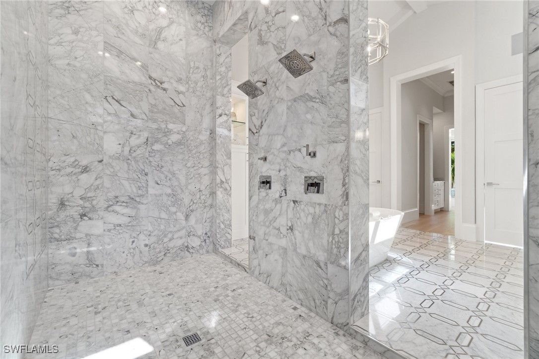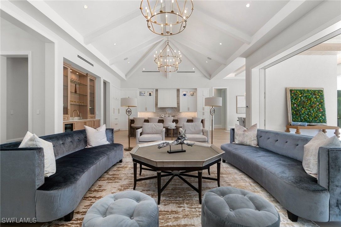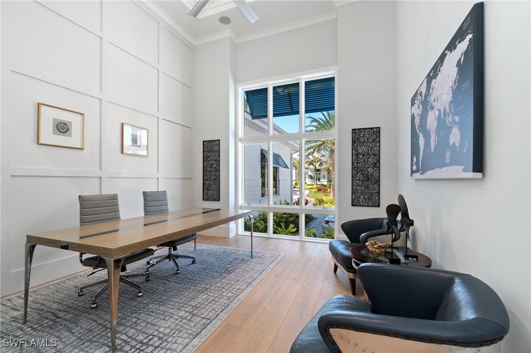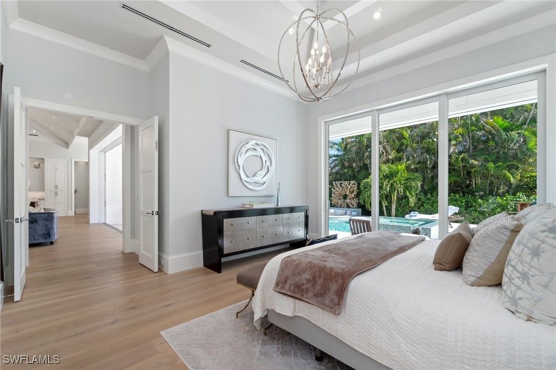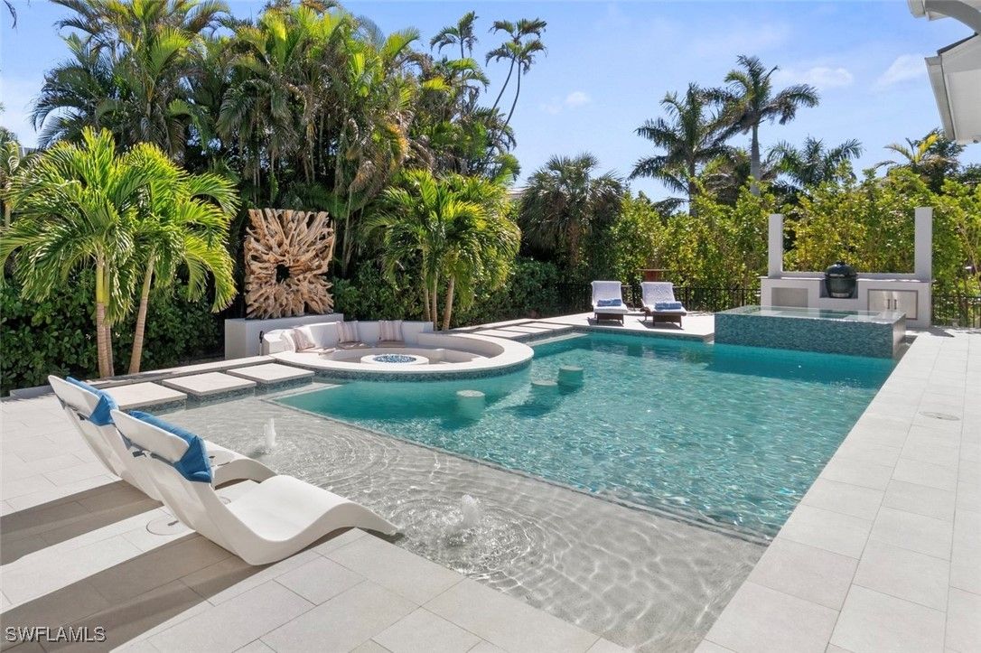 Modern Coastal Luxury Meets Biophilic Design in The Moorings — Minutes from Downtown Naples and the Beach Experience refined coastal living in this custom Borelli-built estate home that masterfully blends modern elegance, natural elements, and indoor-outdoor living. This 4,314-square-foot single-story residence was designed with a meticulous focus on biophilic design, seamlessly connecting the beauty of nature with sophisticated architectural detail. From the moment you enter through the grand double entry doors, your eyes are drawn through the open-concept living area to an outdoor entertainment oasis featuring a stunning 6-foot driftwood sculpture suspended over a sunken circular lounge with a fire pit and swim-up bar, flowing effortlessly into a resort-style pool and spa. Inside, you’ll find washed oak hardwood floors, soaring detailed ceilings, and luxury finishes throughout. The open-concept floor plan connects a chef-inspired kitchen—featuring Taj Mahal quartzite countertops, Sub-Zero and Wolf appliances, custom wood cabinetry, and a walnut wet bar—to elegant living and dining spaces perfect for both intimate gatherings and grand entertaining. This 4-bedroom + office + media OR 5 bedroom + den/flex room residence includes five full designer bathrooms. The media room with its custom built-in bar creates a stylish retreat for movies or game nights. The primary suite is a true sanctuary, offering dual custom walk-in closets, a soaking tub, oversized walk-in shower with dual shower heads, and two private water closets. Designed for the Naples lifestyle, the outdoor living area extends over 650 sq. ft. of covered space and includes a summer kitchen with grill and Green Egg station, electric roll-down screens, outdoor shower, and a fully fenced backyard surrounded by mature tropical landscaping. The southeast rear exposure ensures ideal sunshine over the pool during winter months. Additional upgrades include: • Crestron smart home automation • Generator (on order) • Integrated security and sound system • Two tankless water heaters • Electric roll down hurricane shutters • Split three-car garage with epoxy floors Located just minutes from 5th Avenue South, 3rd Street South, and Naples’ white sand beaches, this home offers private beach access through the optional Moorings Beach Park Association. Enjoy an unparalleled Naples lifestyle—morning walks on the beach, afternoons by the pool, and evenings dining in the heart of downtown. Whether you’re seeking a second home in Naples or planning a full-time relocation from the Midwest or Northeast, this residence delivers the perfect balance of sophistication, comfort, and coastal serenity.